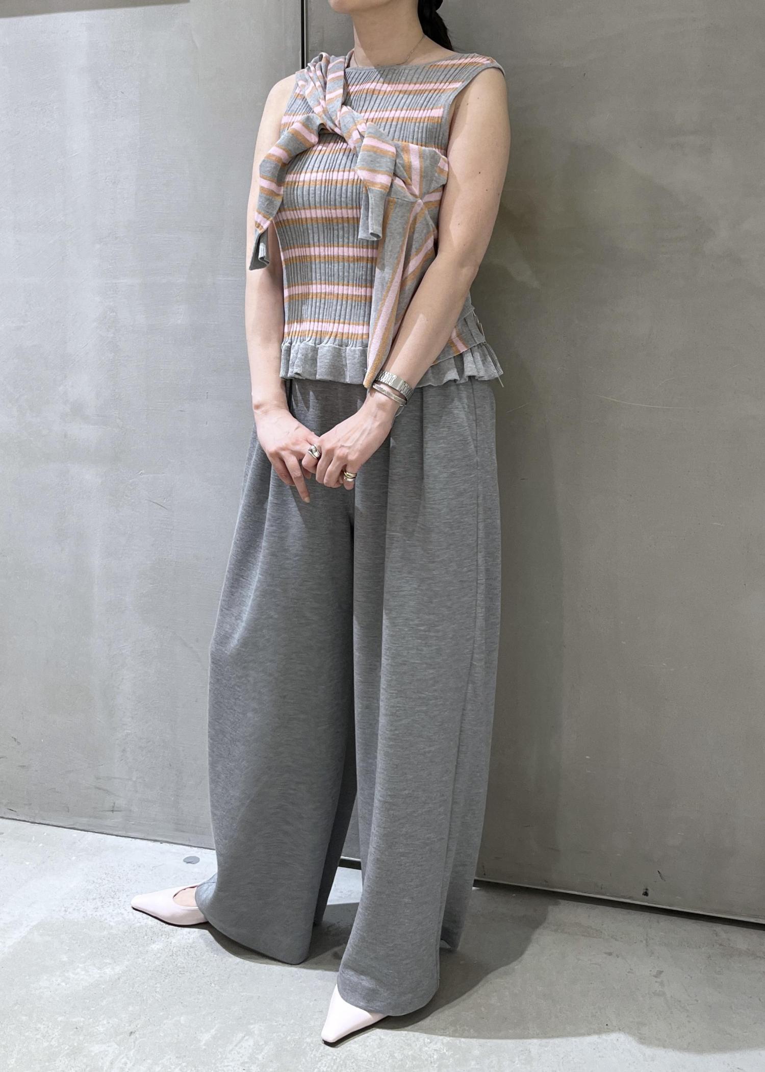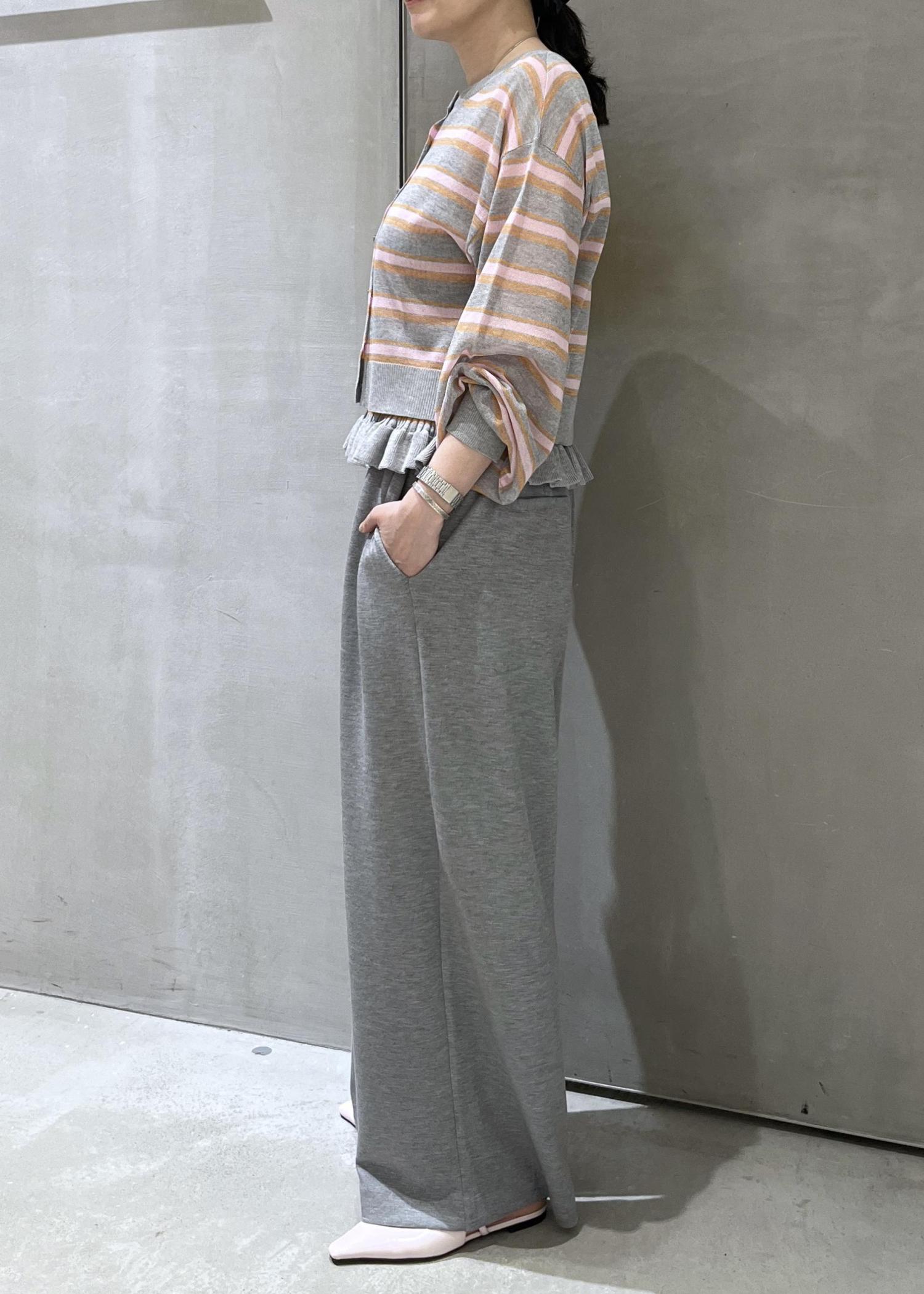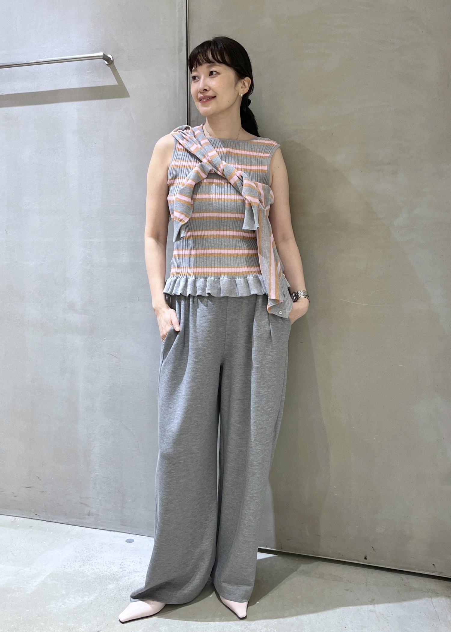 ボトムのダンボールニットのパンツも楽な履き心地で、今から秋まで活躍のアイテム!
