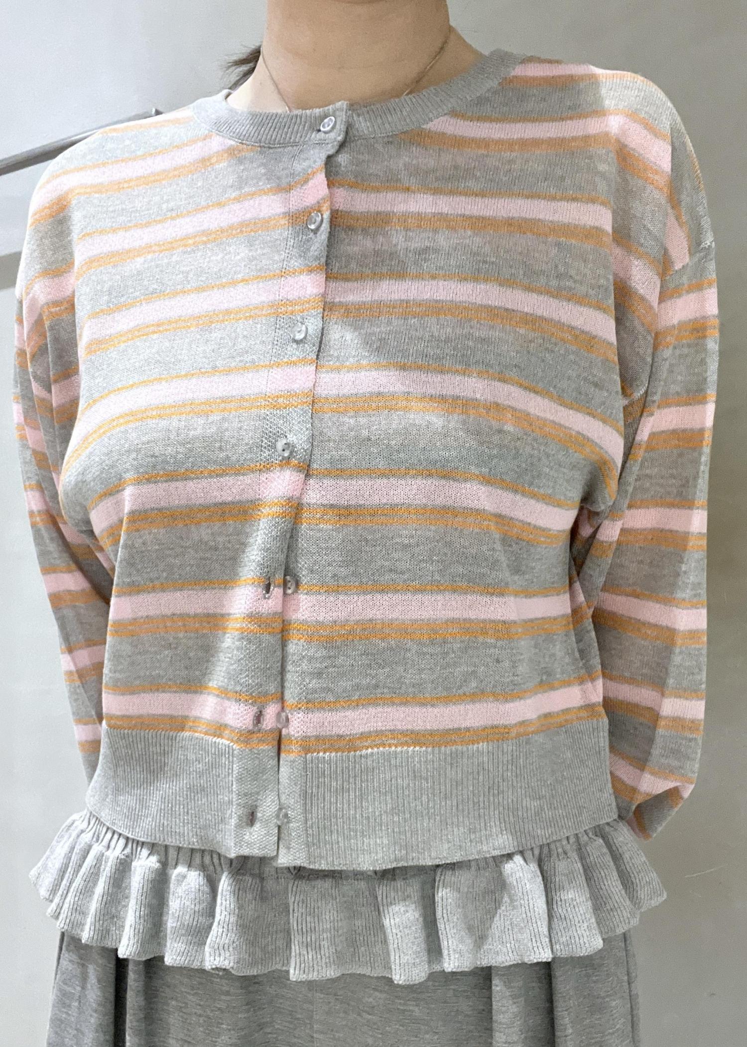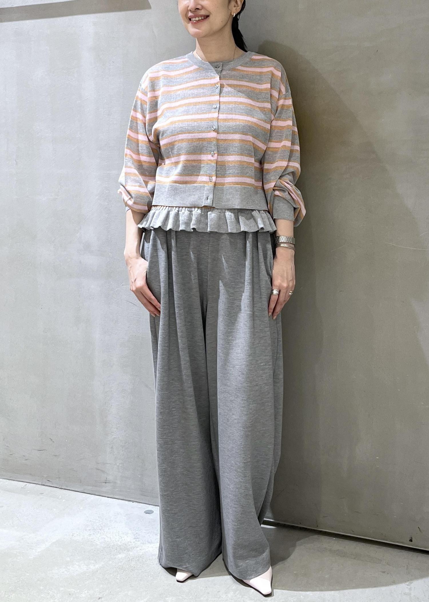 LE CERCLE par ropéフリルアンサンブルグレー系 / F¥9,790レビューシャリ感ある素材で、まだ暑さの残る時期でも着用いただけます。カーディガンは短め丈でタンクトップとアンサンブルで着用の場合、裾からフリルが覗くようなデザインになっています。