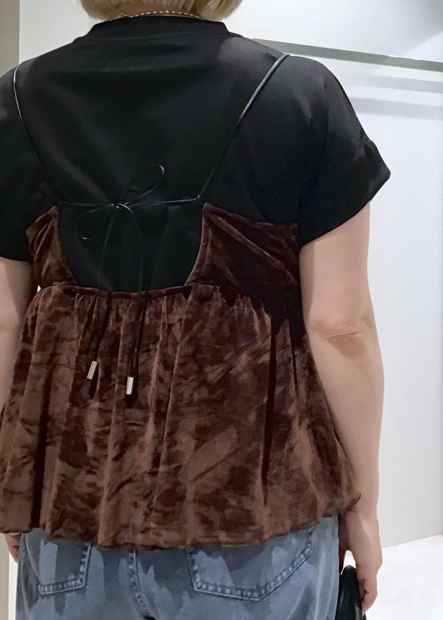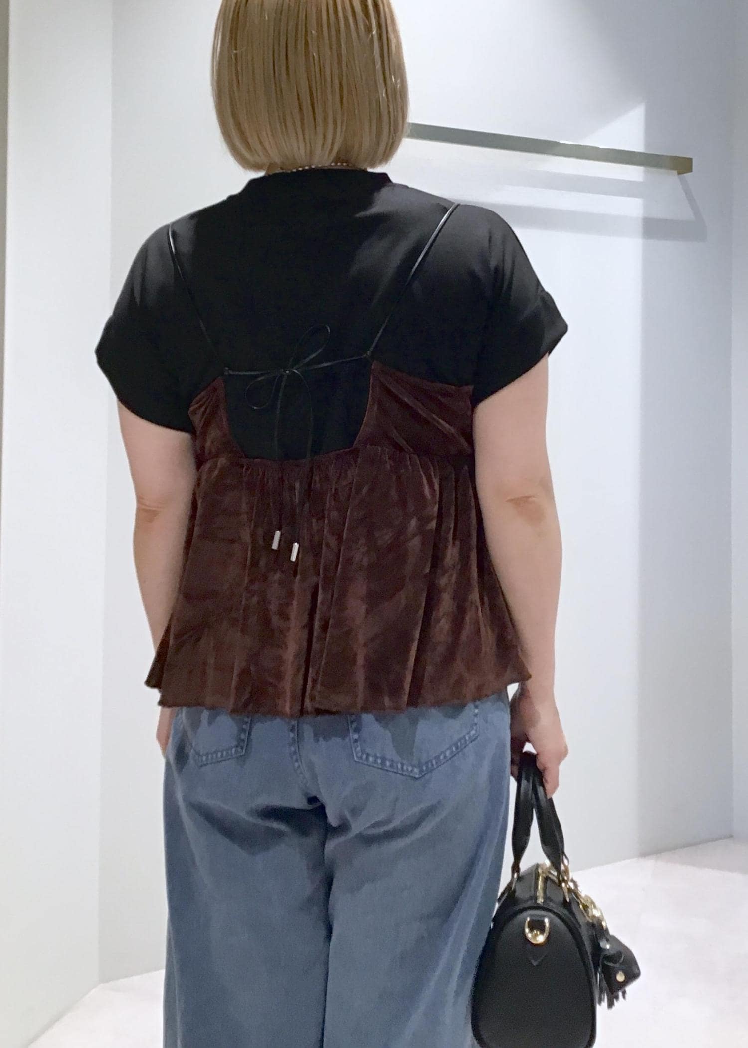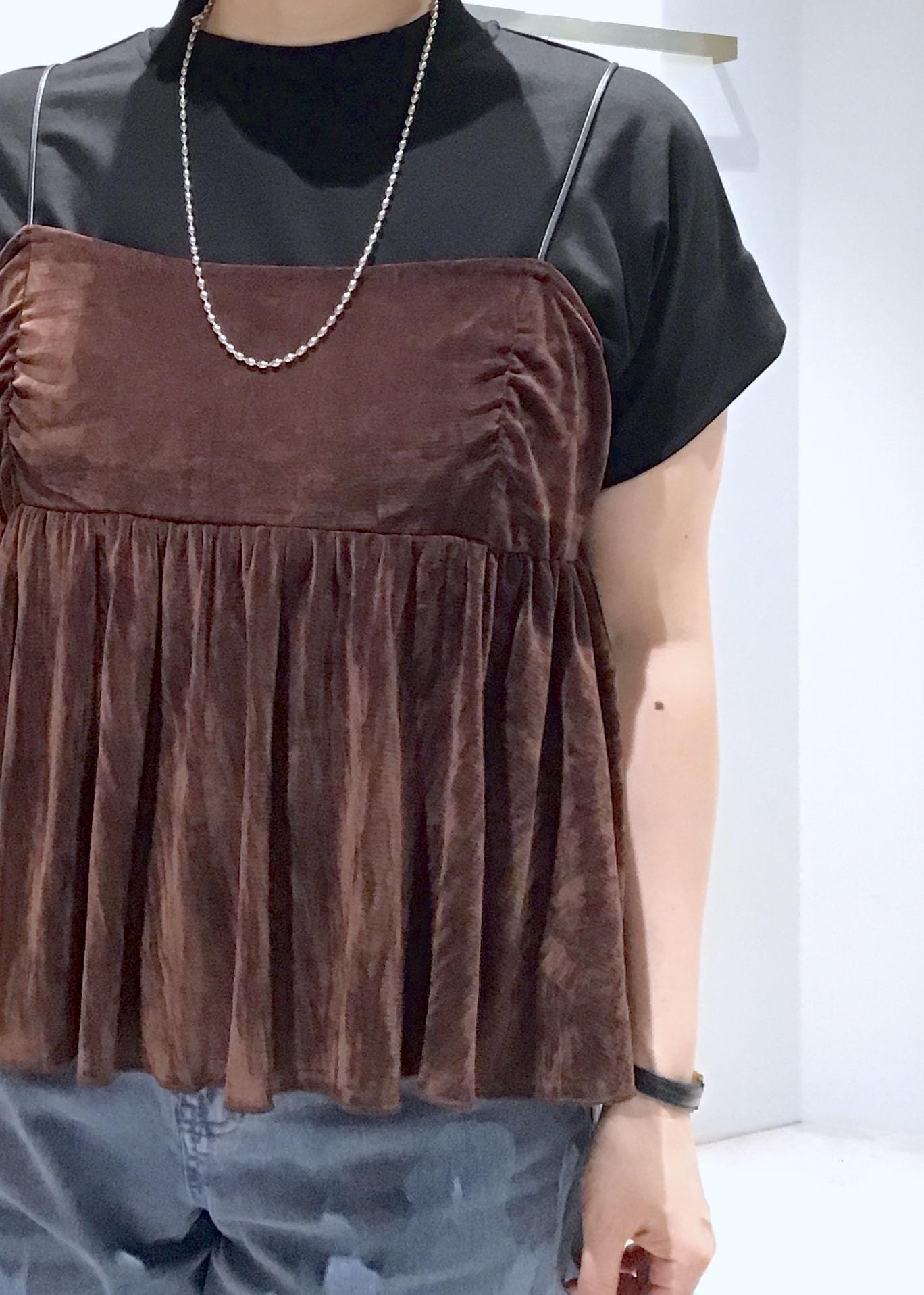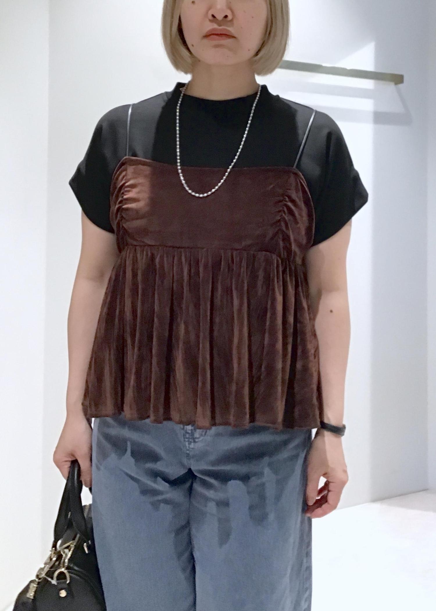 トレンドのベロア素材のキャミソールは、インナーを変えて長く楽しんでいただけますよ。