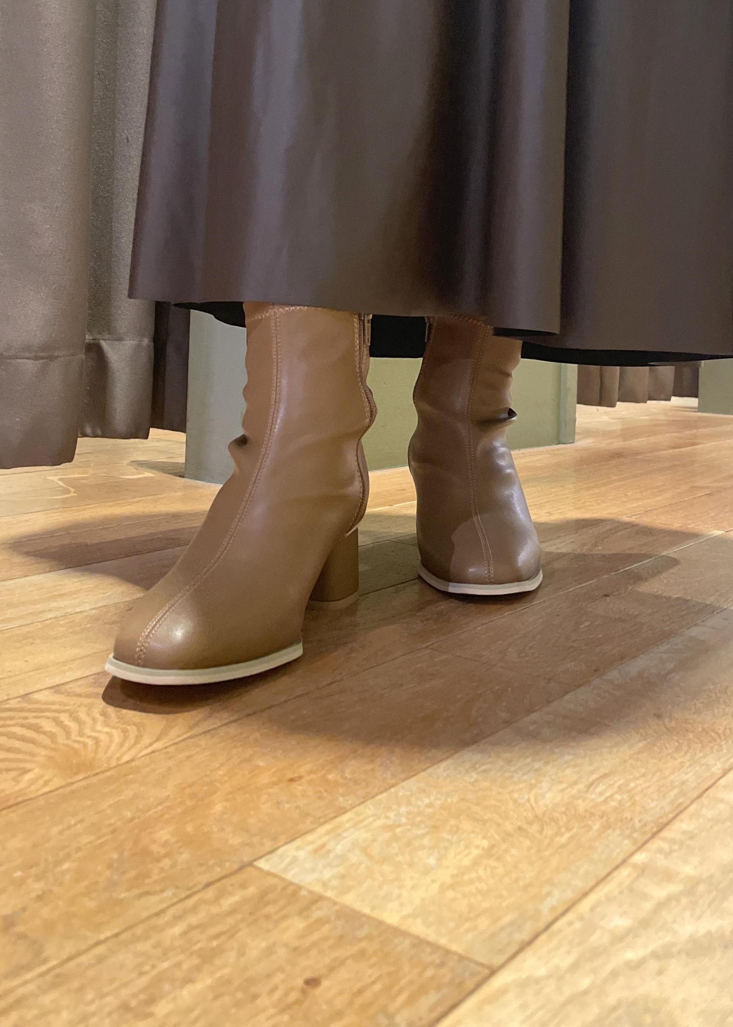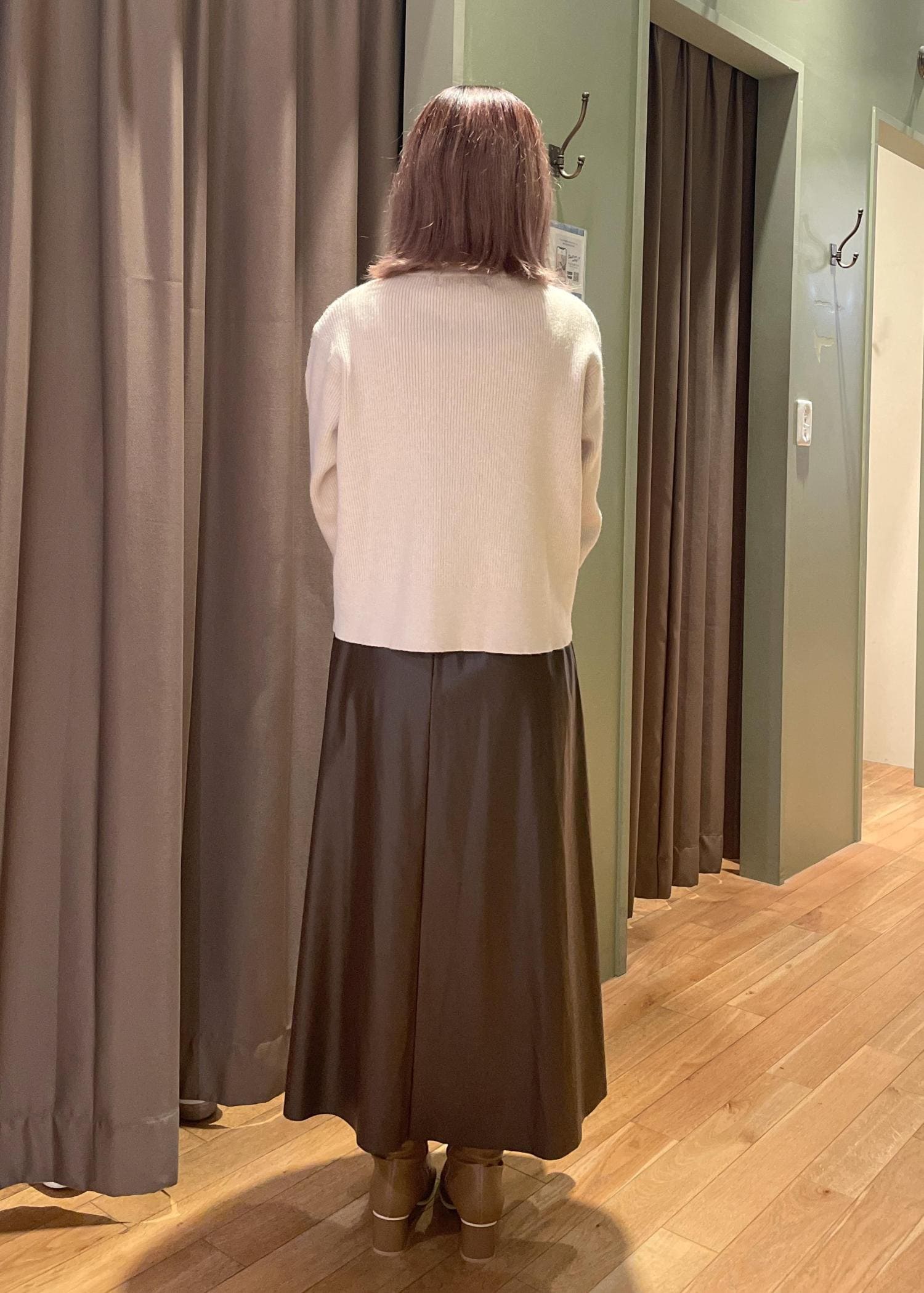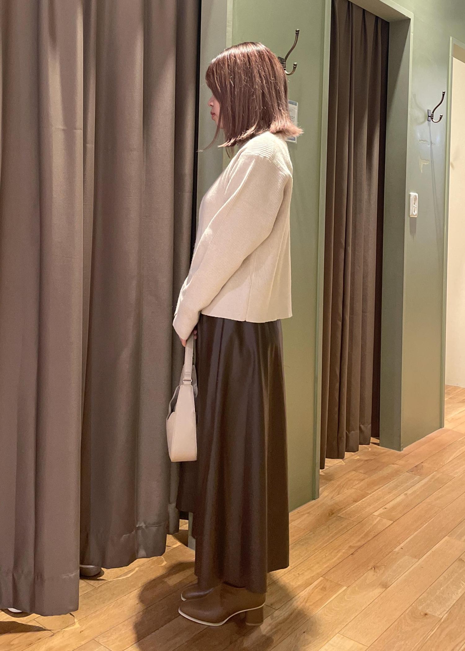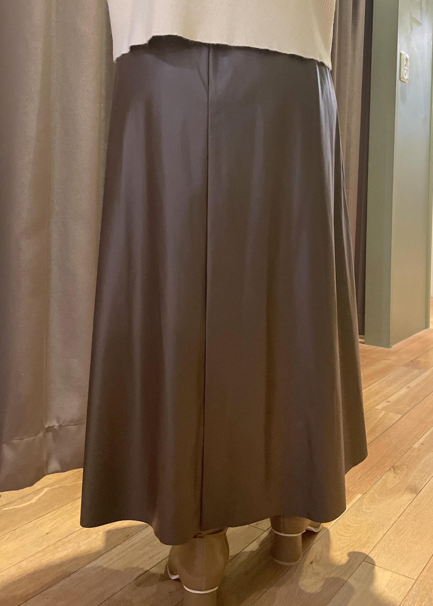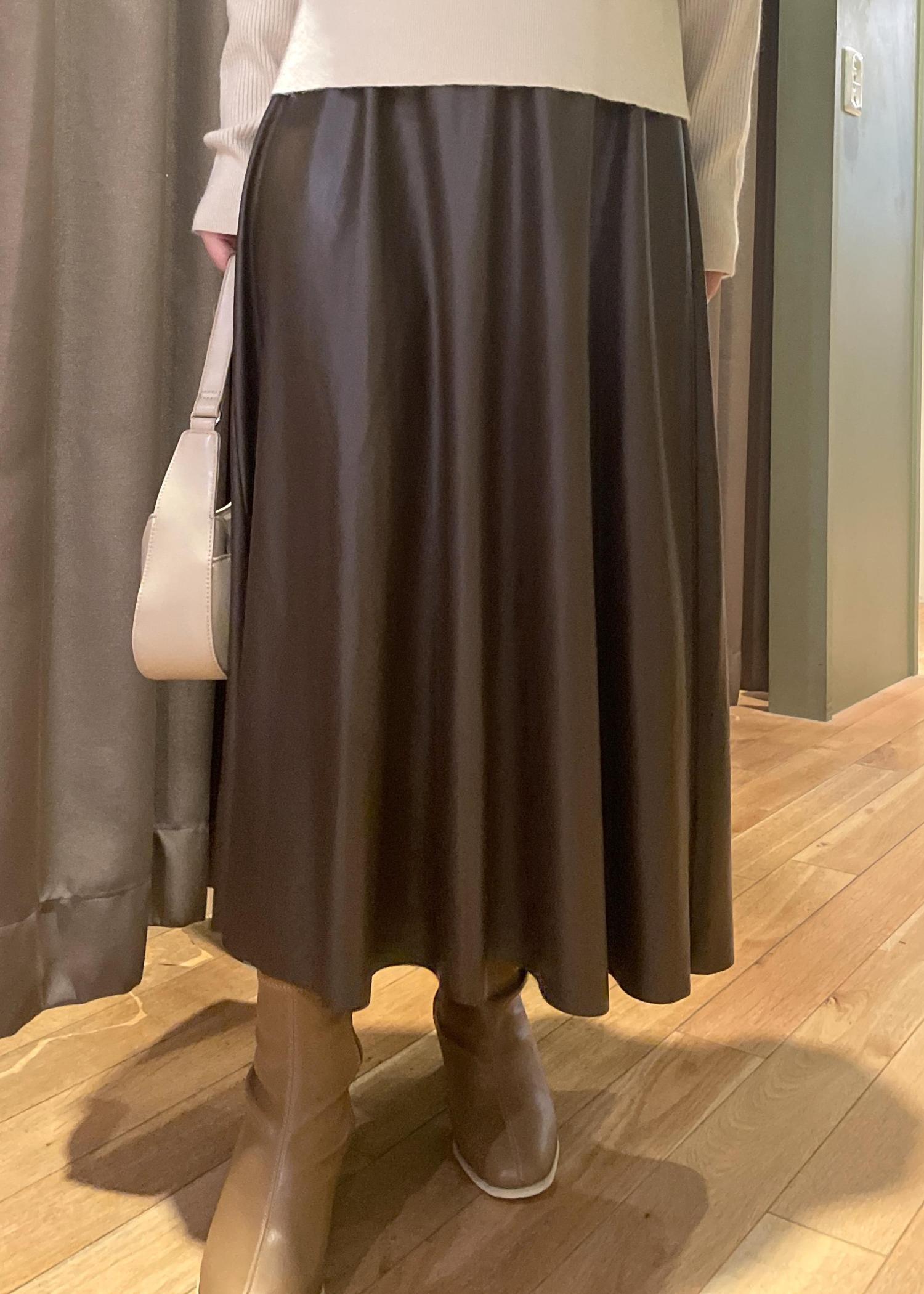【シンセティックレザーフレアロングスカート】はブラウンのシンセティックレザーを用いたフレアスカートで、素材感を生かしたシンプルなデザインが特徴です!