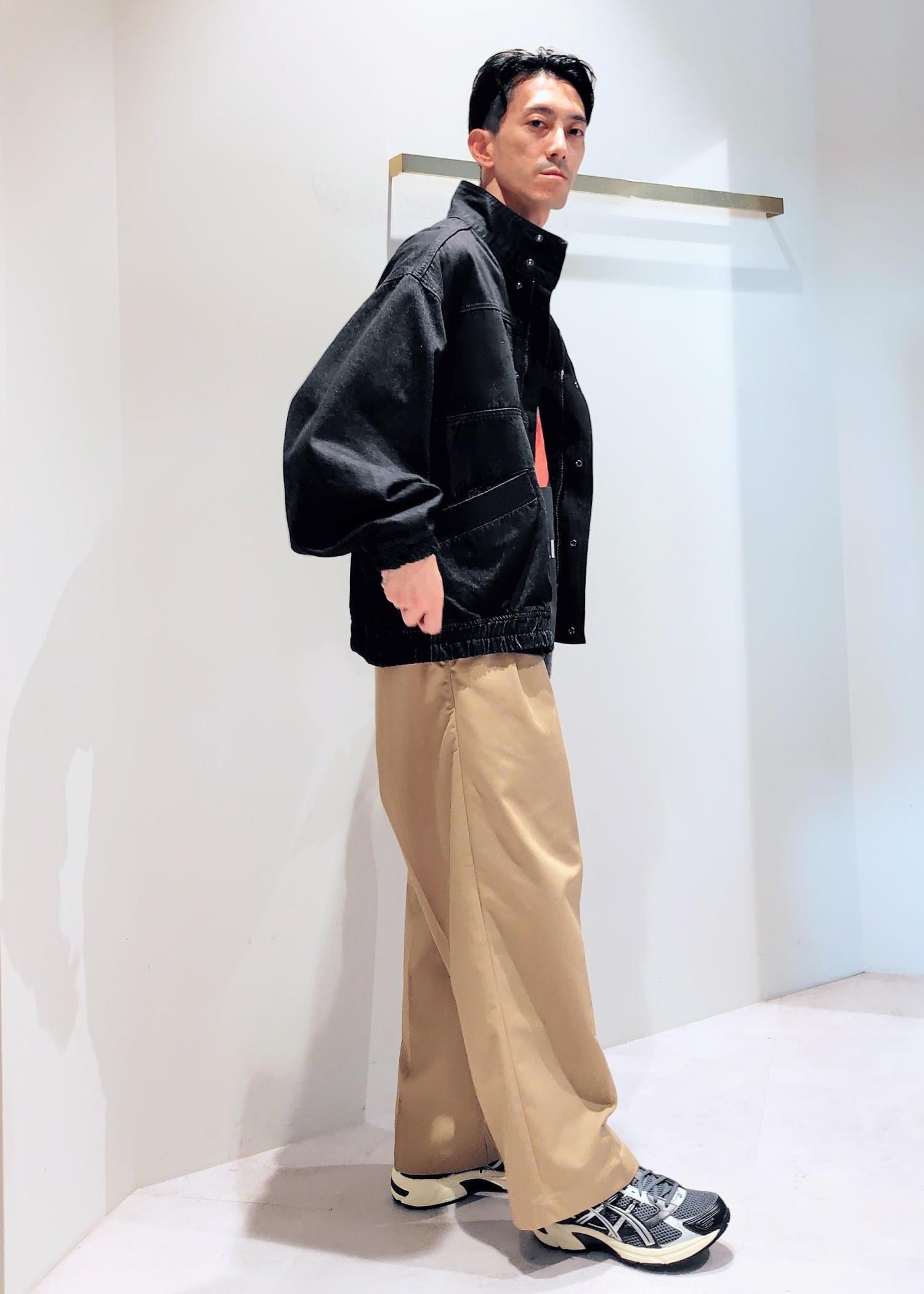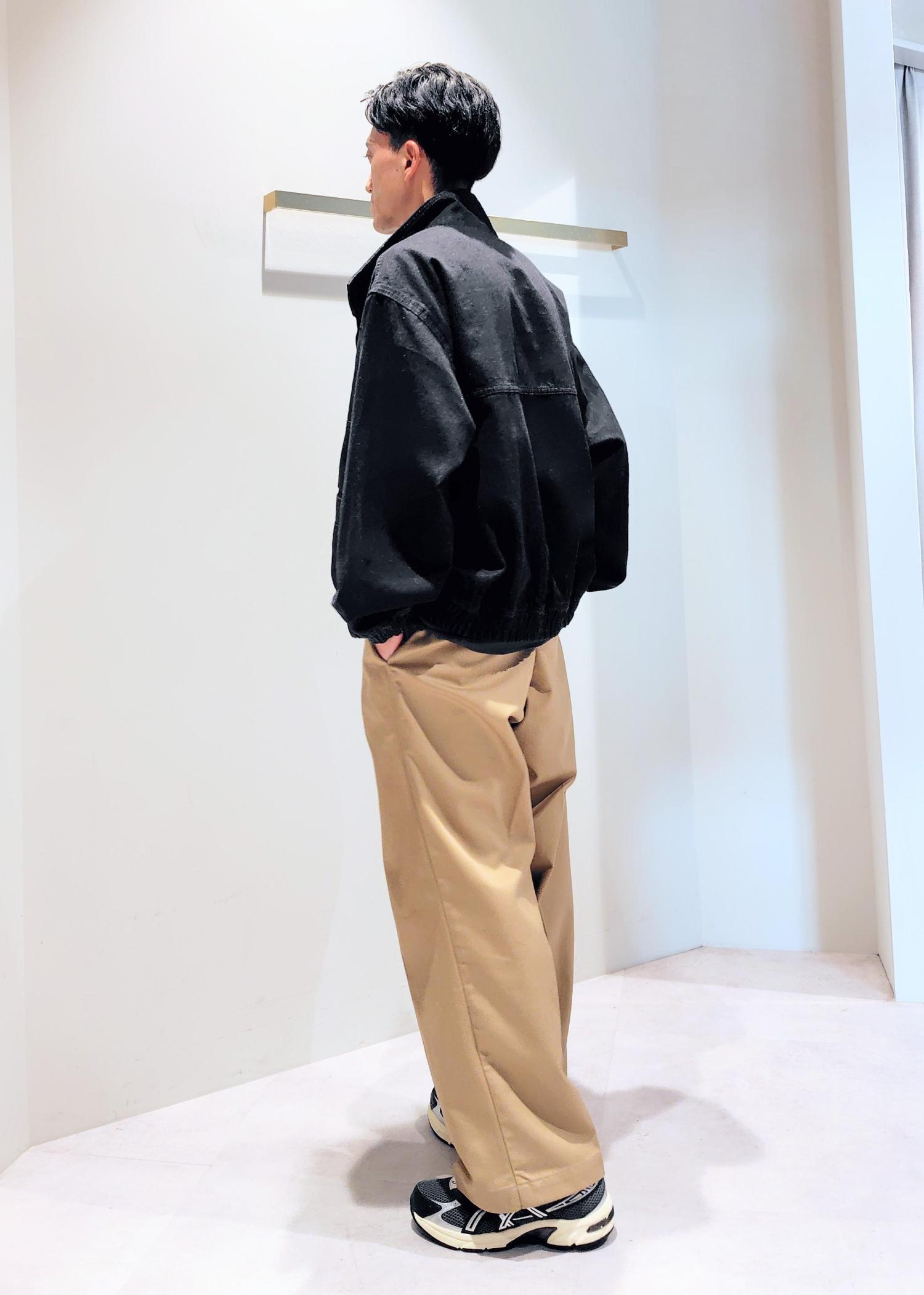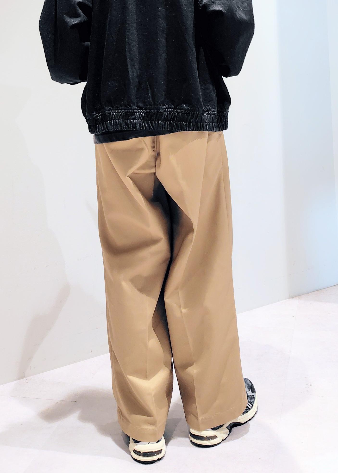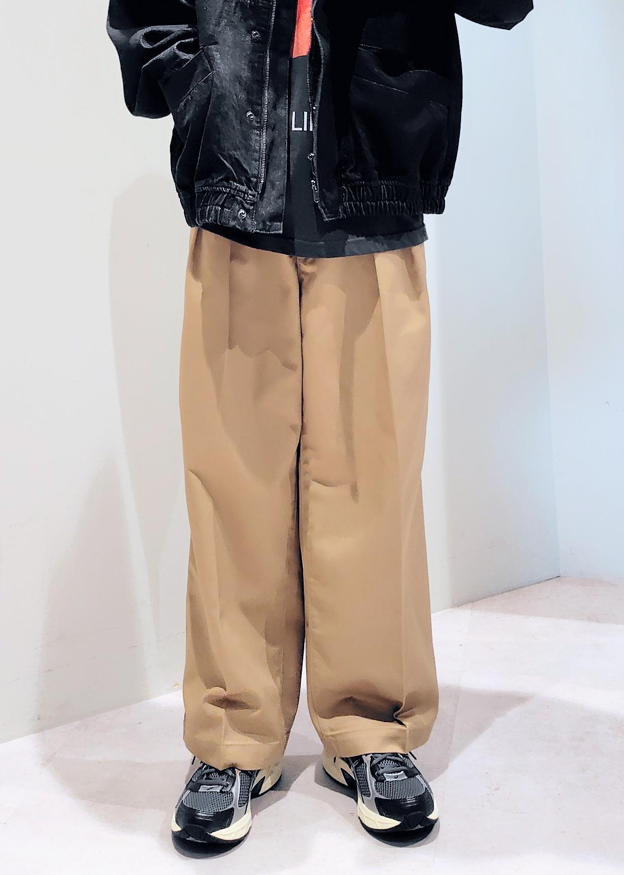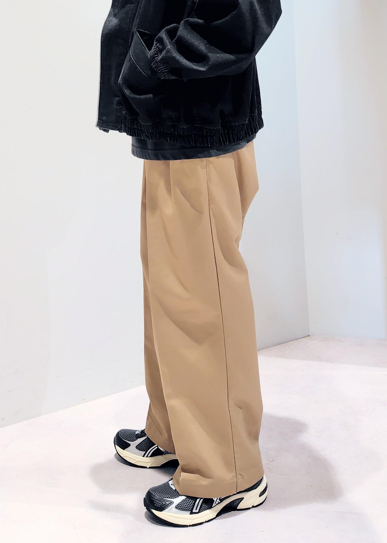 センタープレス入りのワイドストレート型パンツで2タックが深めに入っていることでよりルーズさが強調されています。