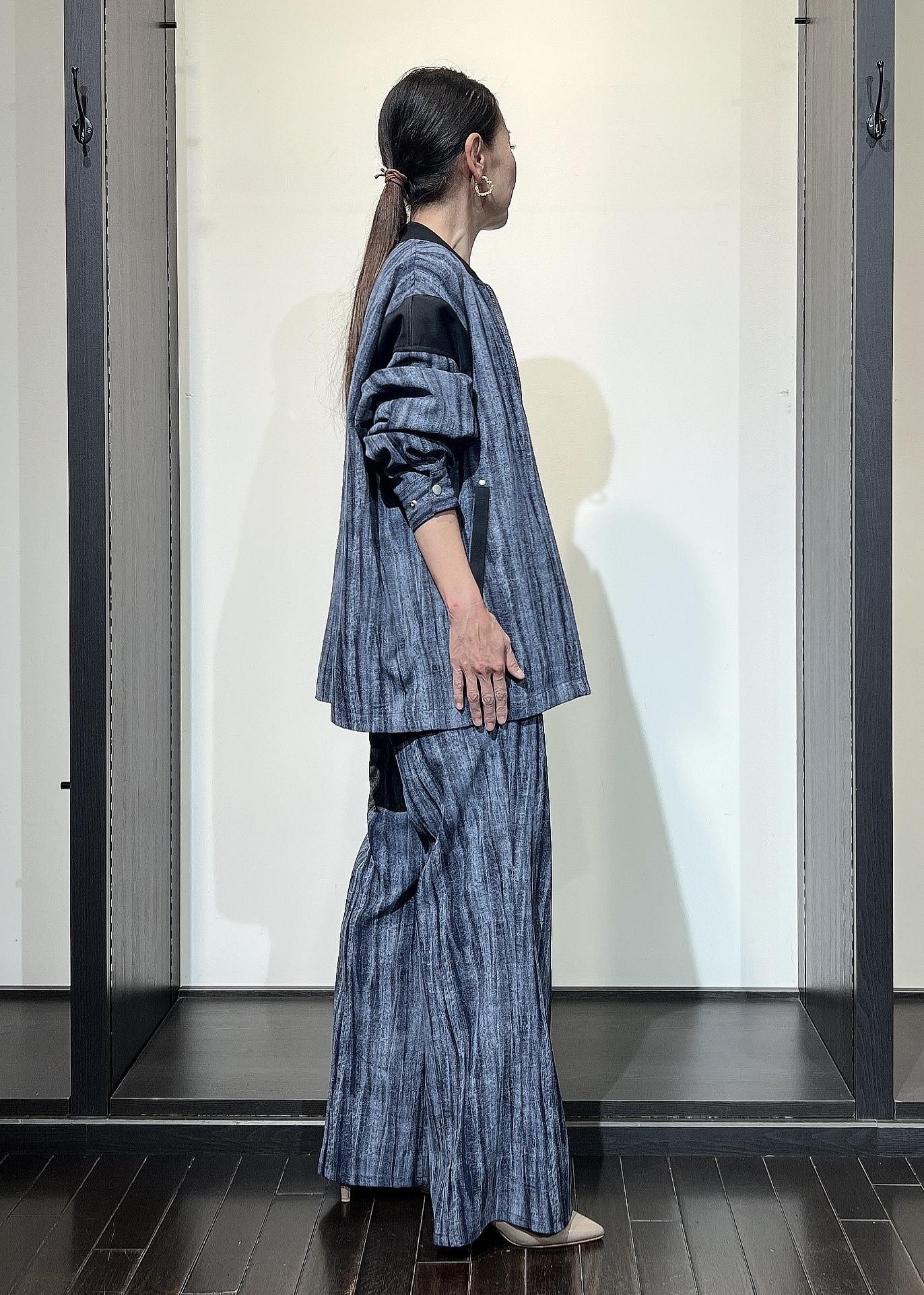 ランダムなストライプ柄がポイントできれいめな印象になります。 -