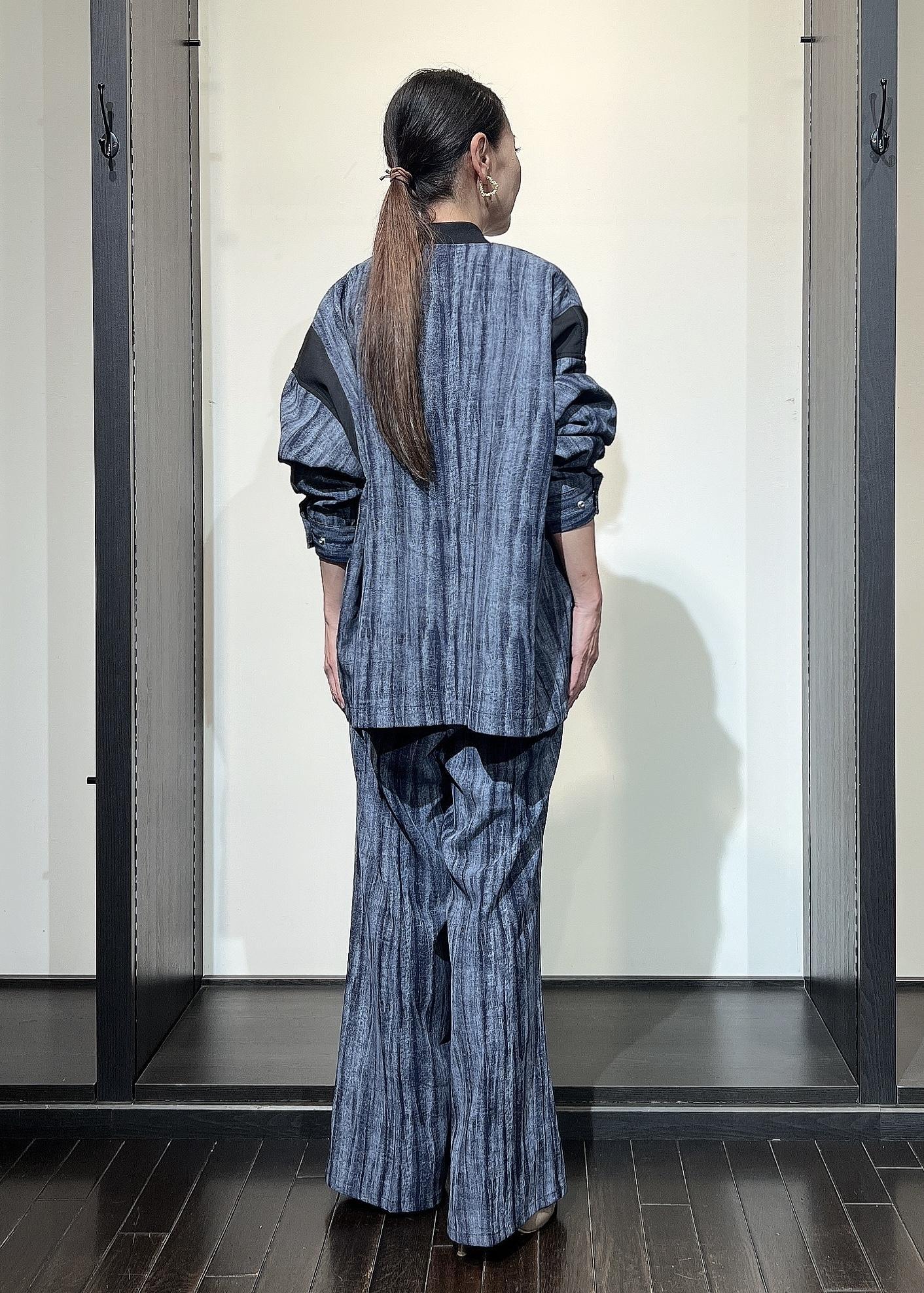 セールアイテムのストライプブルゾン、フレアパンツをセットアップで着用しました。
