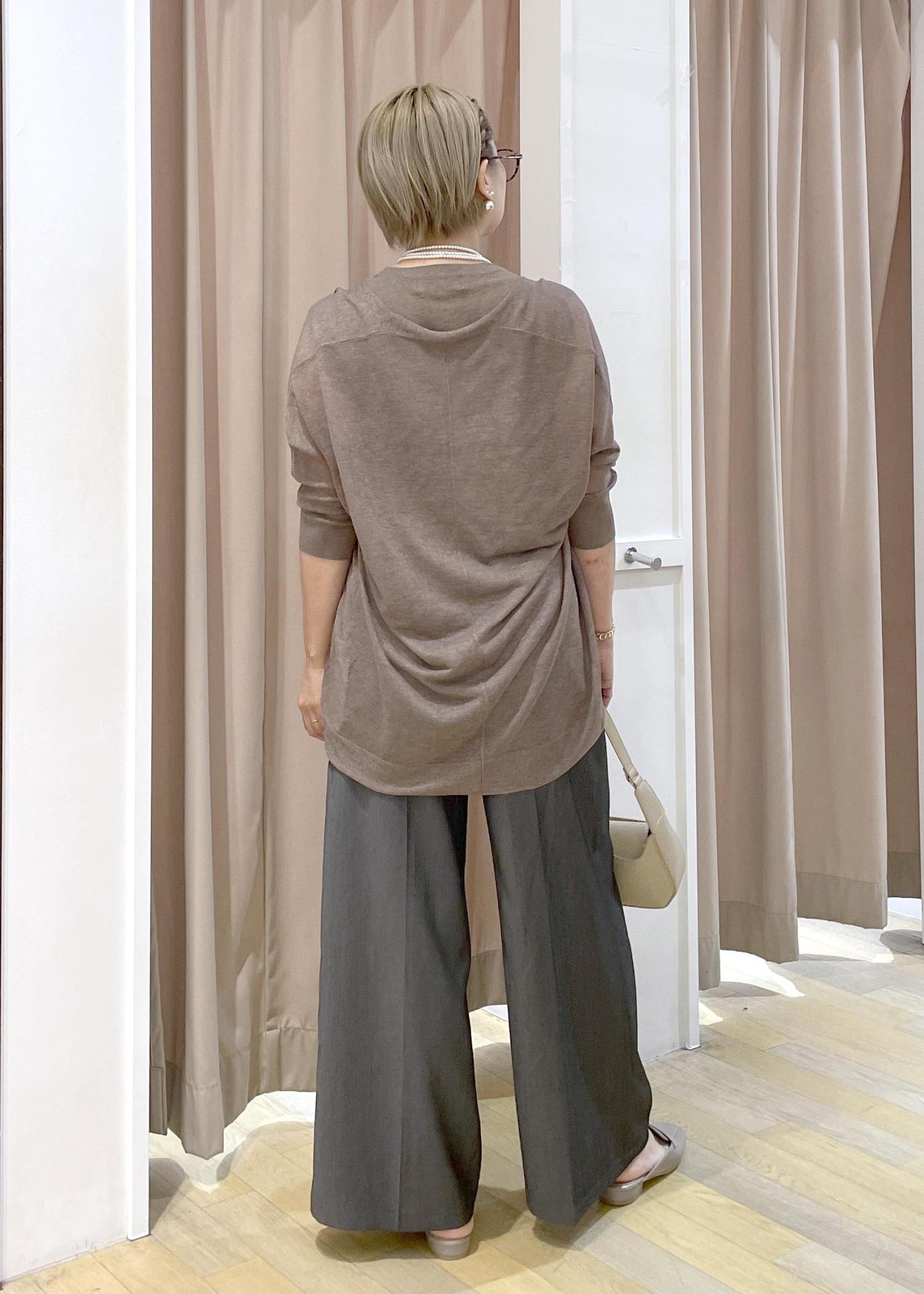 シアーカーディガンを使ったアンサンブルに、シルエットがキレイなパンツを合わせた大人カジュアルコーデです。