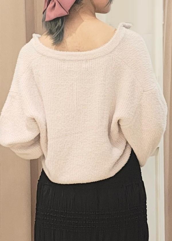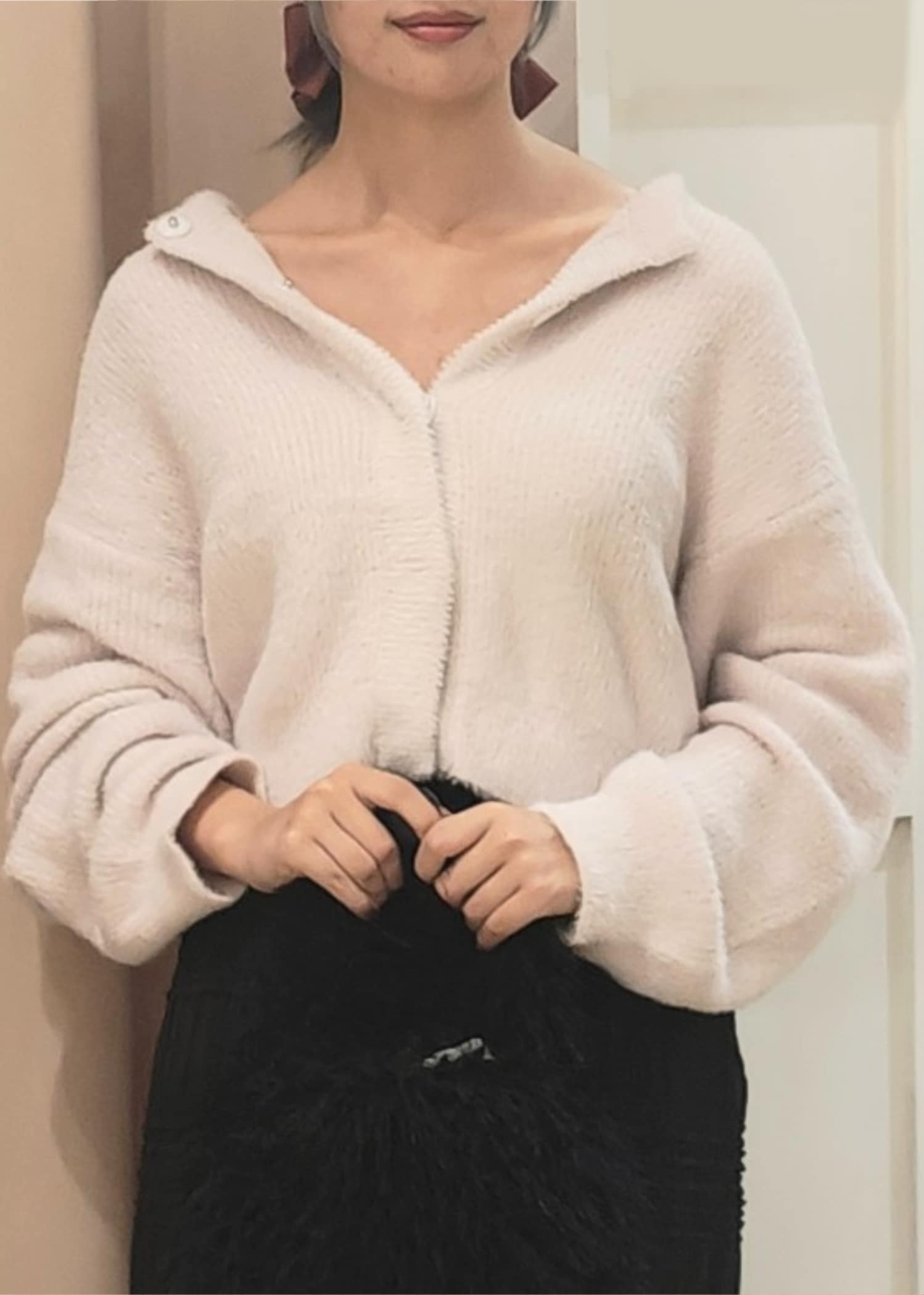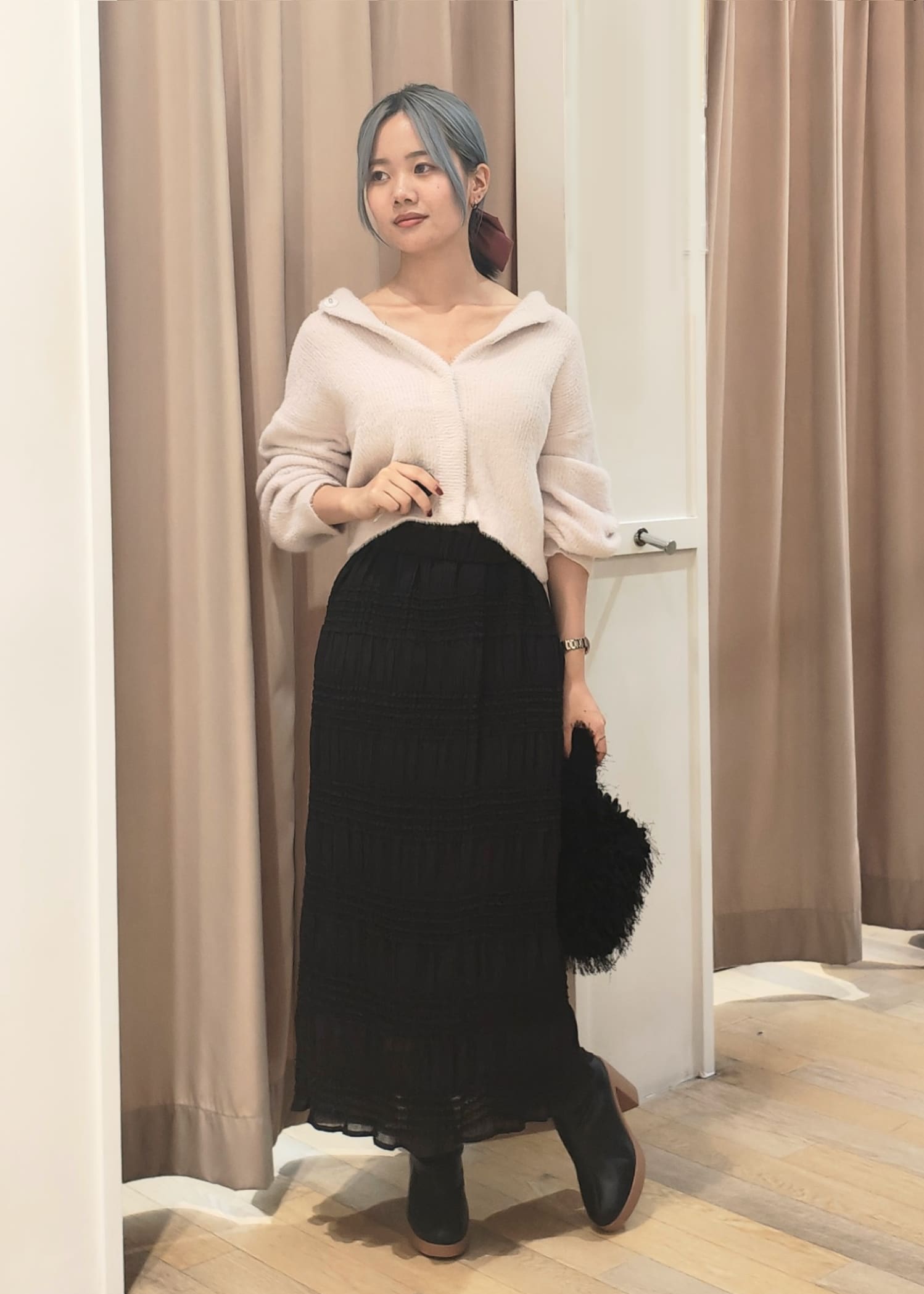 カーディガンは襟を抜くことで、スッキリとした印象に。