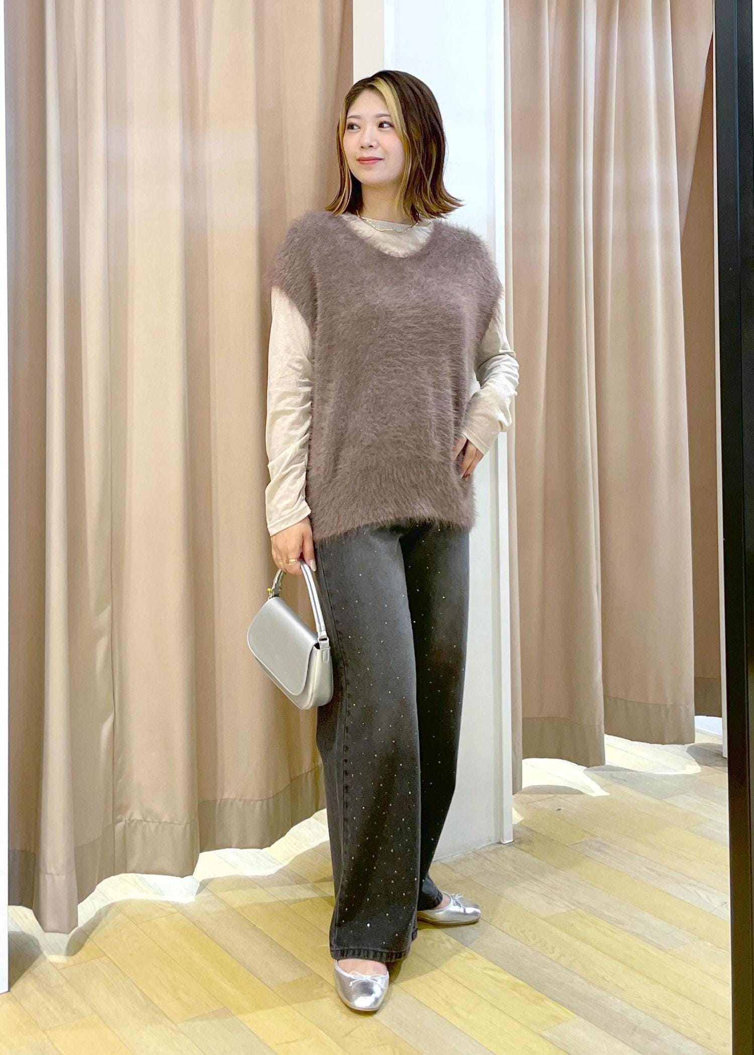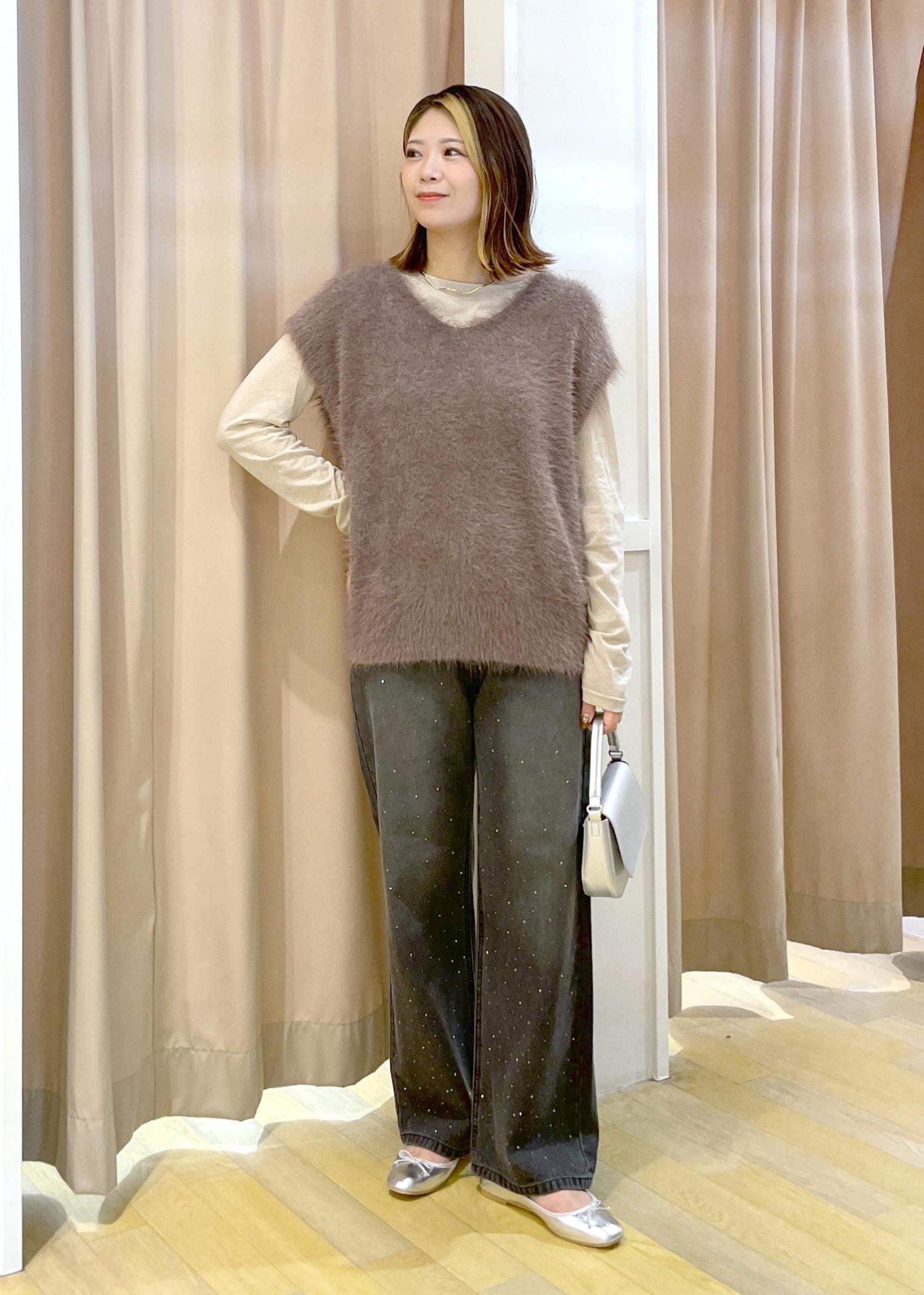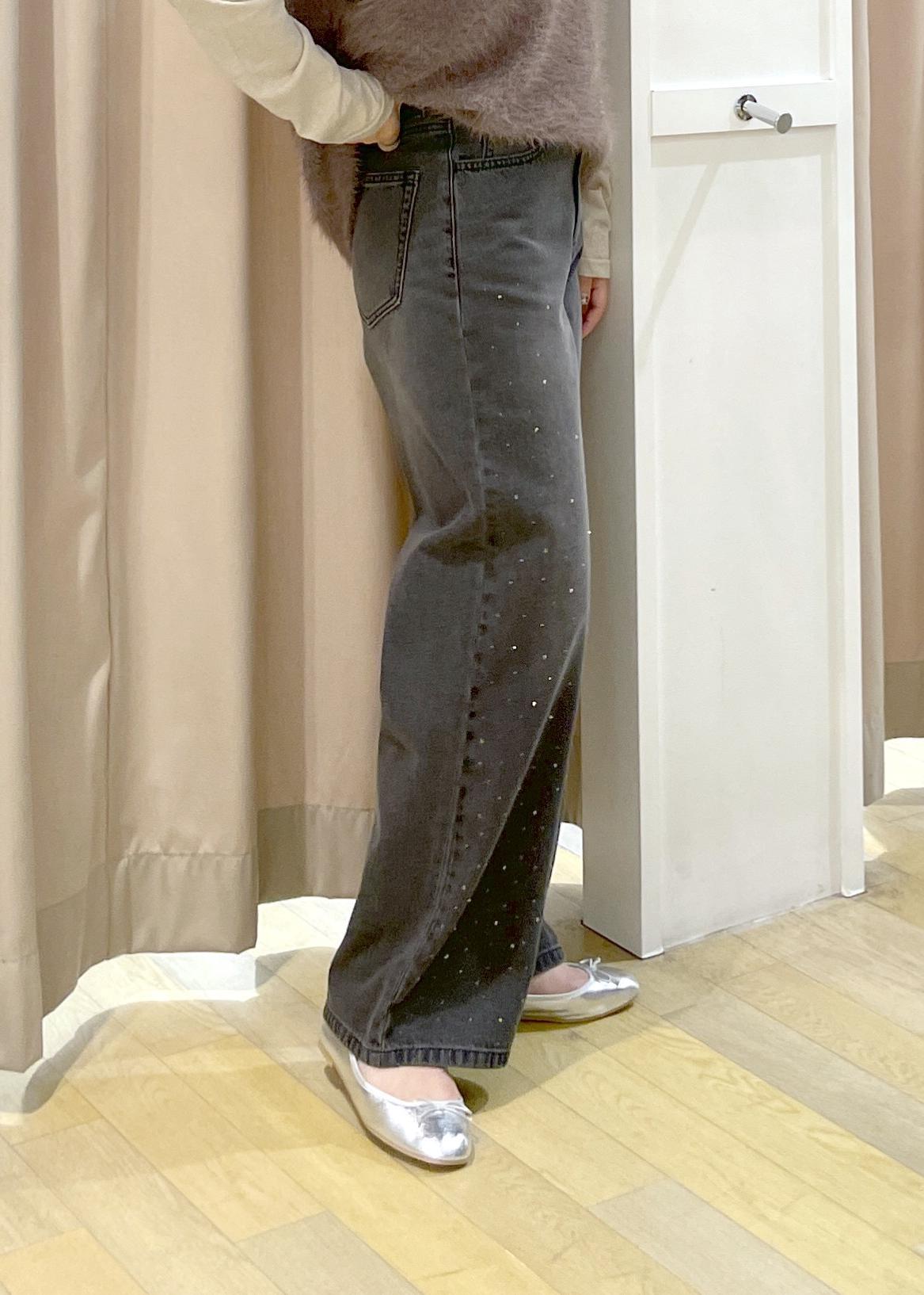 落ち着いたカラーでまとめた為、パンツはビジュー付きのデニムで華やかさをプラスしました!