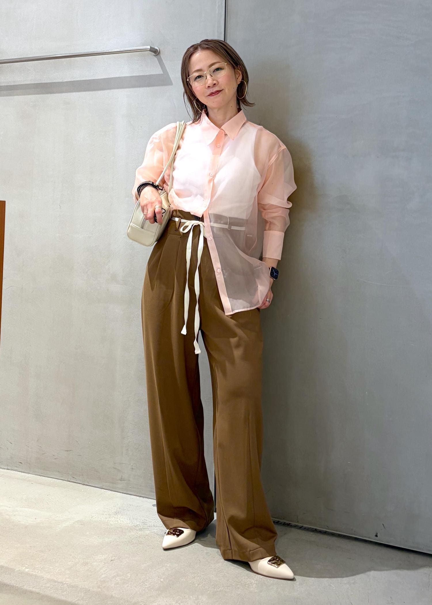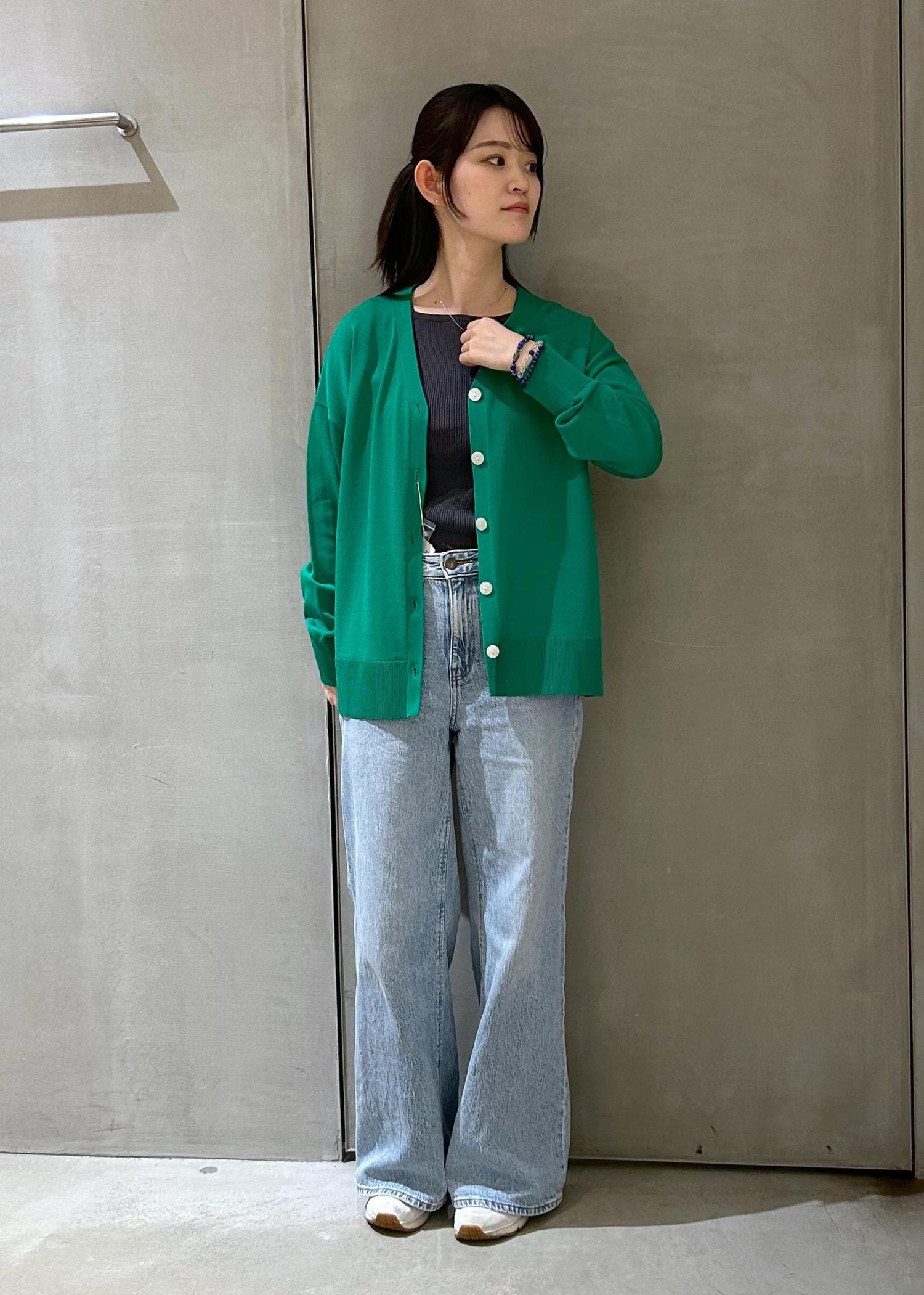白+パステルカラーの全体的に明るい色味で合わせたので、インナーは暗めのブラウンでしめてみました。ベストの丈感が長めなので体型カバーにも◎