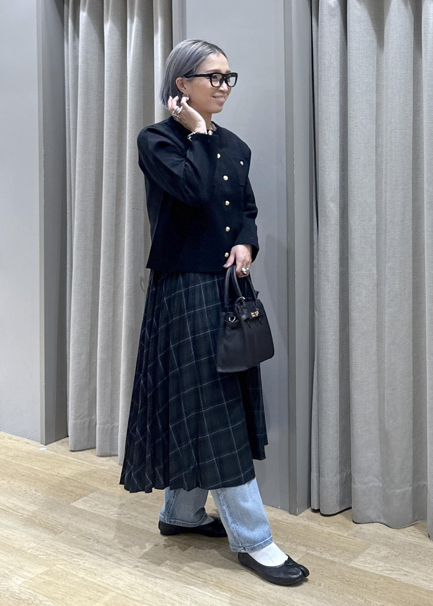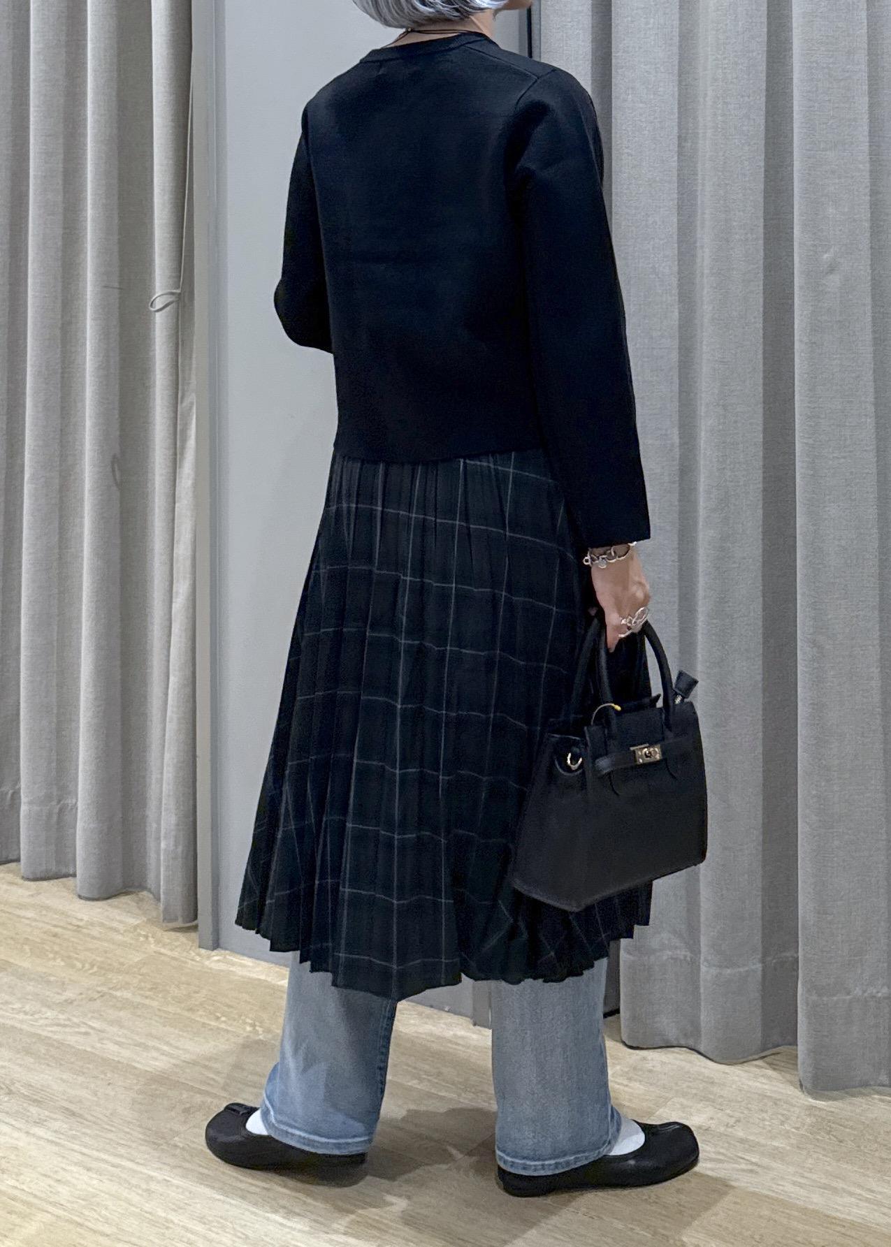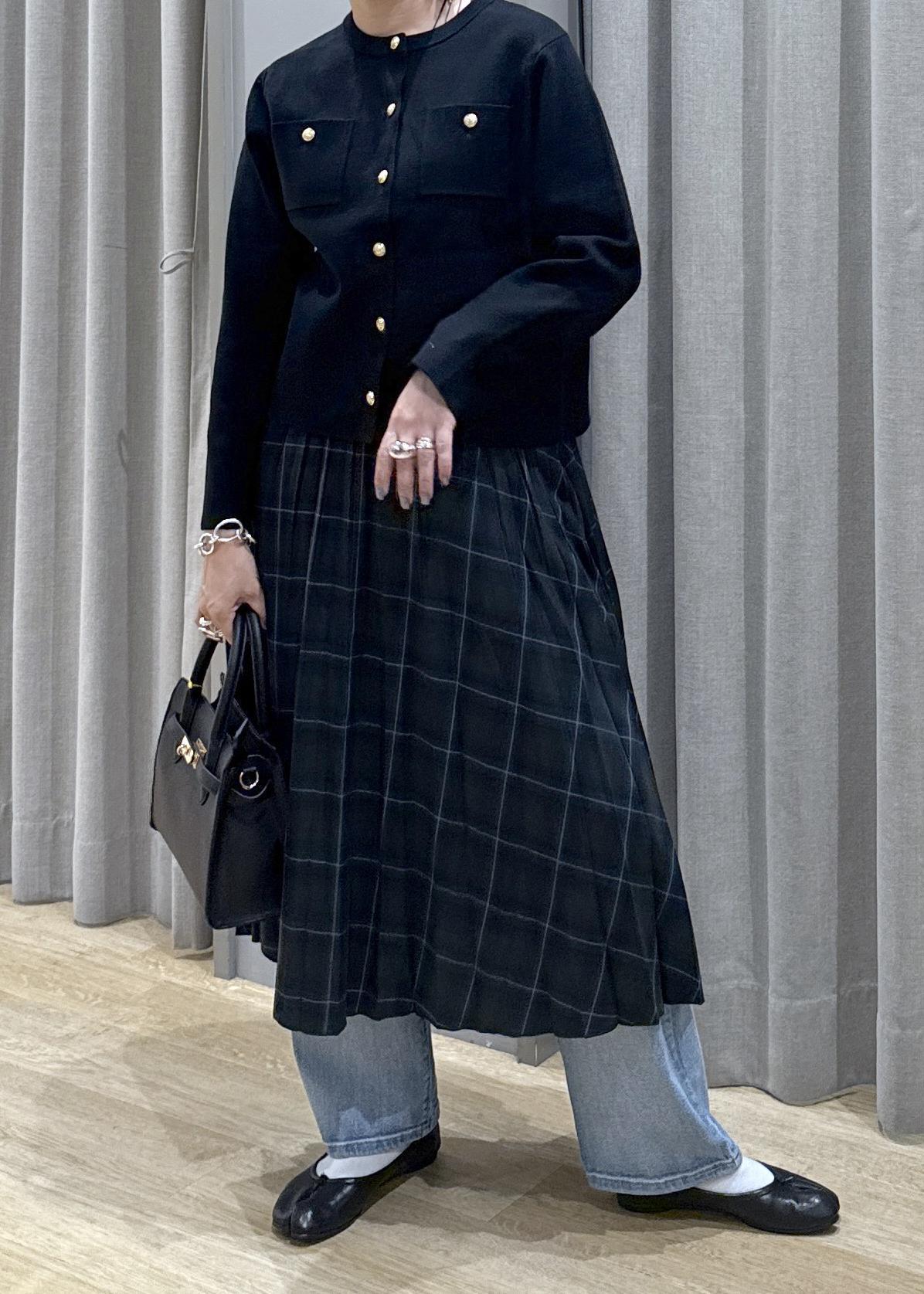 デニムを履く事で、少し丈の足りないプリーツスカートわ巻きスカートのように演出しています。