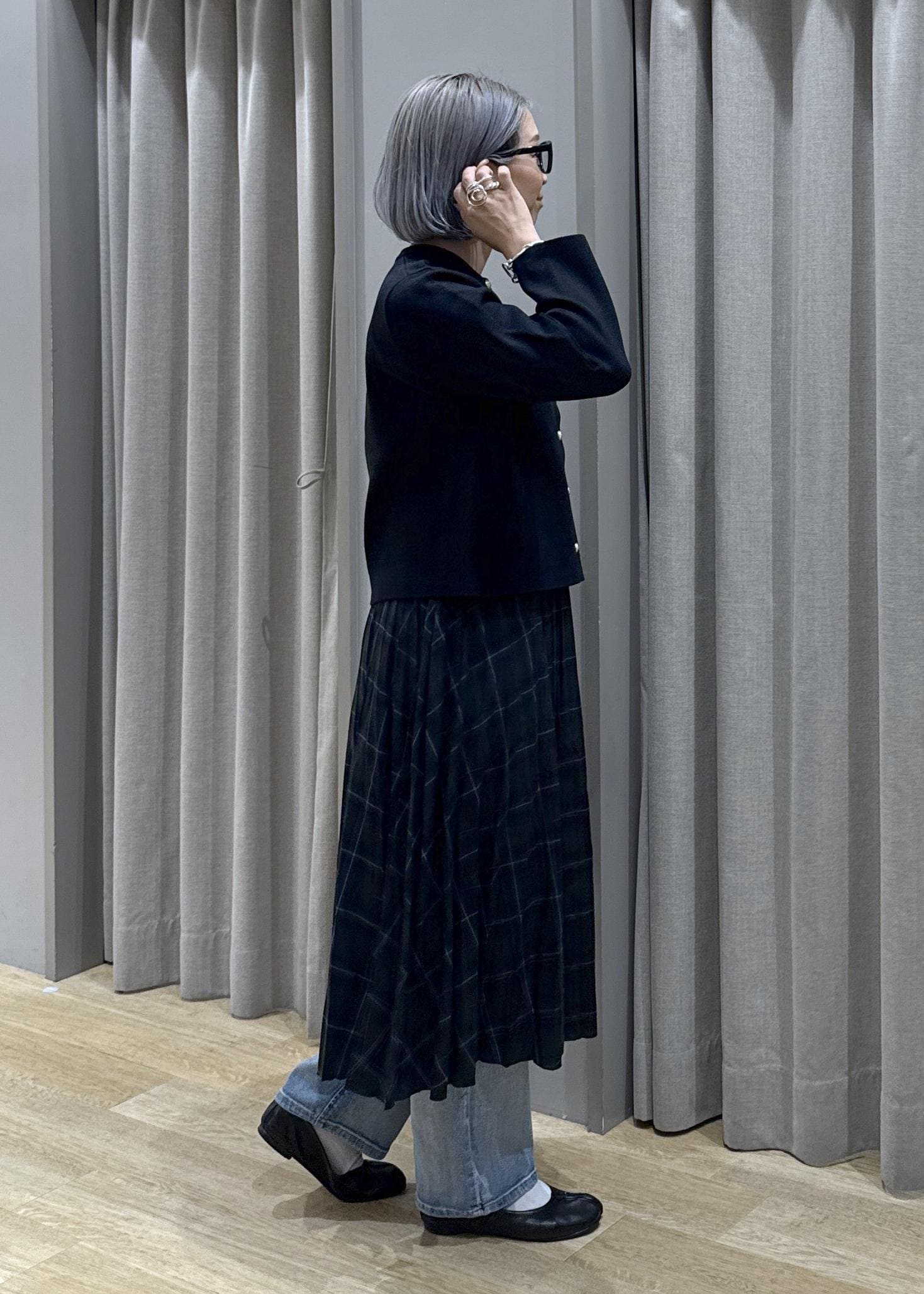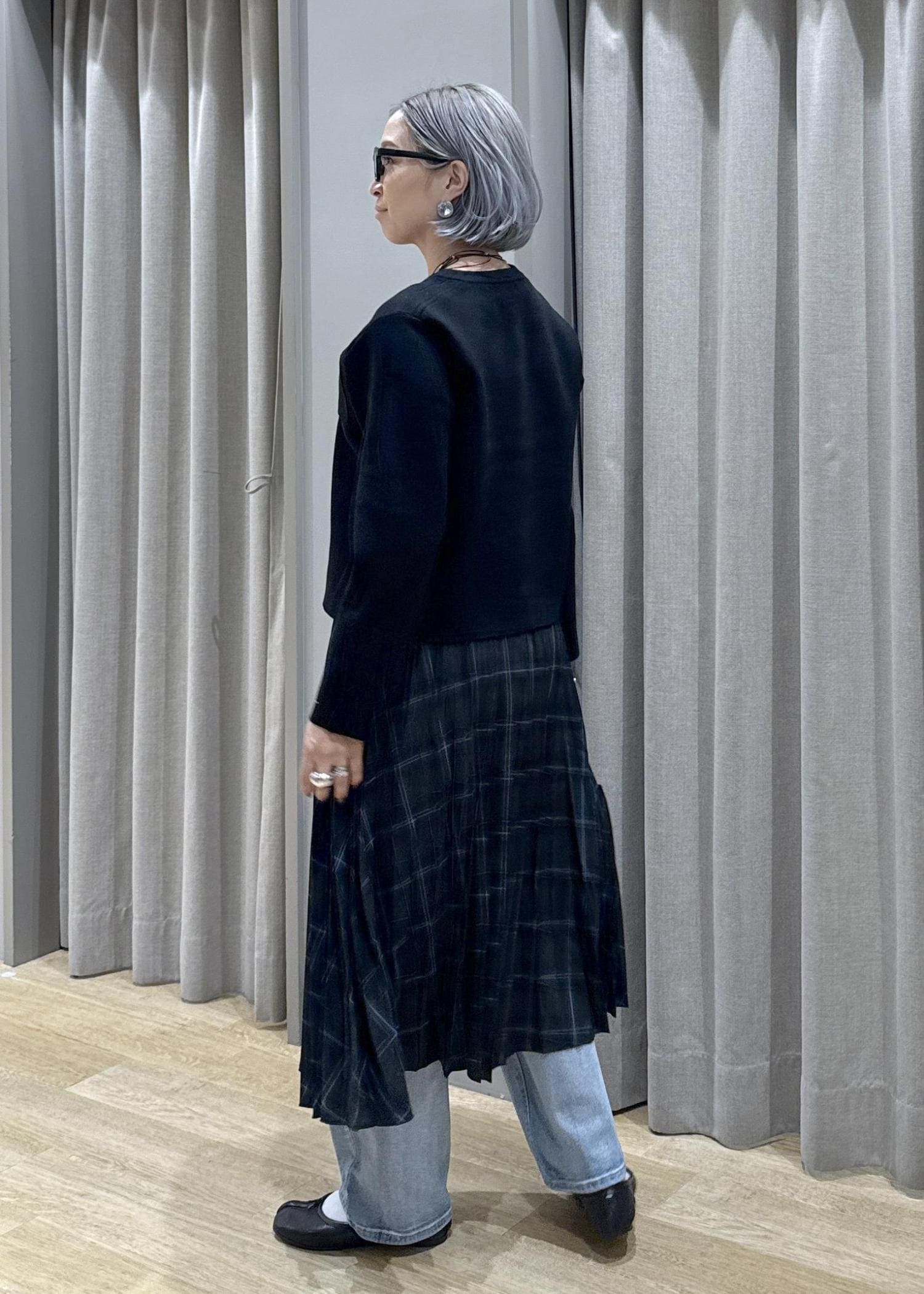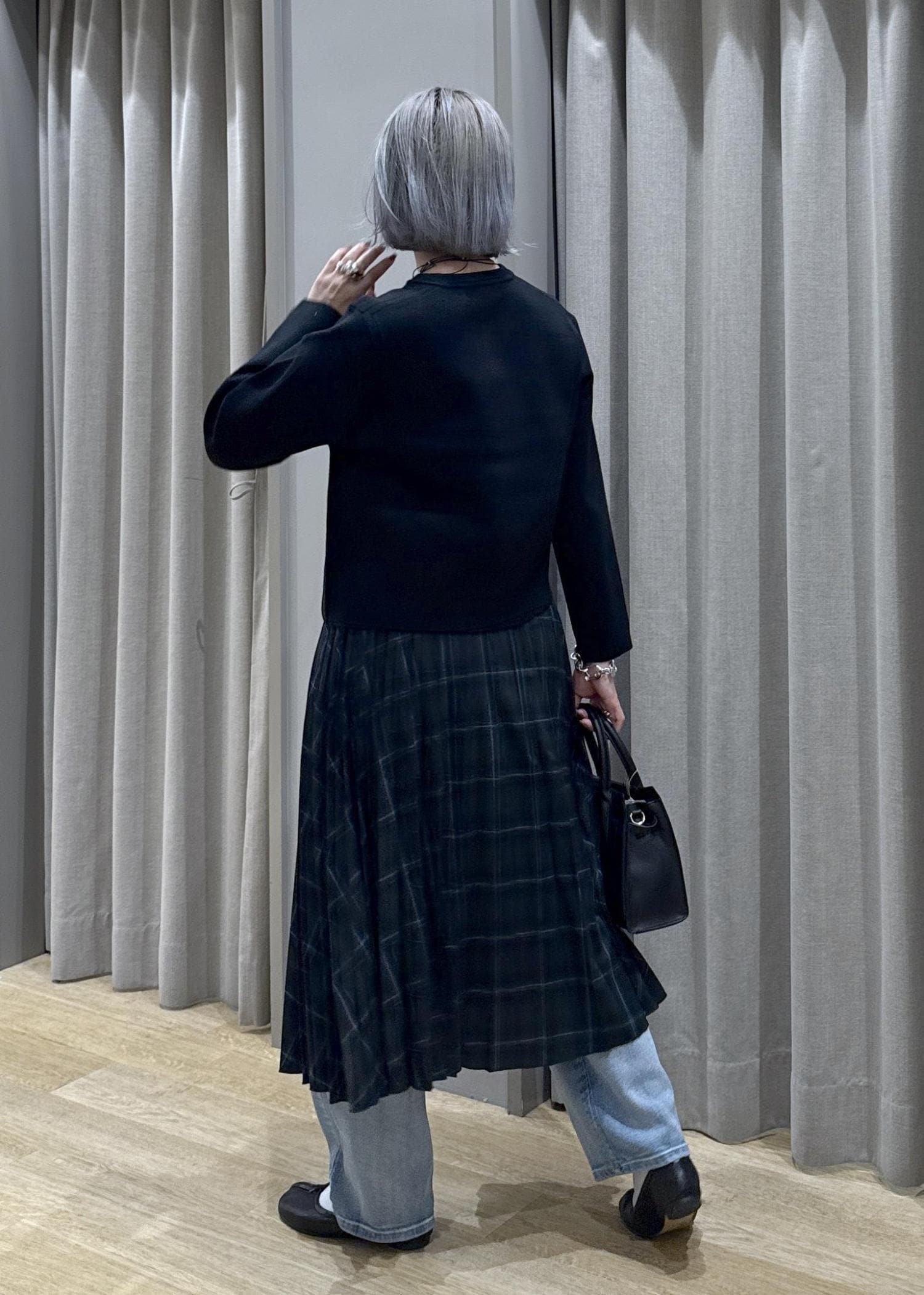 デニムを履く事で、少し丈の足りないプリーツスカートわ巻きスカートのように演出しています。