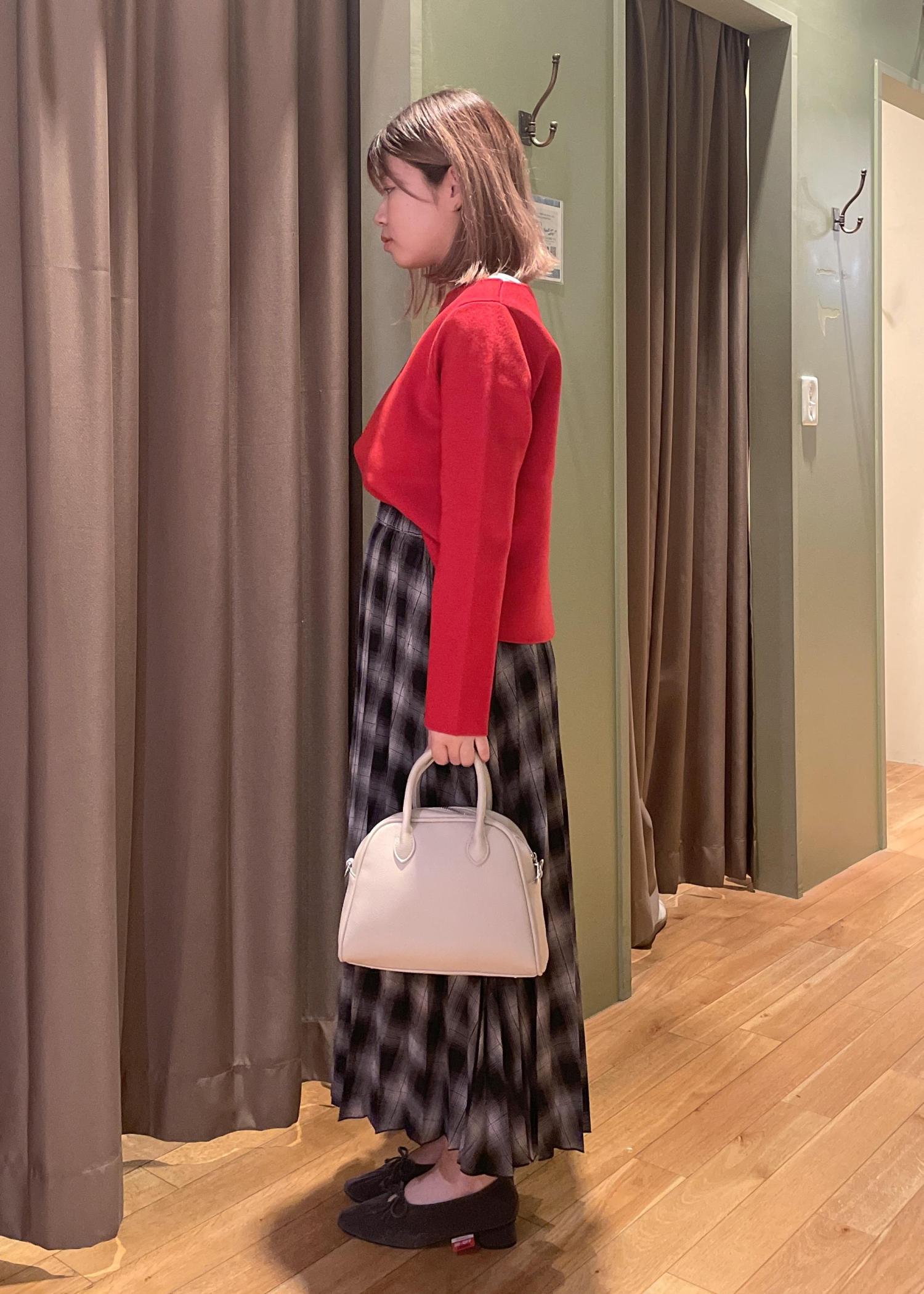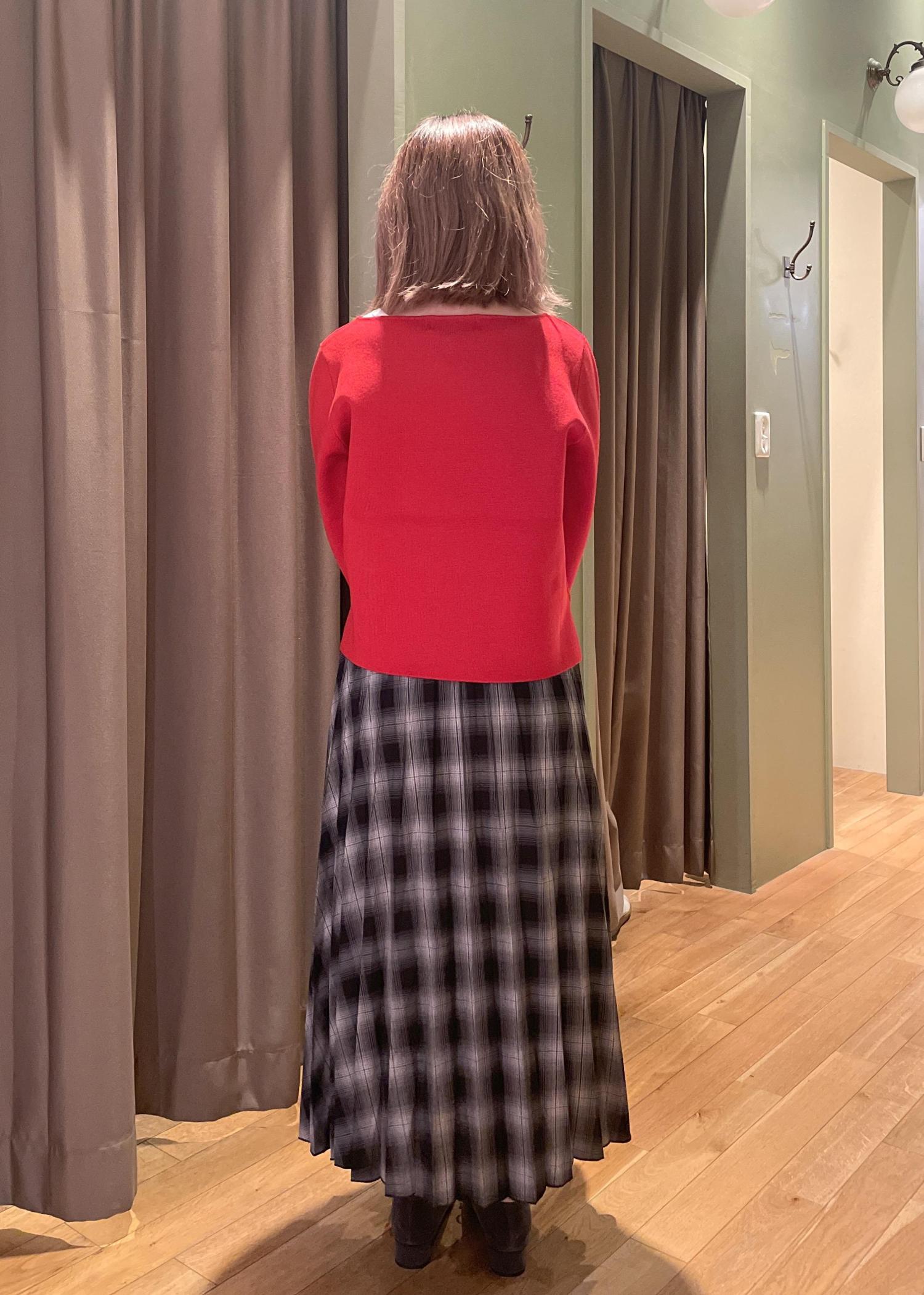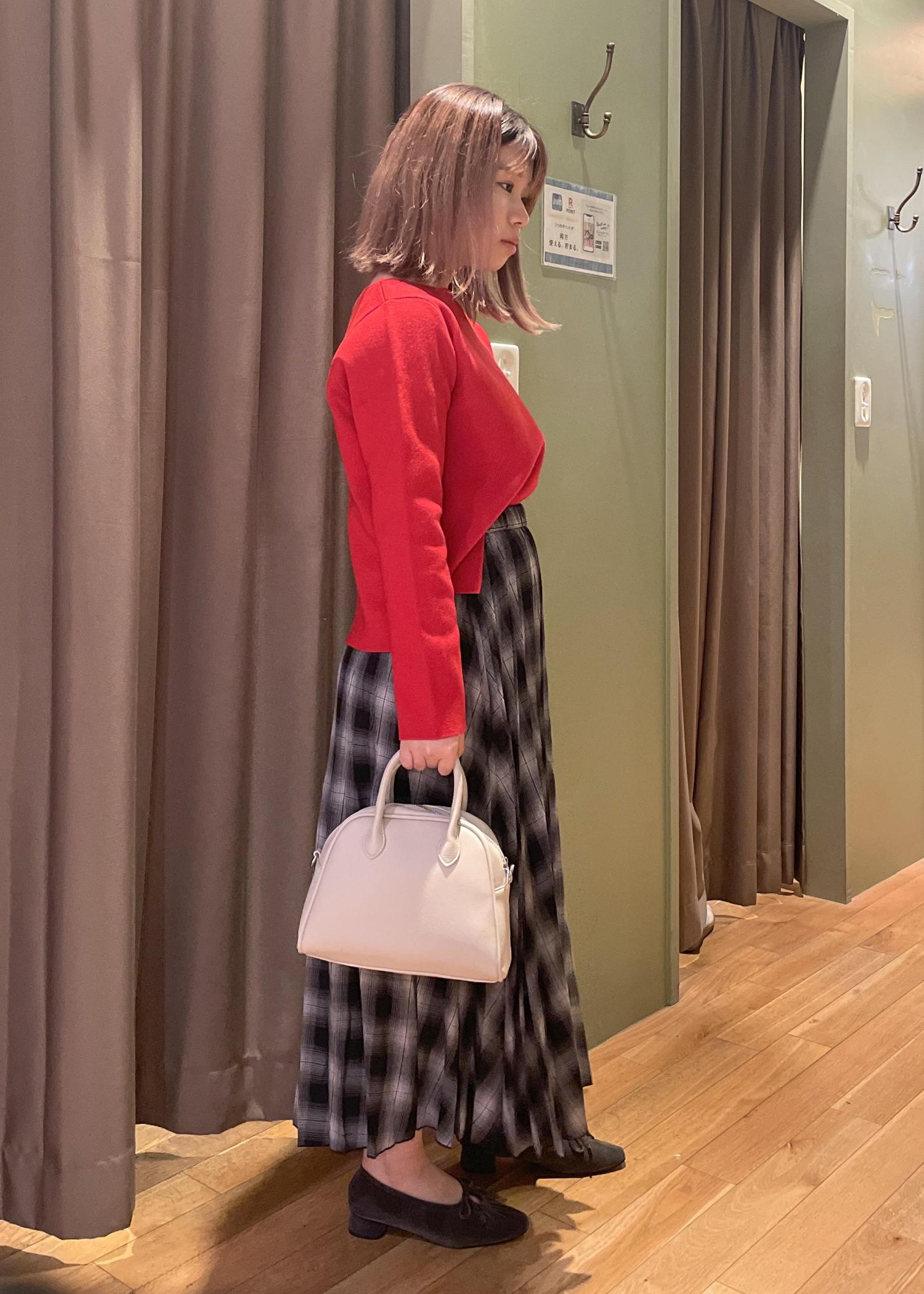 赤色のトップスとチェックのスカートでガーリーな印象にしつつ、ロングスカートにすることでガーリーすぎないコーディネートにしました!!