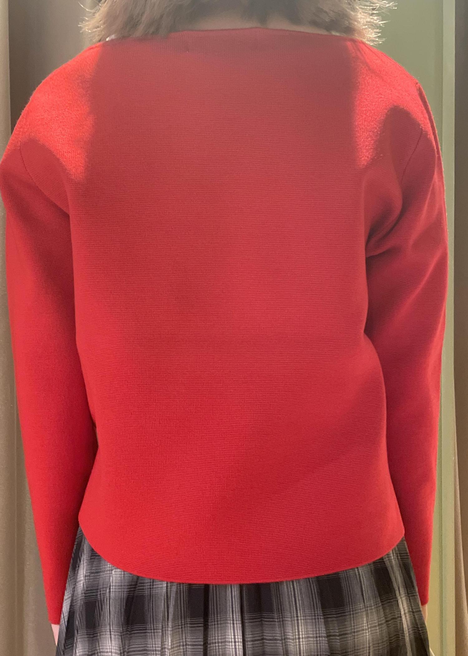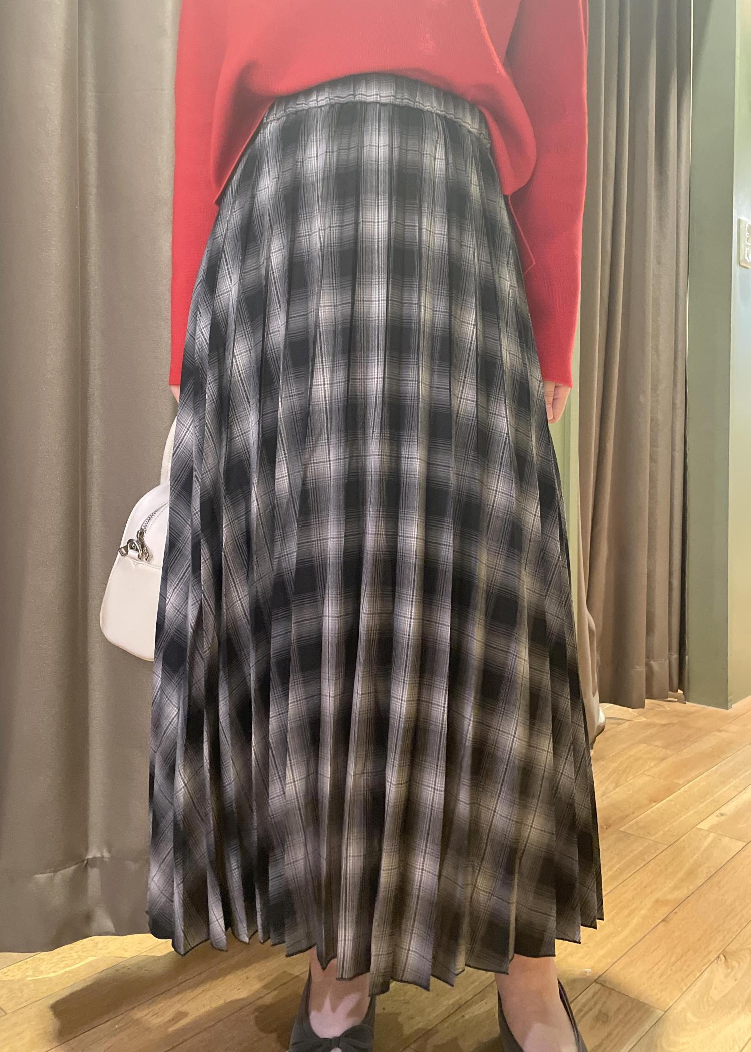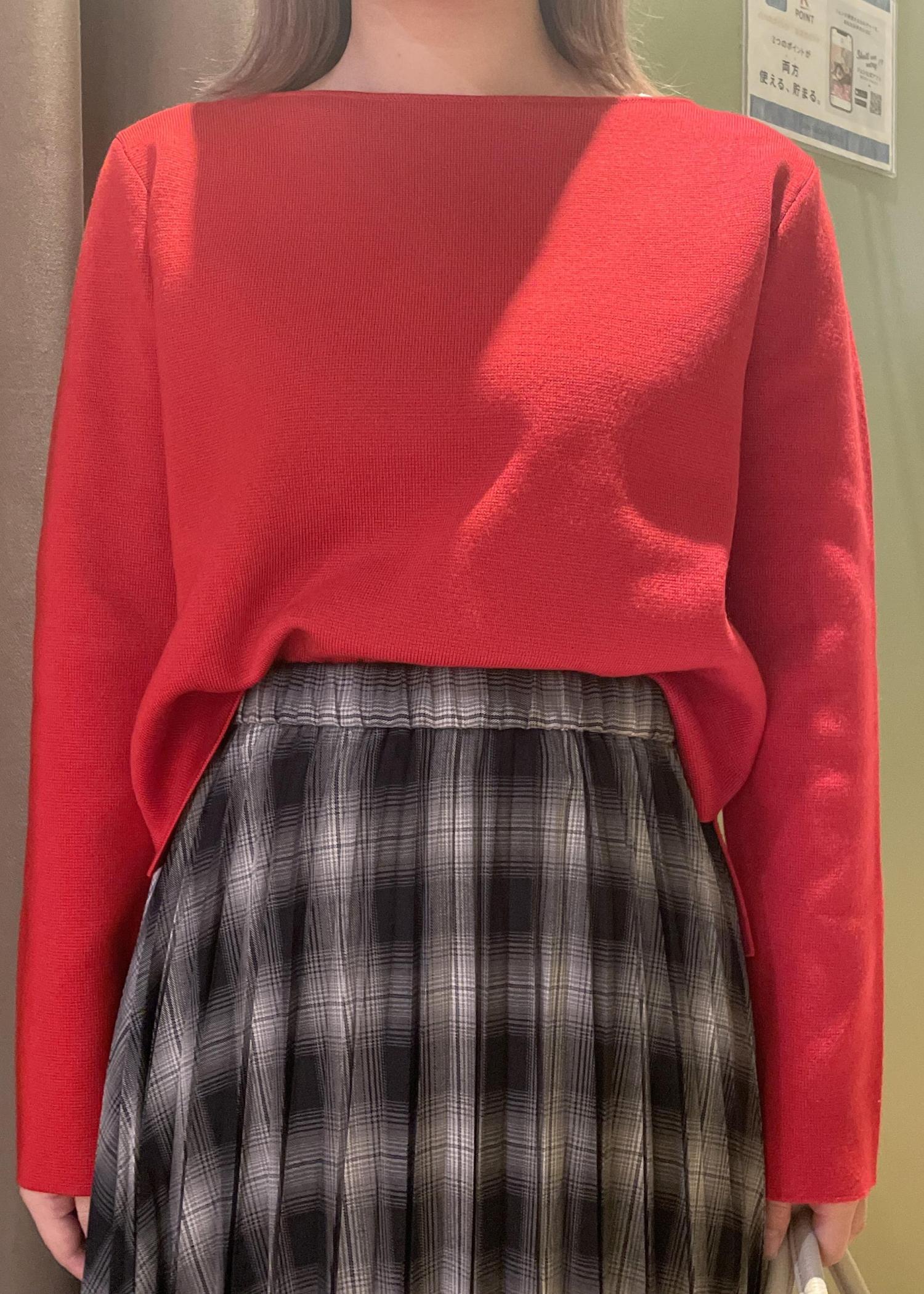 赤色のトップスとチェックのスカートでガーリーな印象にしつつ、ロングスカートにすることでガーリーすぎないコーディネートにしました!!
