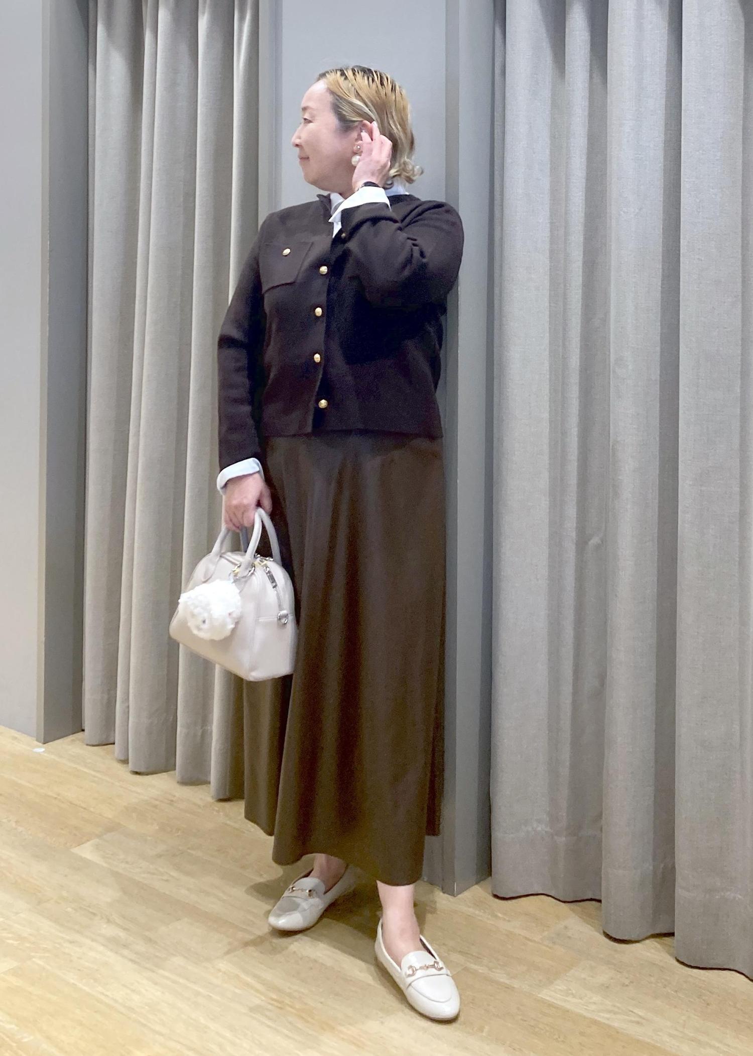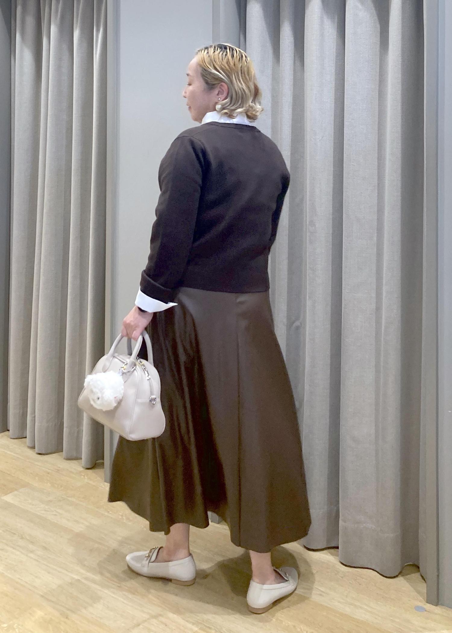 金ボタンの効いたカーディガンに、柔らかなフレアラインのレザースカートを合わせて大人の秋コーデでにしてみました
