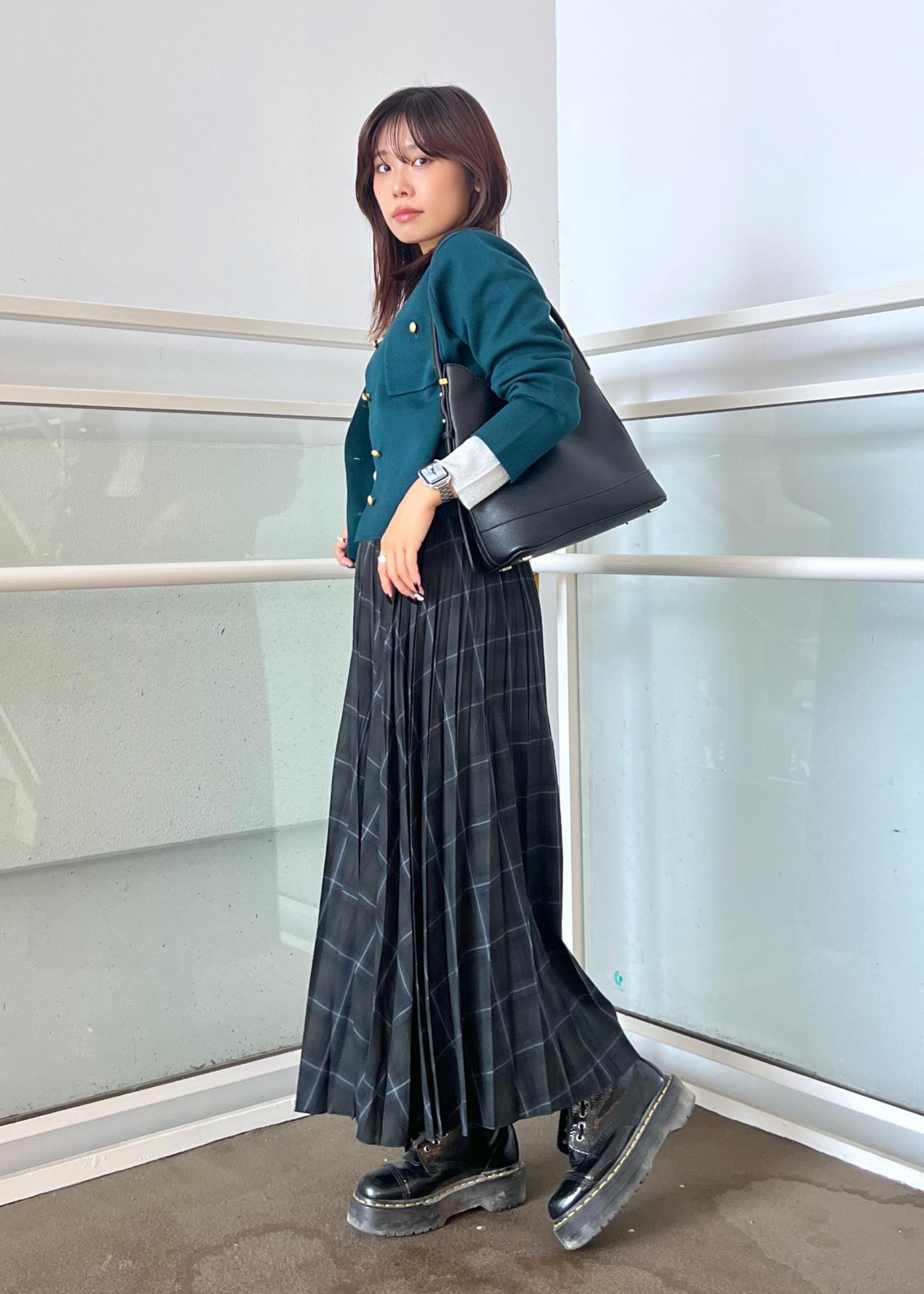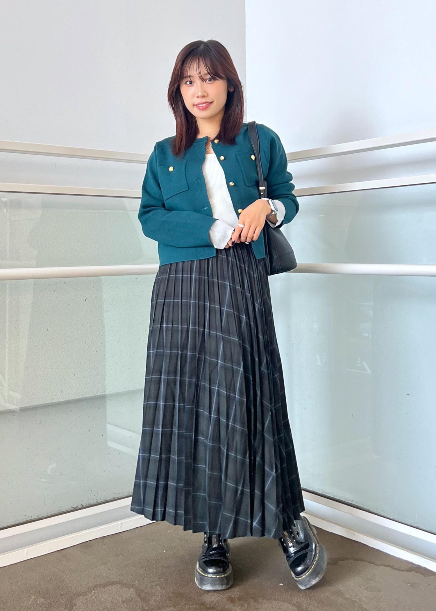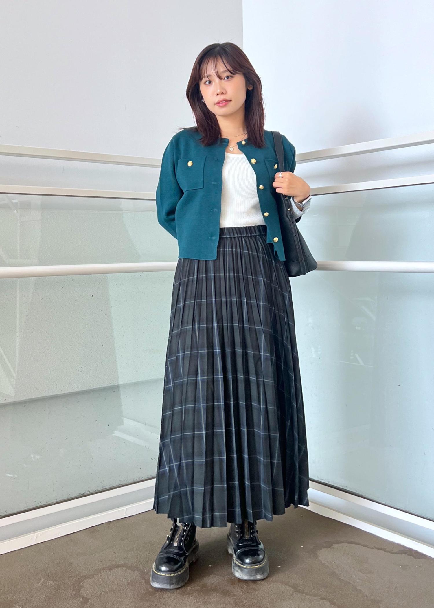 毎年人気のミラノリブカーディガンは今回サイズが選べます。シーンに合わせてサイズ感が選べるのもおすすめポイントです。またスカートにはカラー合わせで緑のチェックスカートを合わせ、さり気ない秋感をプラスしてみました。