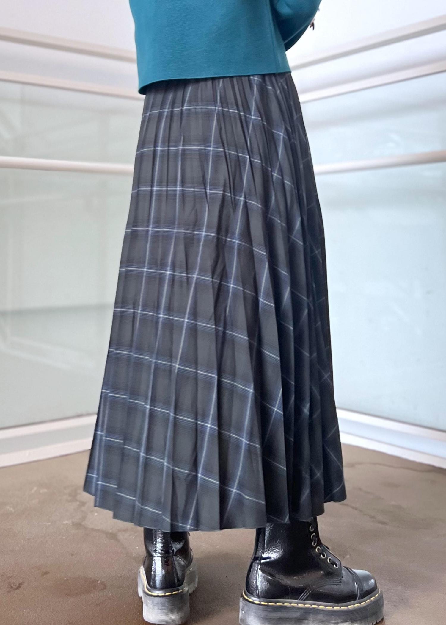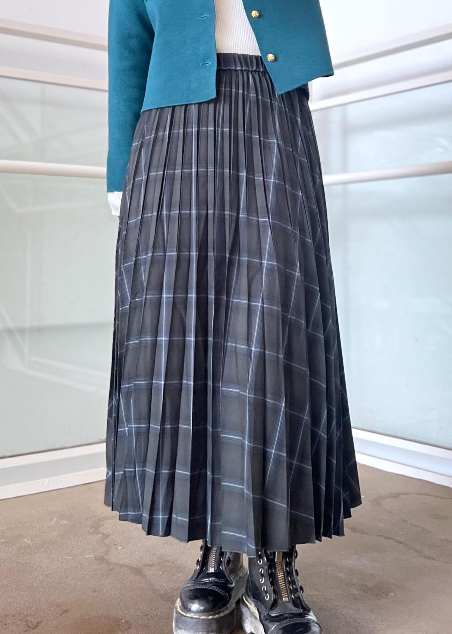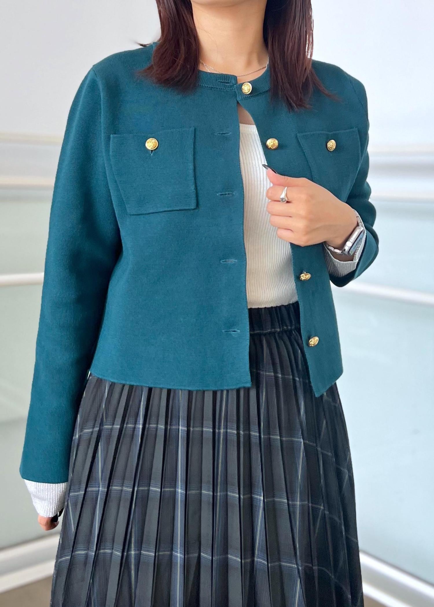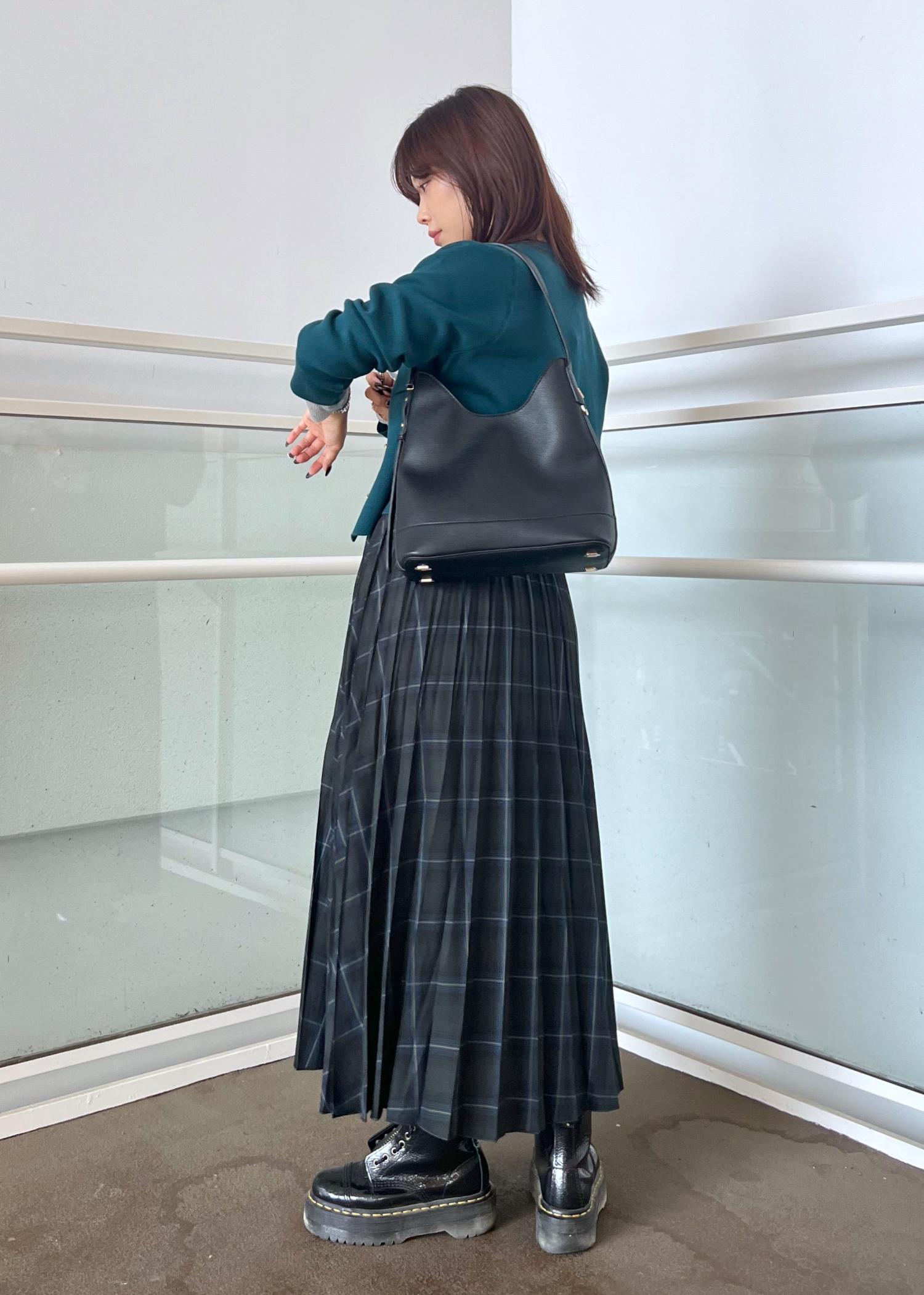 毎年人気のミラノリブカーディガンは今回サイズが選べます。シーンに合わせてサイズ感が選べるのもおすすめポイントです。またスカートにはカラー合わせで緑のチェックスカートを合わせ、さり気ない秋感をプラスしてみました。