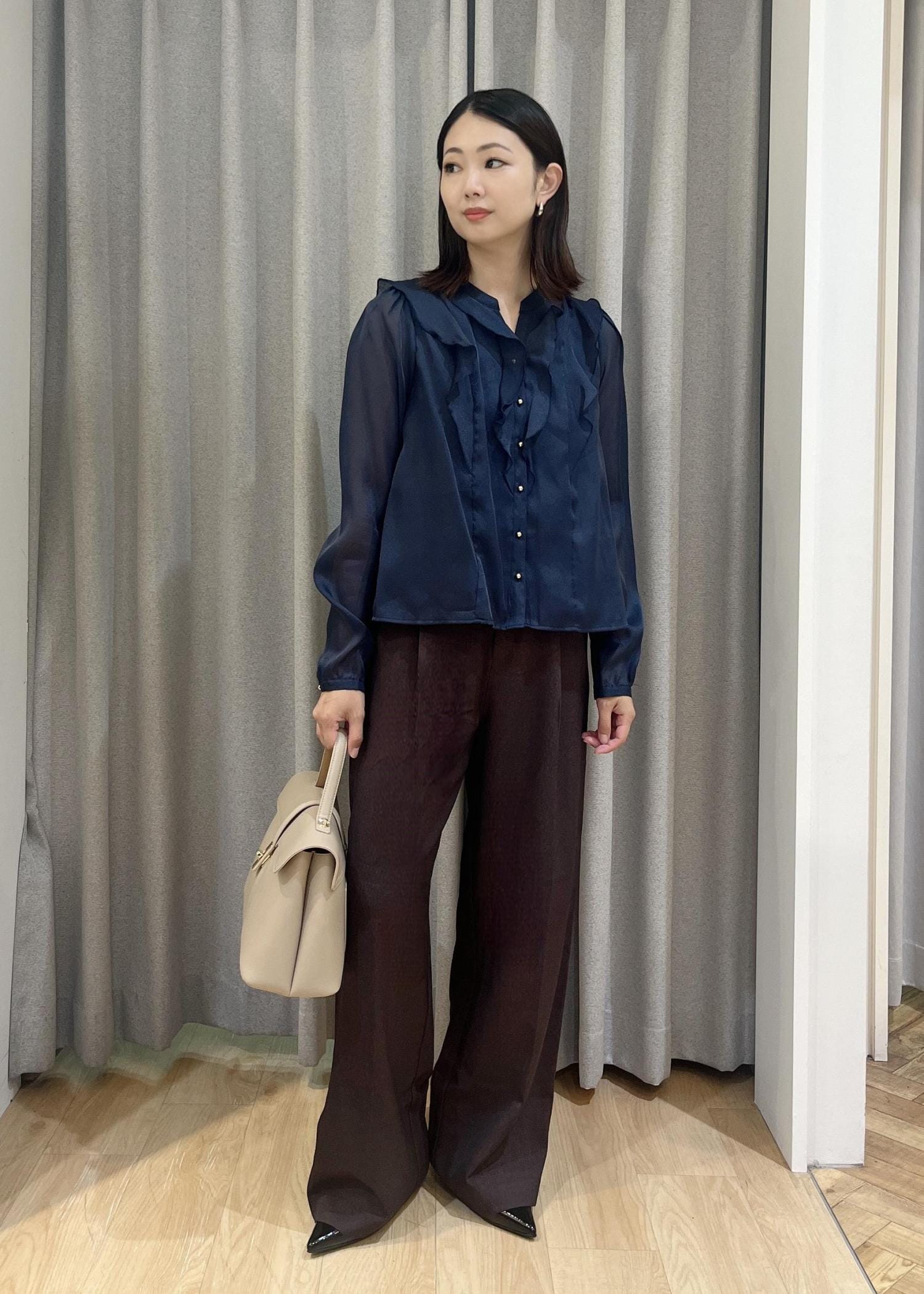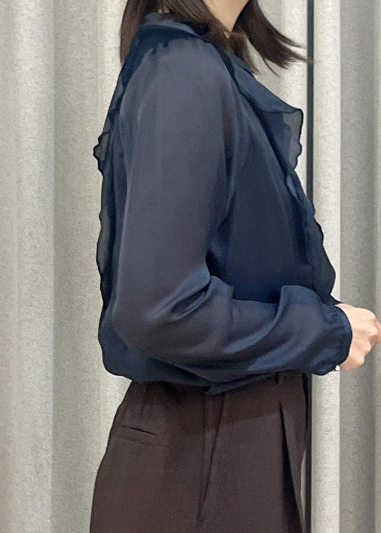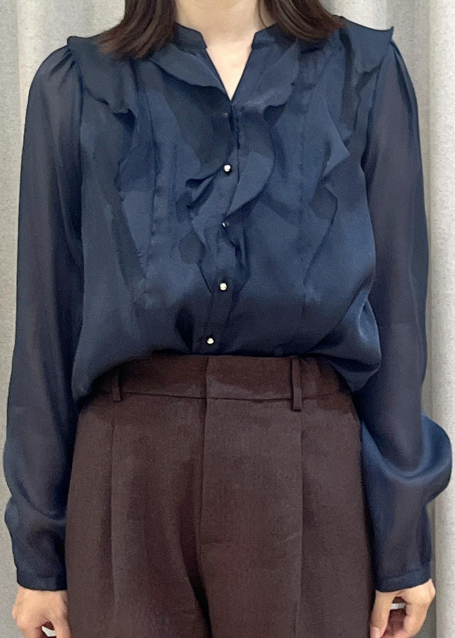 VISシアーラッフルブラウス/イージーケアネイビー / F¥3,842レビュー柔らかな肌触りでゆとりのあるサイズ感なので窮屈感なく着用できます。透けすぎない上品シアーで、きちんと感も◎ジャケットのインナーにもおすすめです。