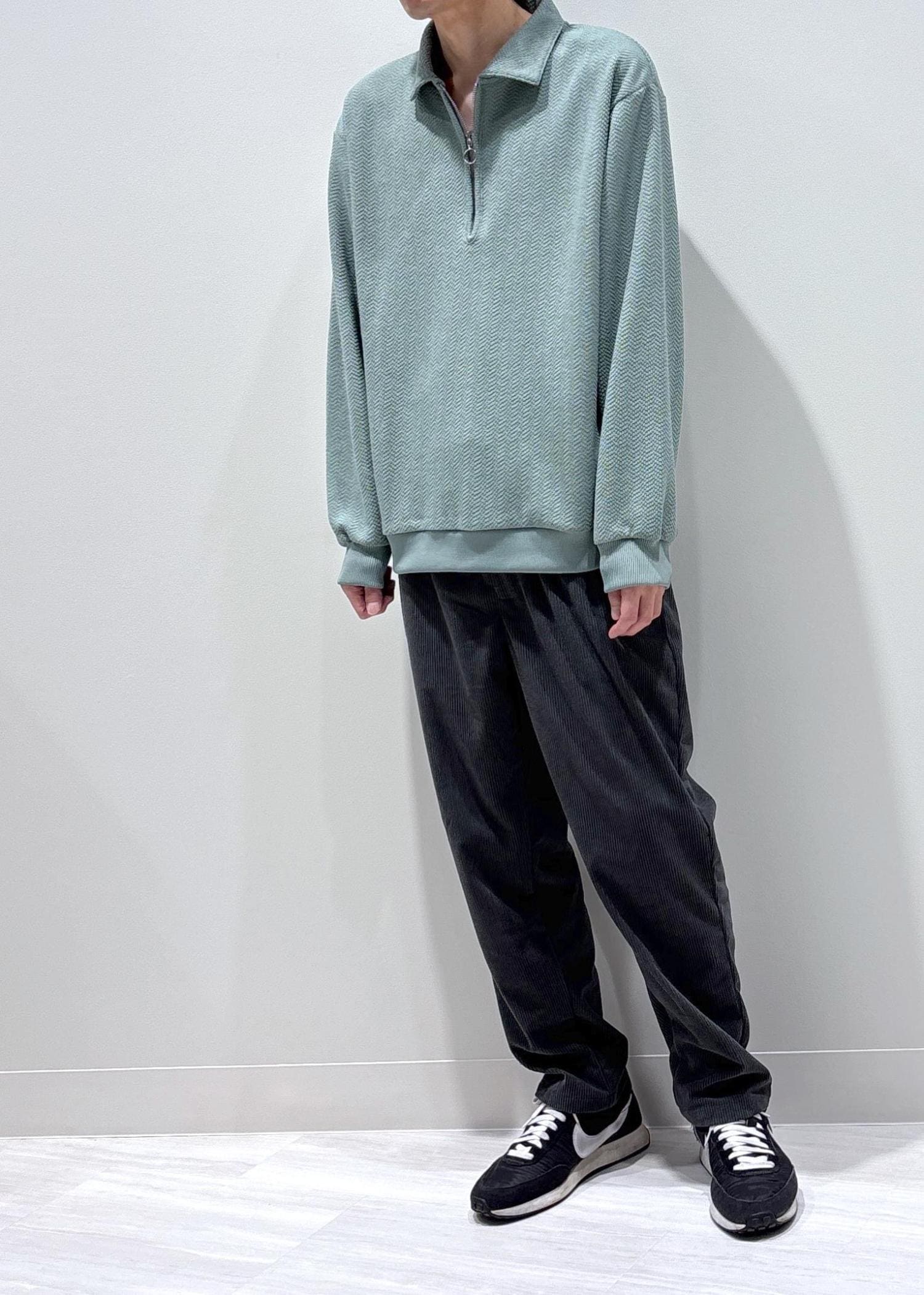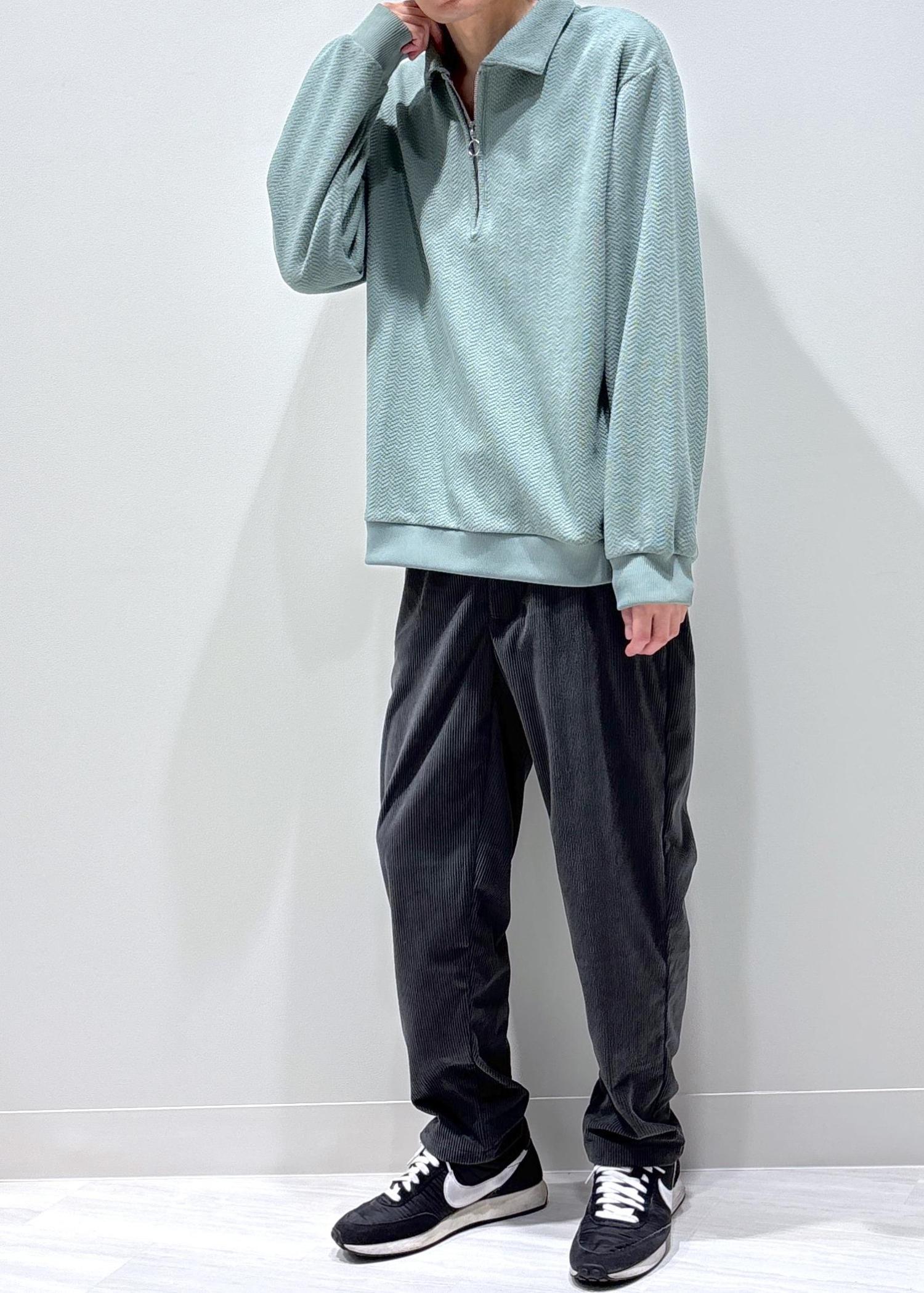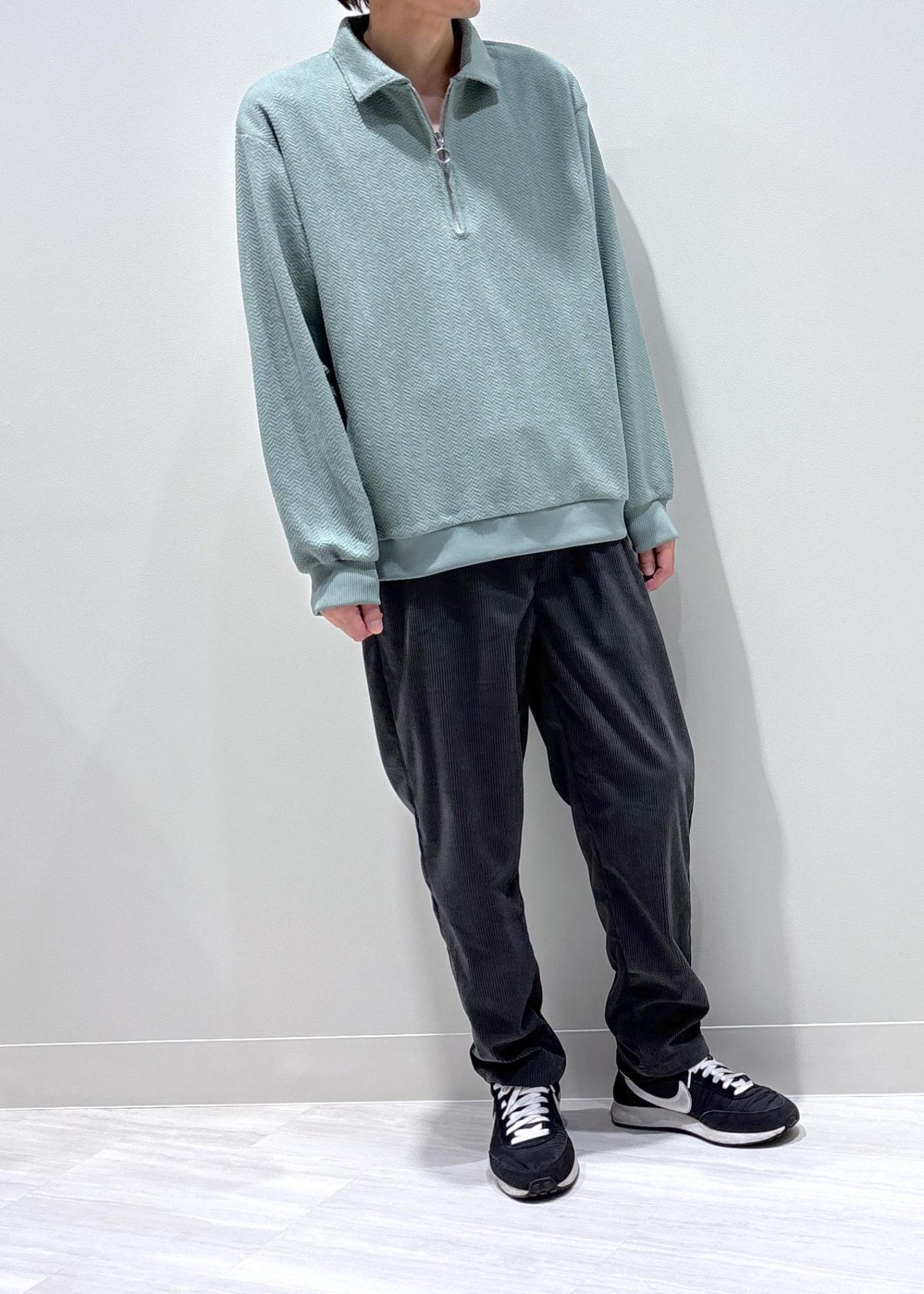 トップスはハーフジッププルオーバーで一枚で着ても様になります。