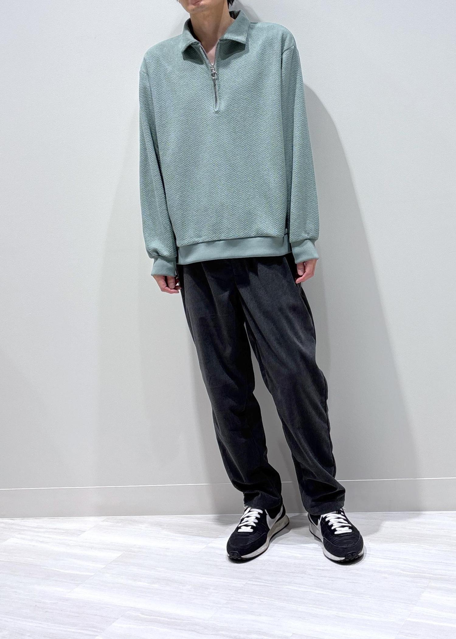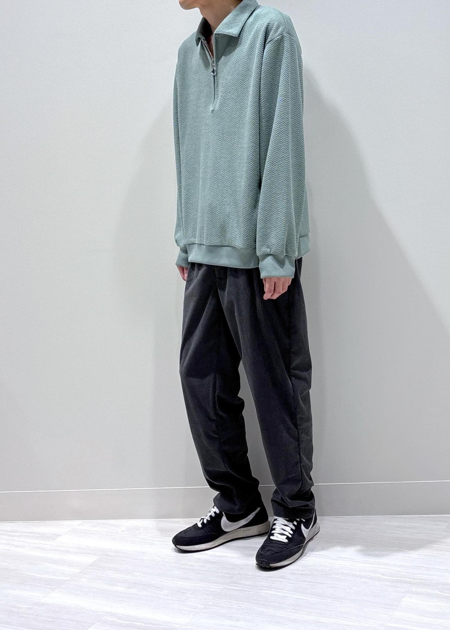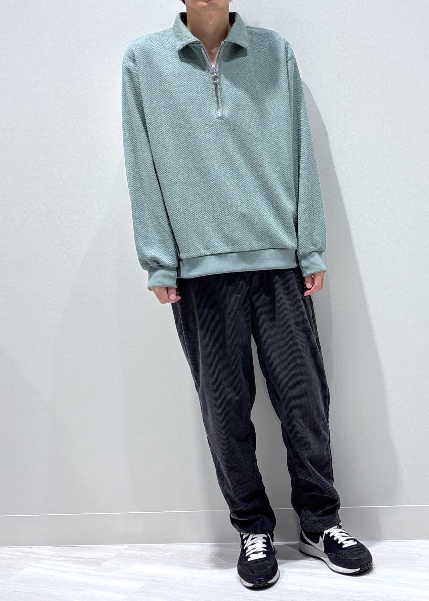 トップスはハーフジッププルオーバーで一枚で着ても様になります。