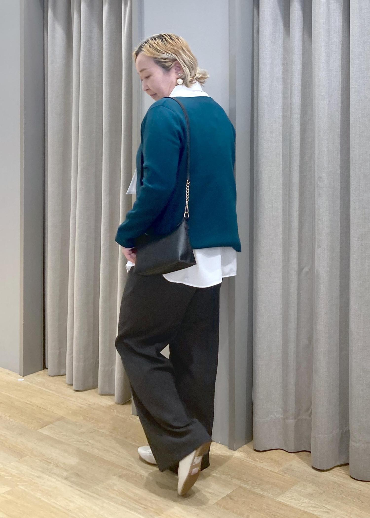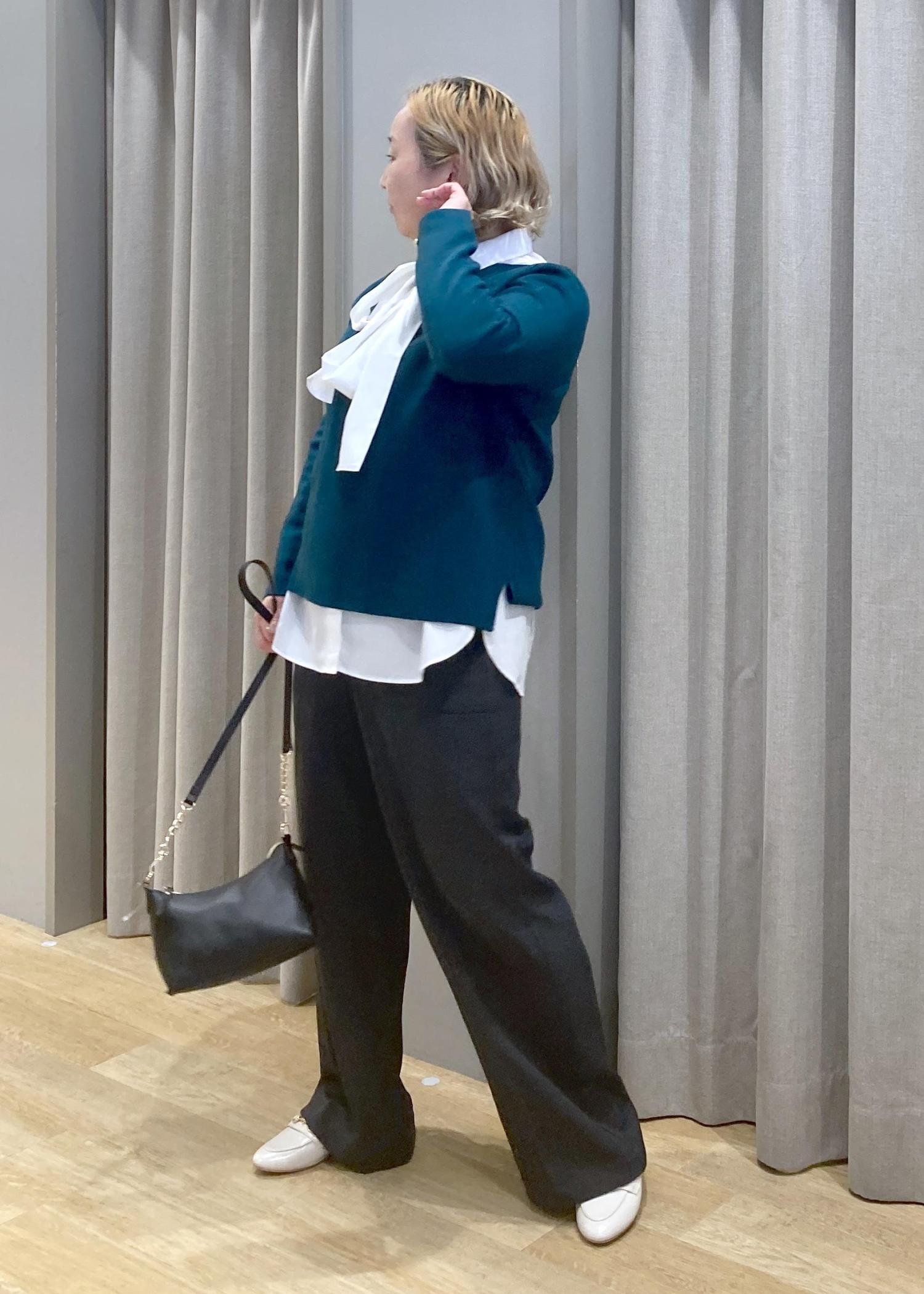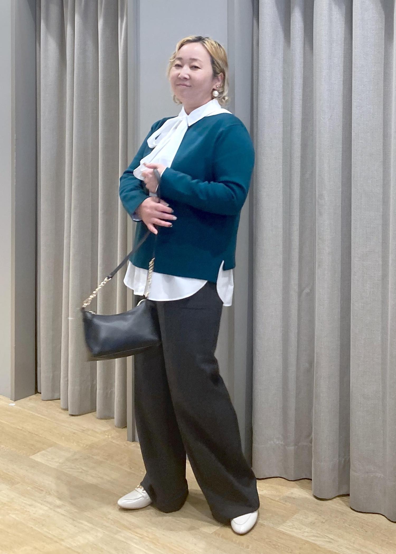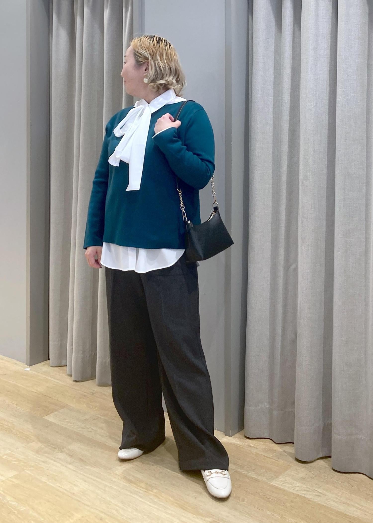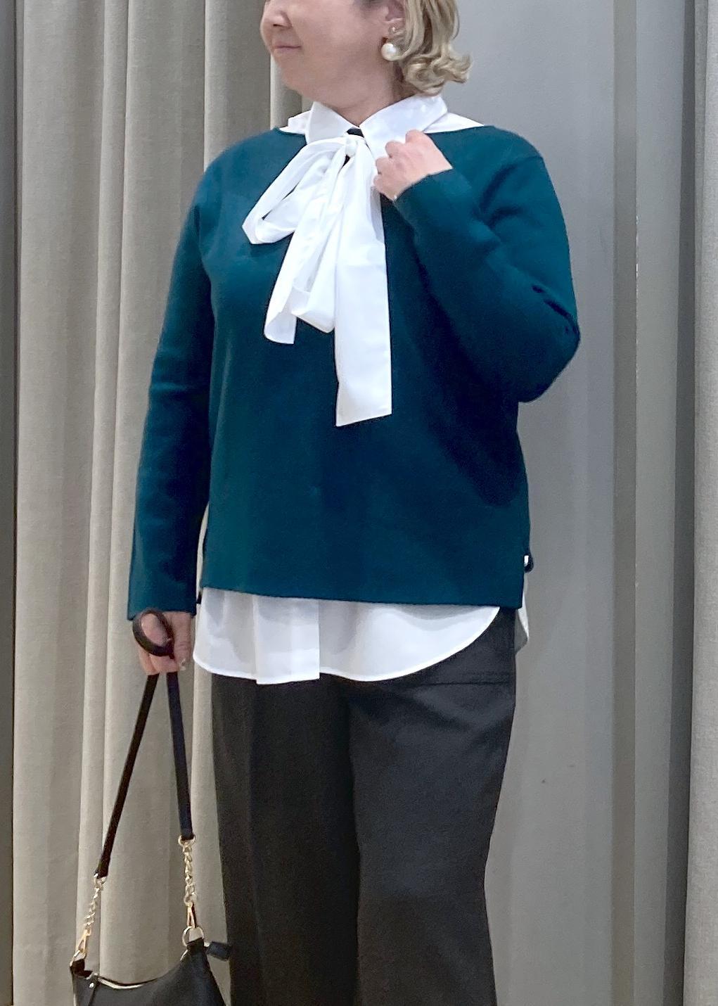 ベーシックなニットに、リボンの棒タイブラウスを合わせて華やかさをプラスしてみました。