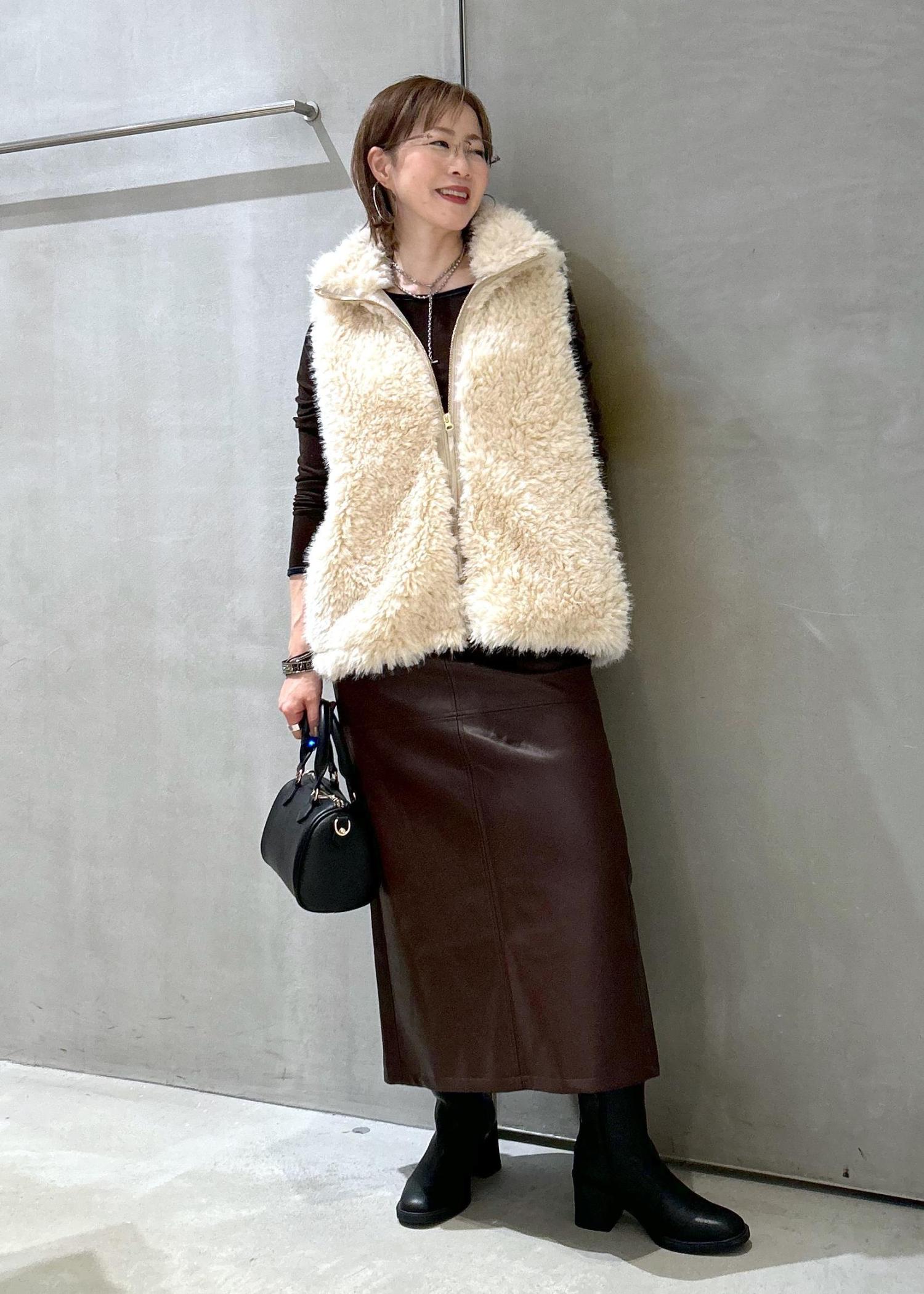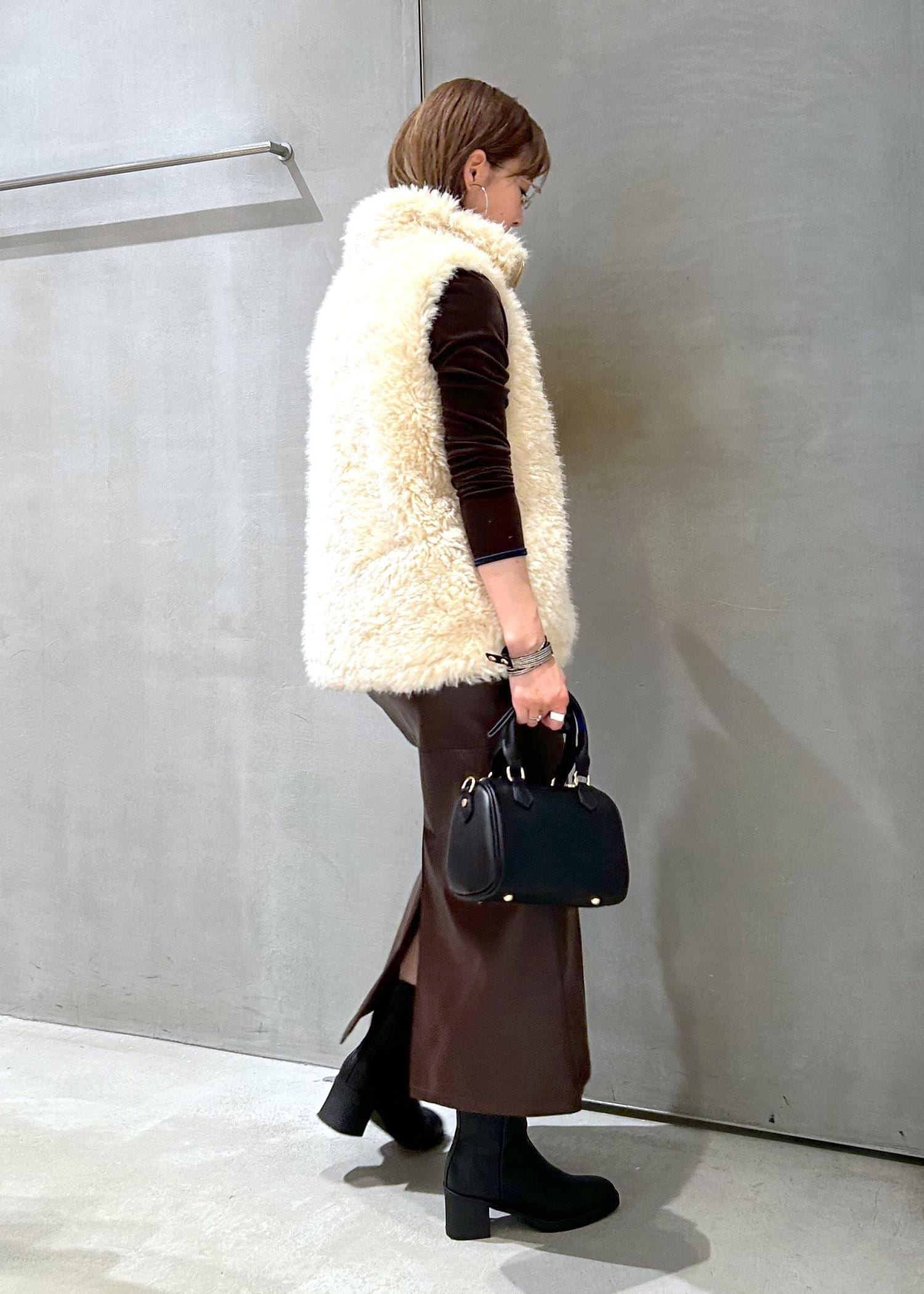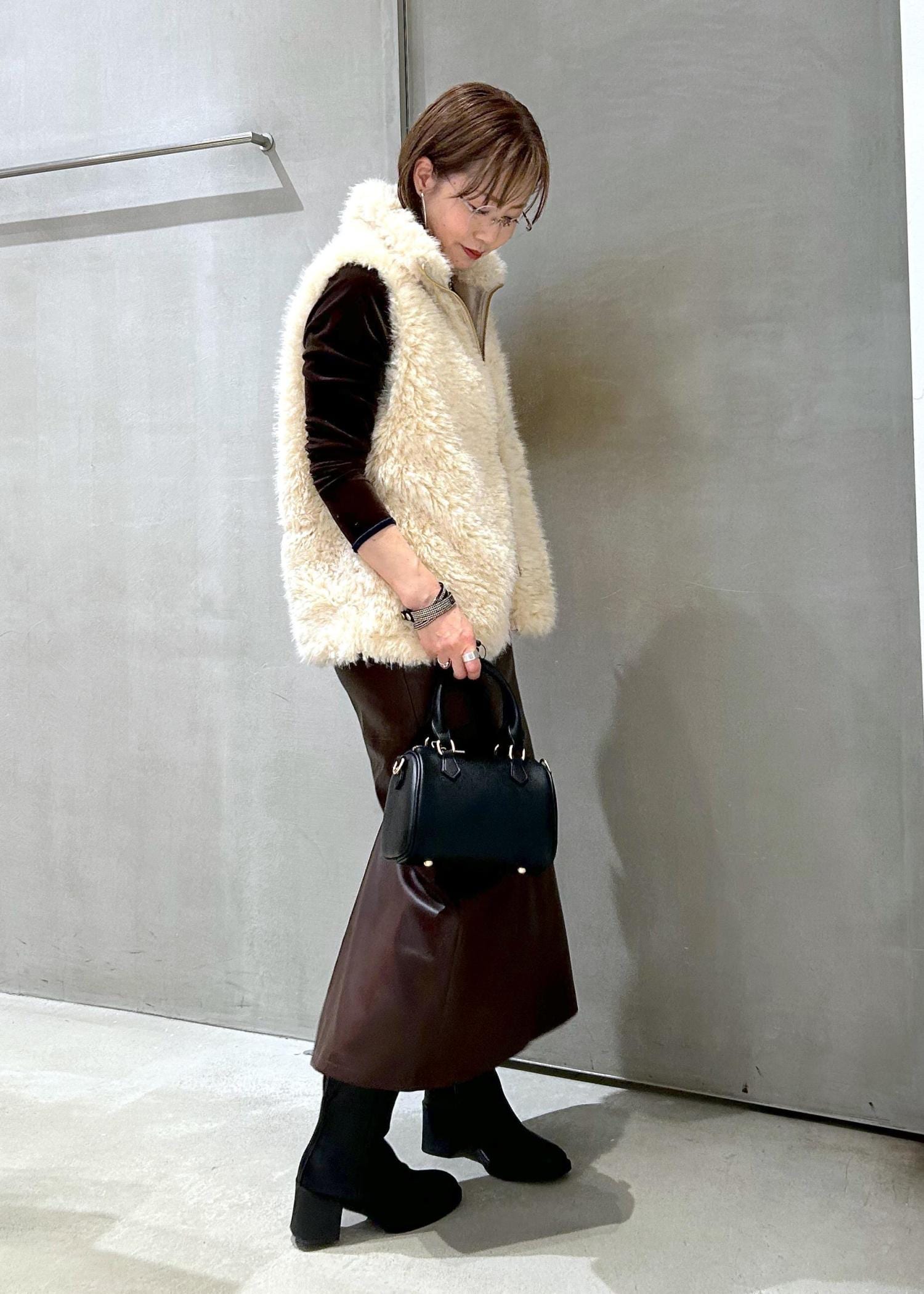 どんなコーディネートにもピタッとはまるファーベストをフェイクレザーのスカートに合わせて、甘辛ミックスな雰囲気で着用しました。