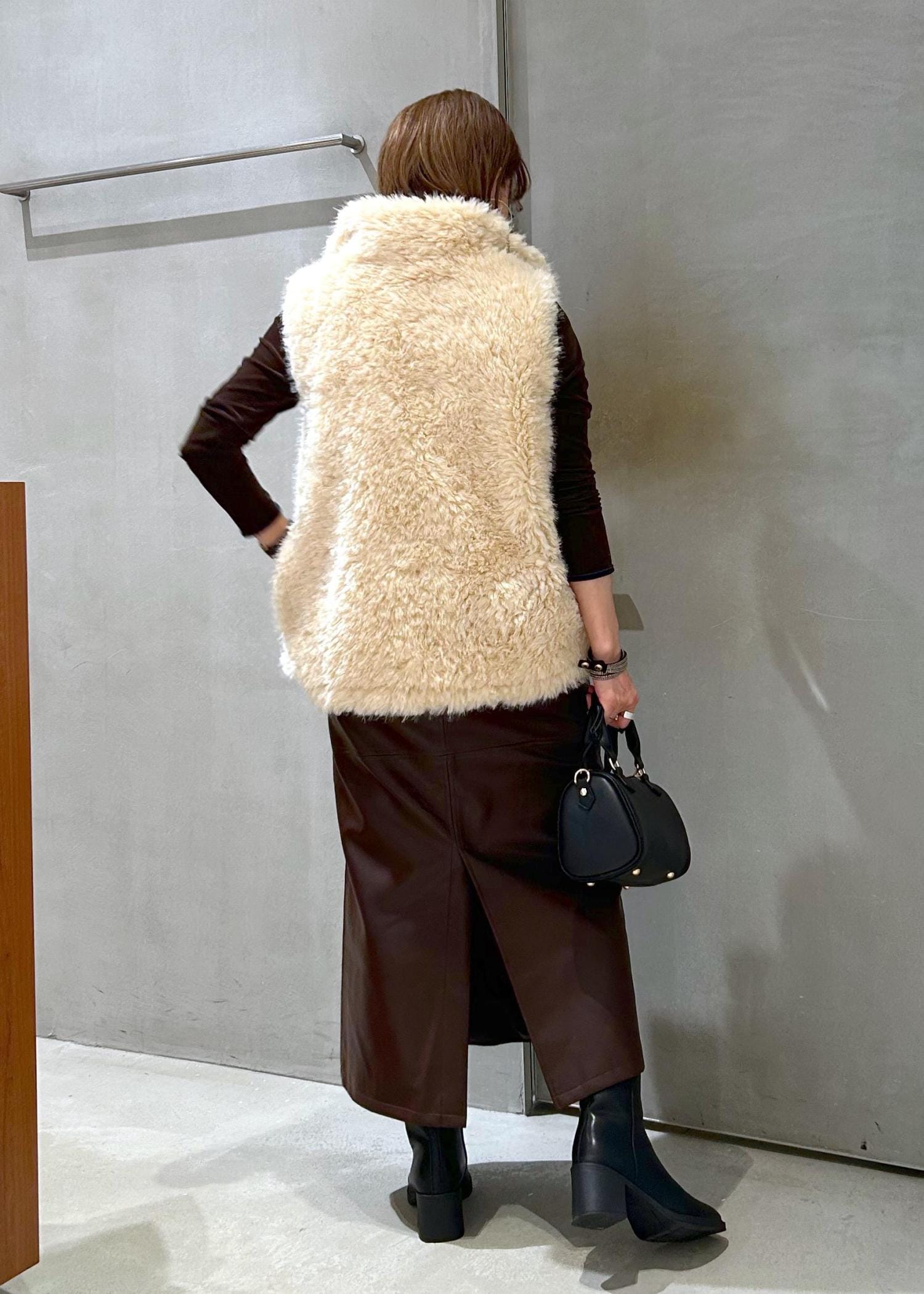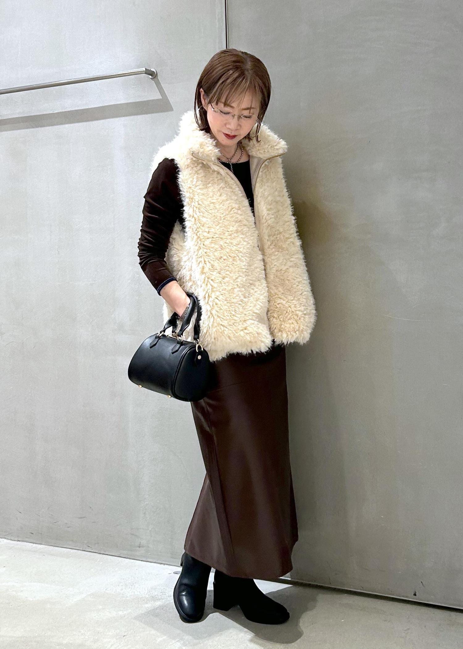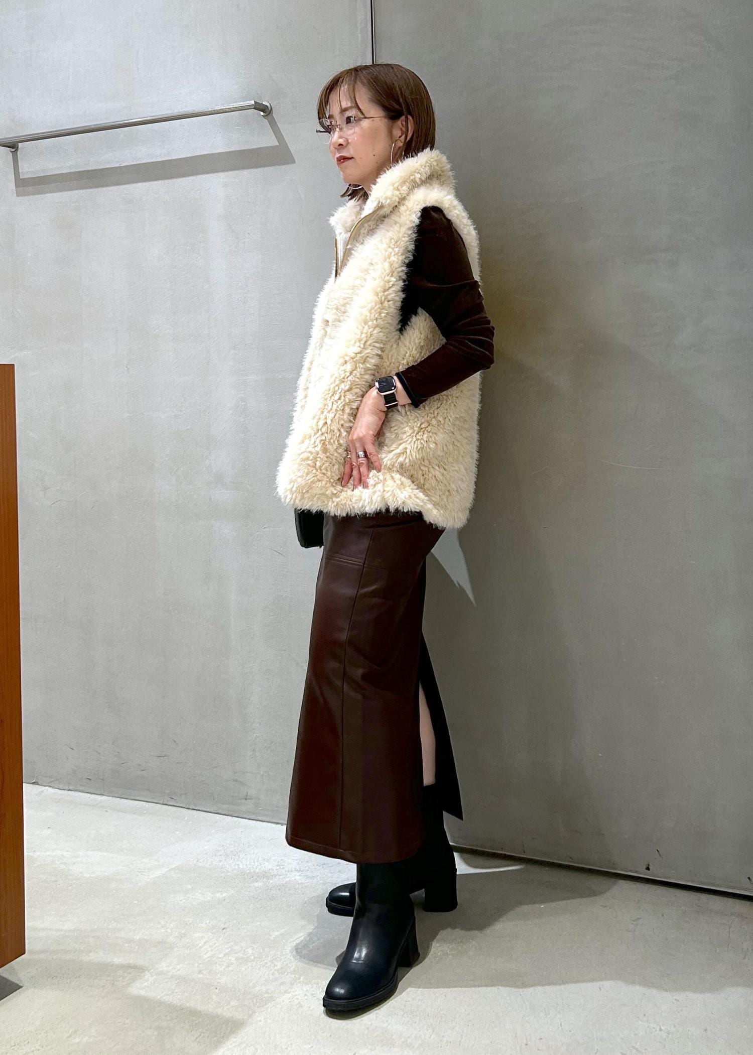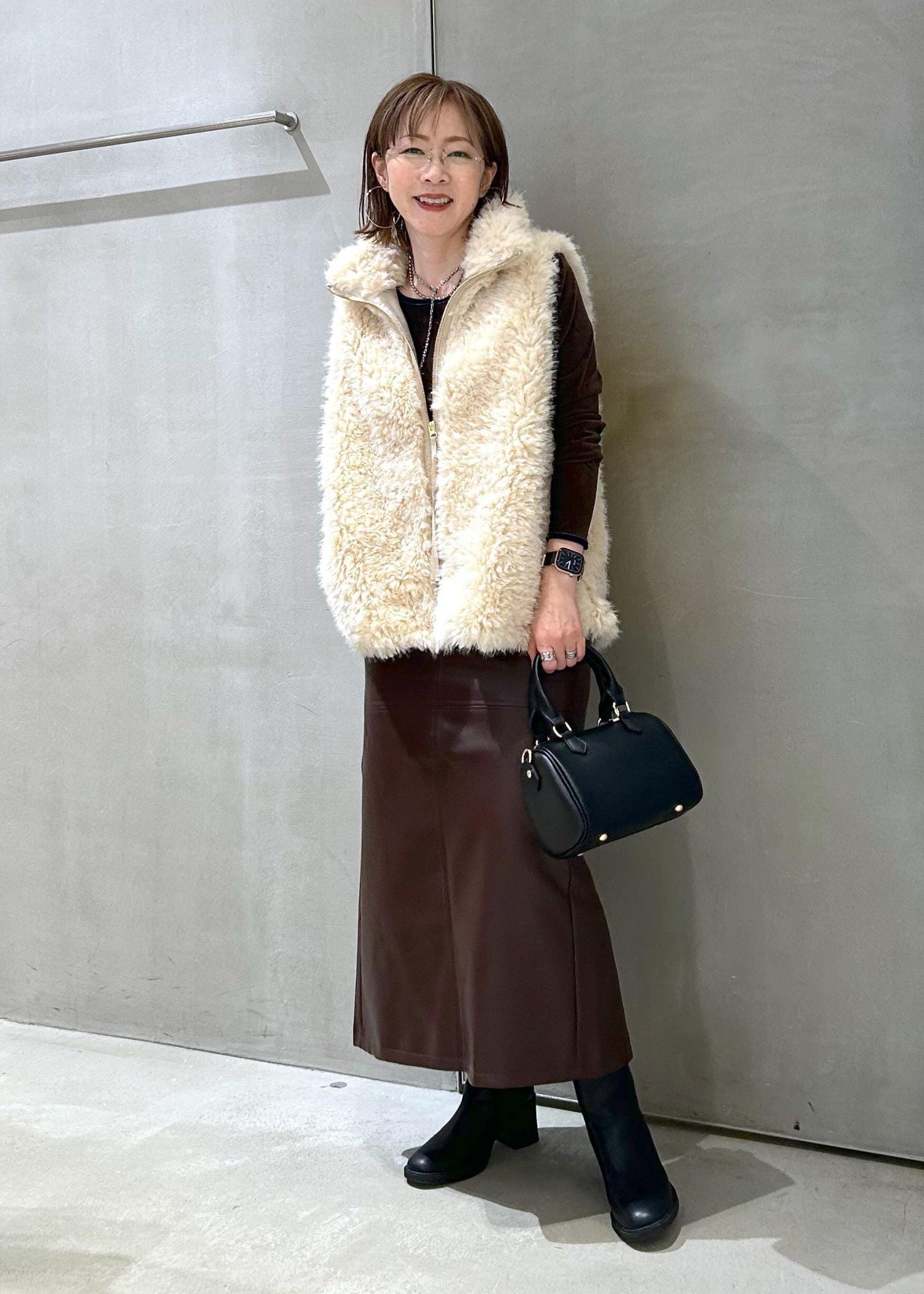 どんなコーディネートにもピタッとはまるファーベストをフェイクレザーのスカートに合わせて、甘辛ミックスな雰囲気で着用しました。