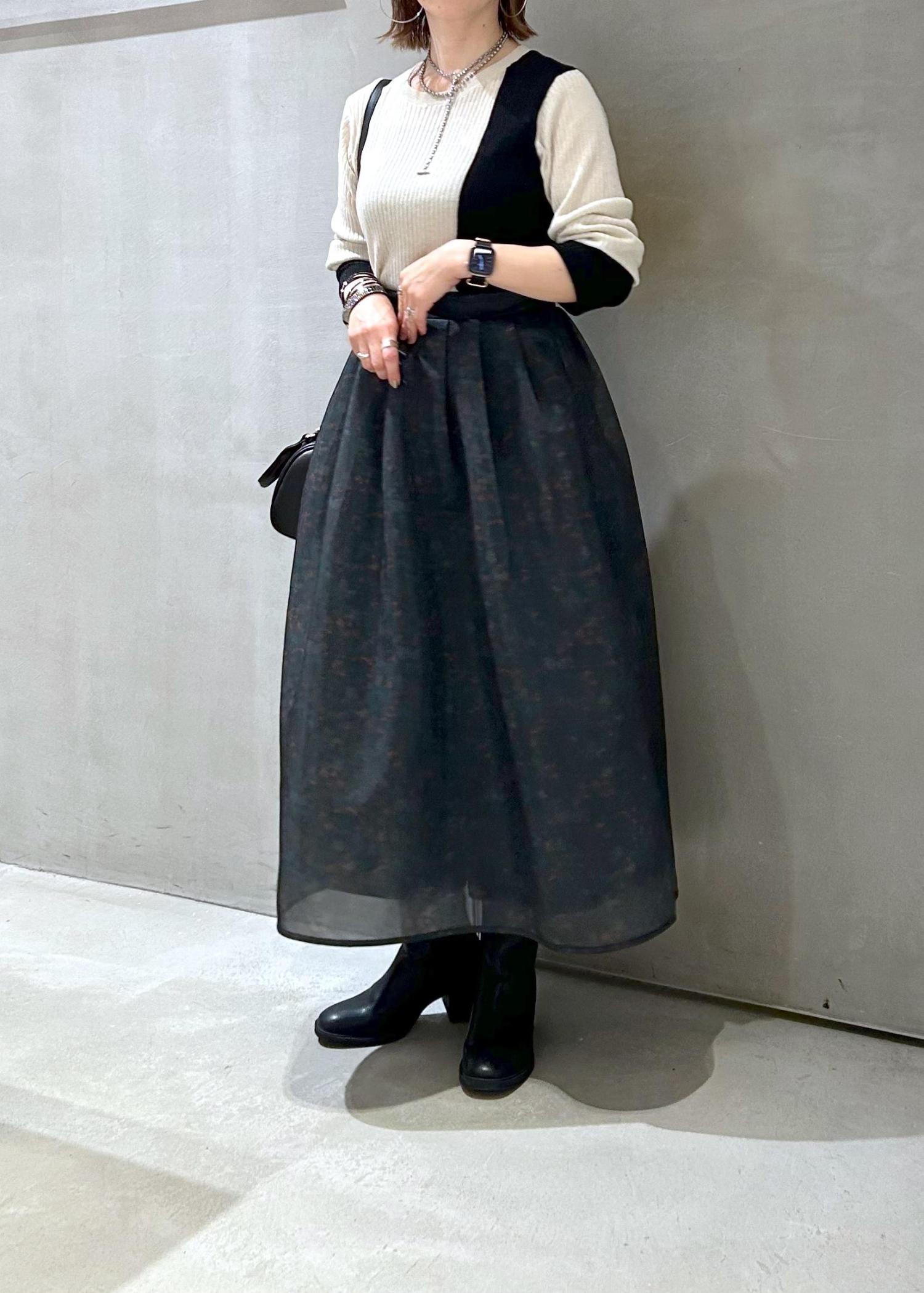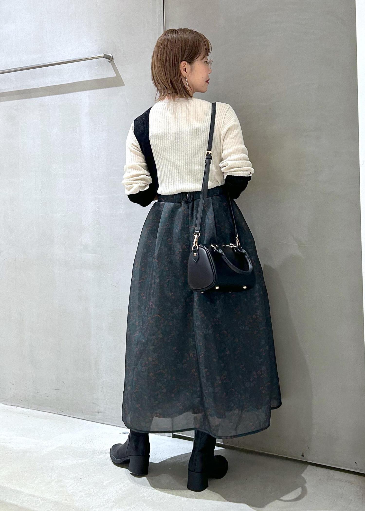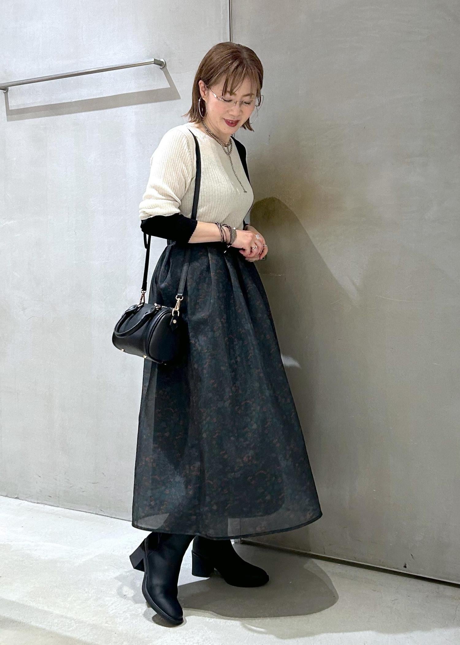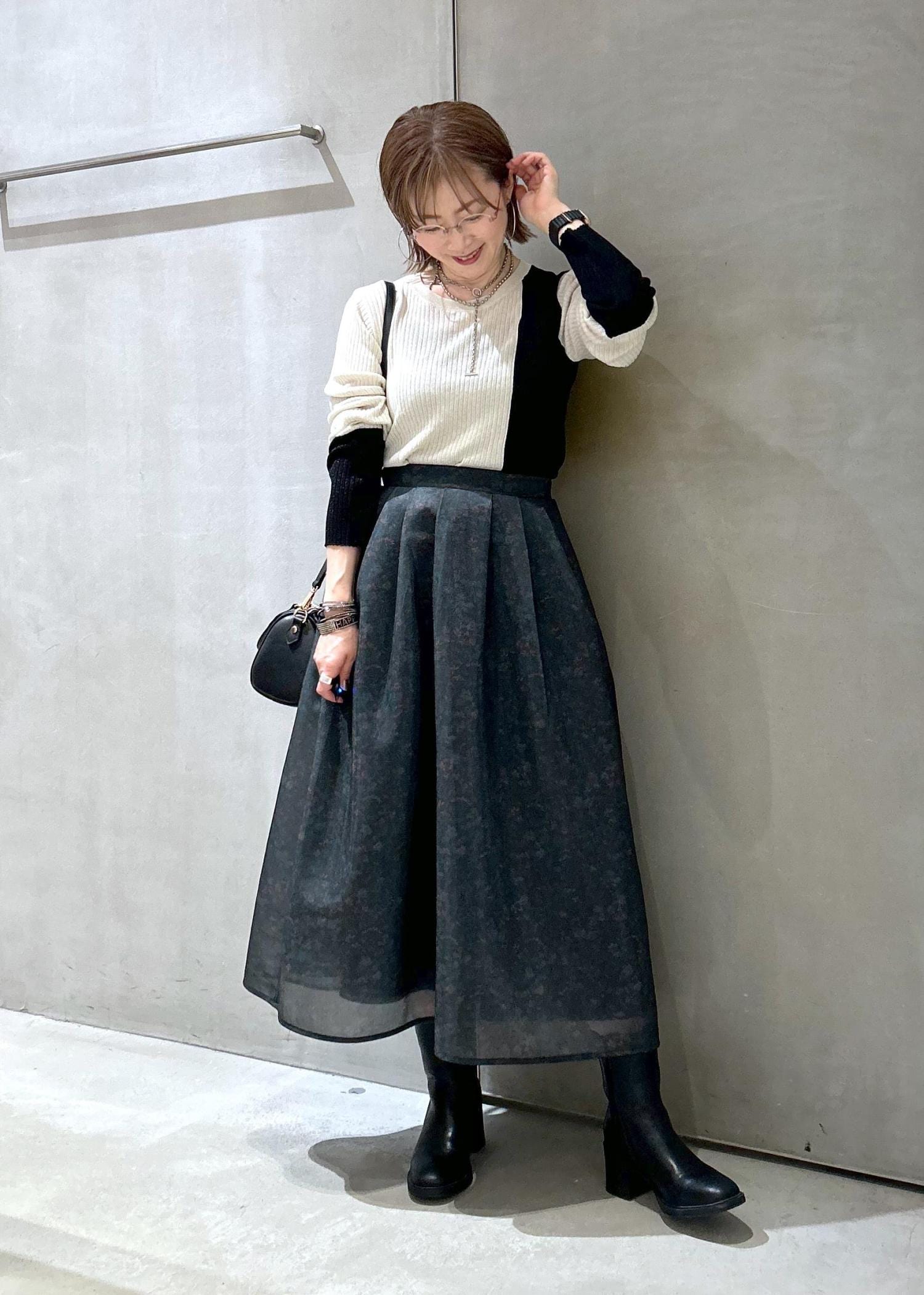 ラメが華やかな印象のニットをボリューミーなふんわりスカートに合わせ、女性らしいお出かけコーディネートにしました。