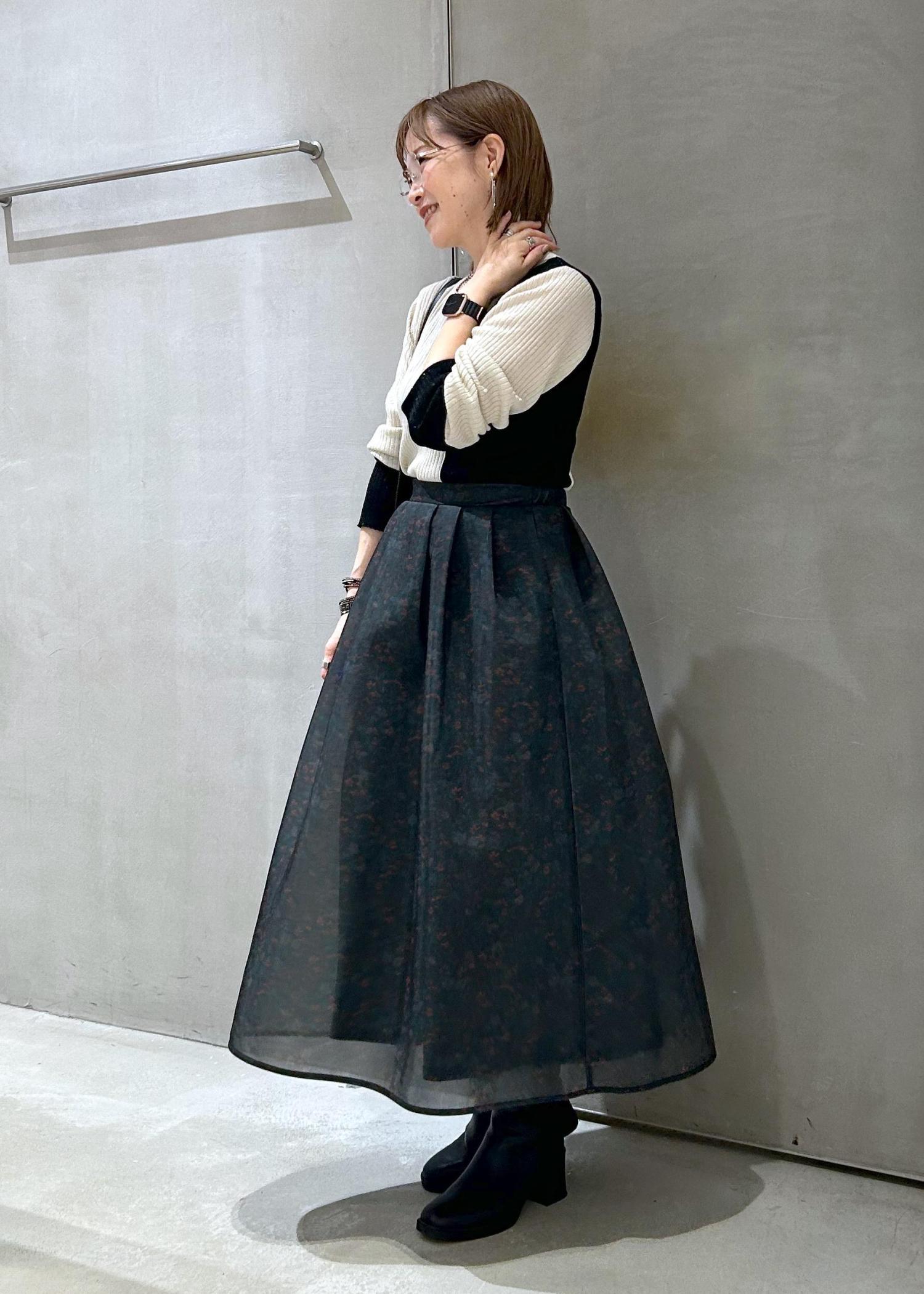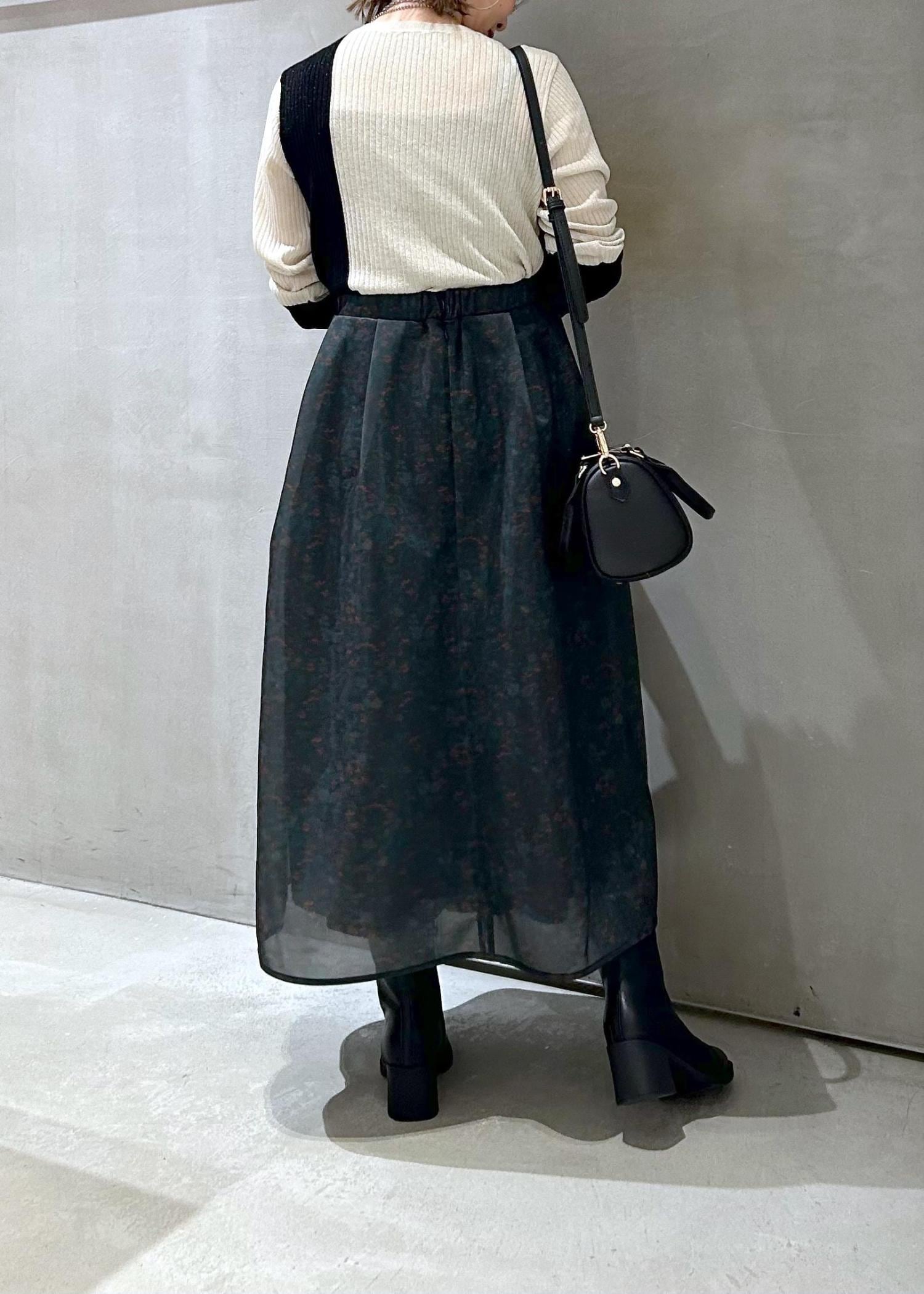 LE CERCLE par ropé【セットアップ対応】シアーダンボールフラワープリントボリュームスカートブラック系 / F¥7,920レビューウエストのフロント部分にタックが入っていますので、お腹周りの体型カバーができます。