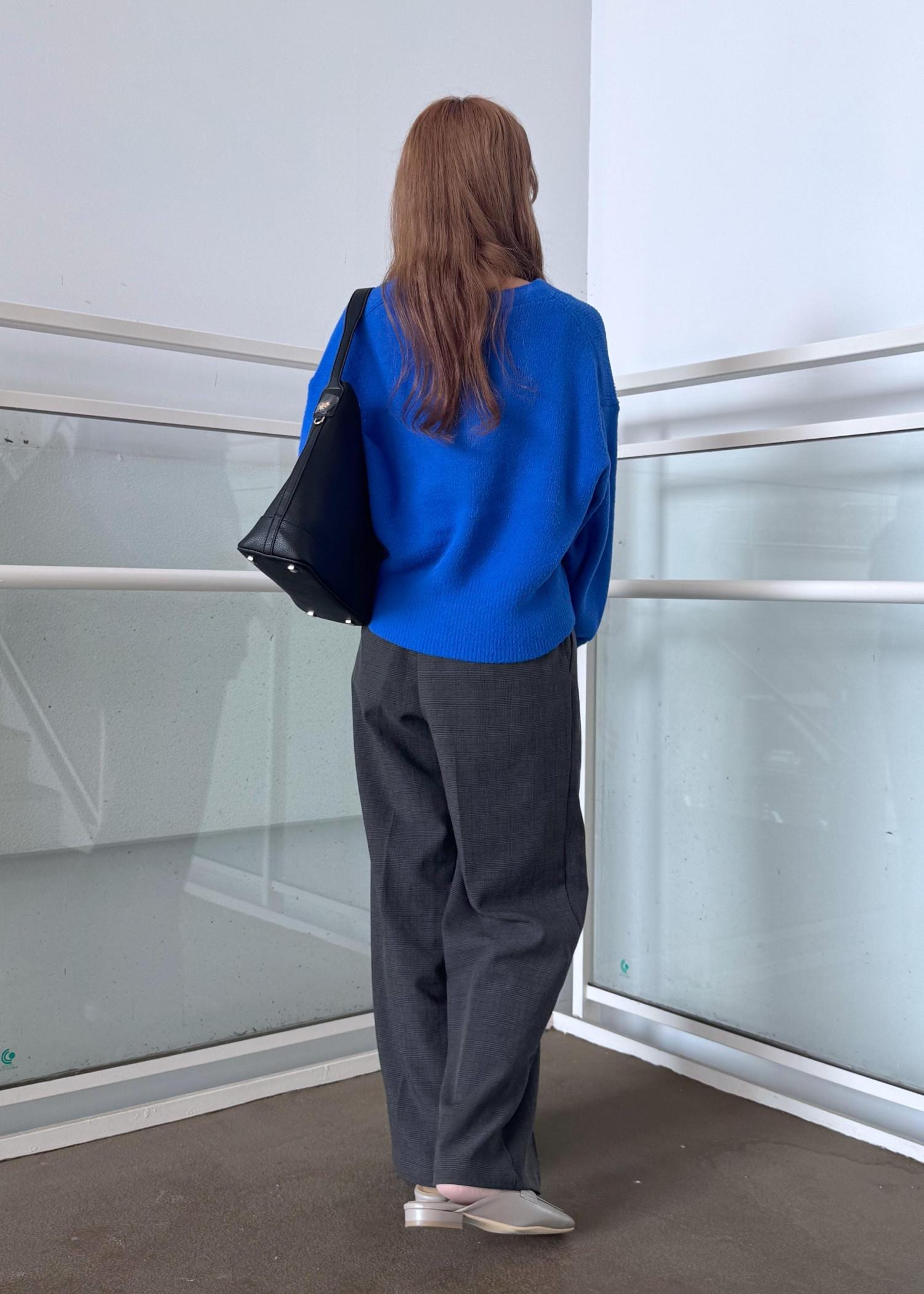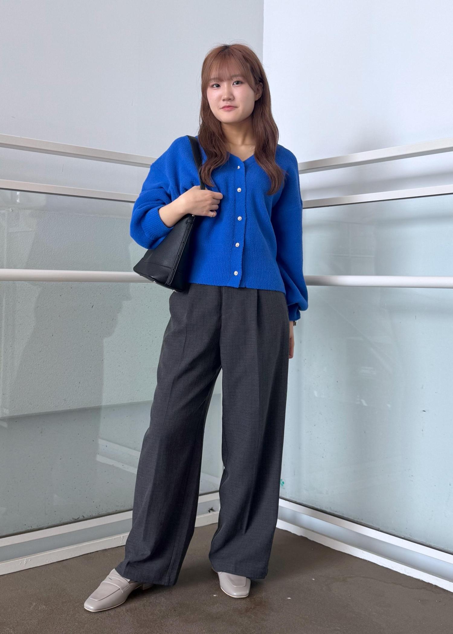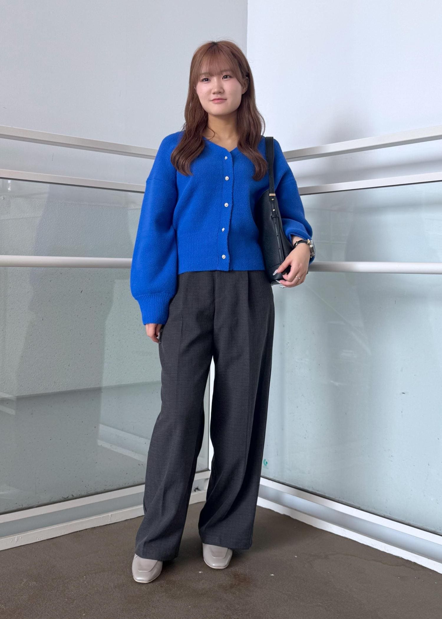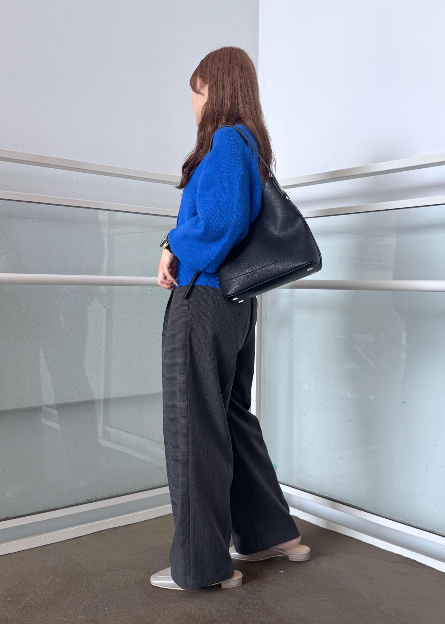 今回はブルーを着用し、パンツや小物はキレイめにし、カジュアルすぎないコーディネートを組みました!