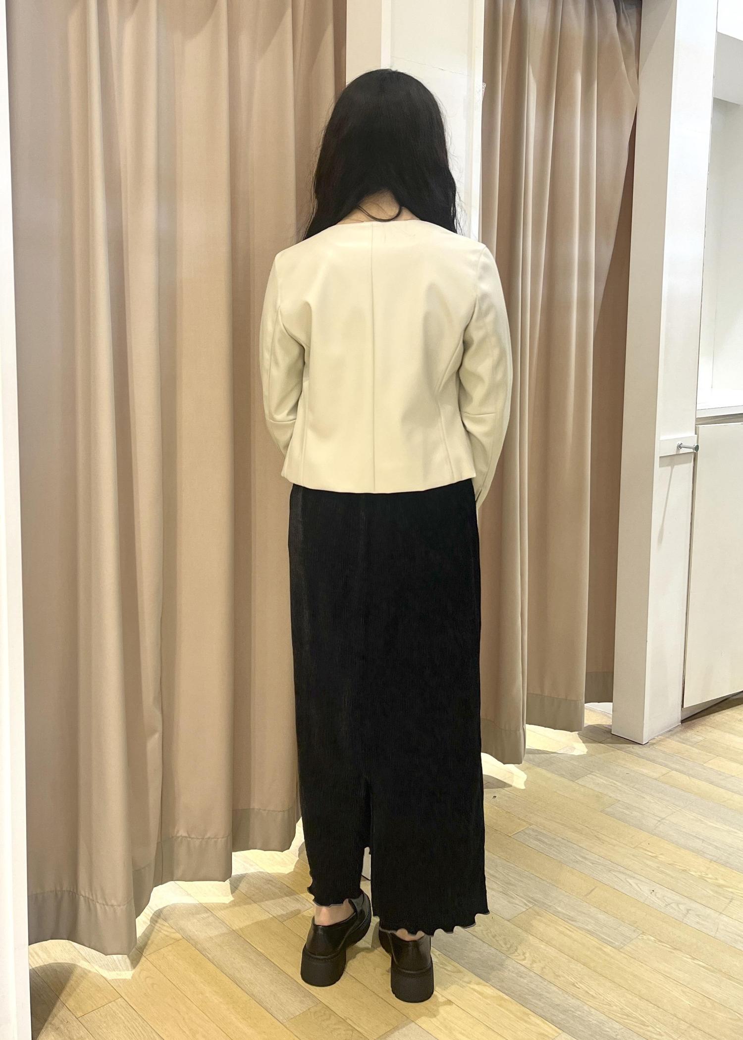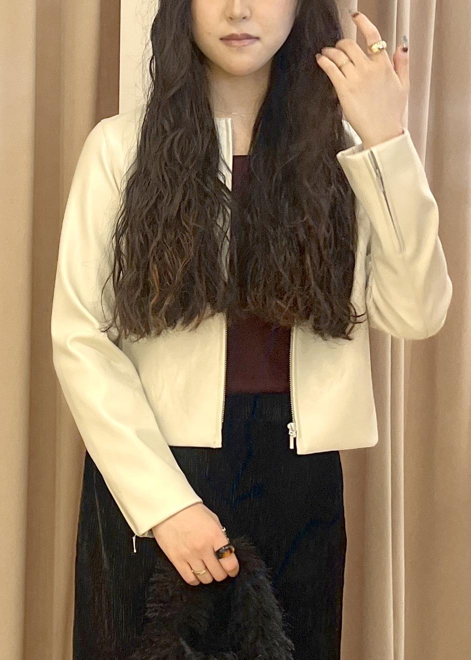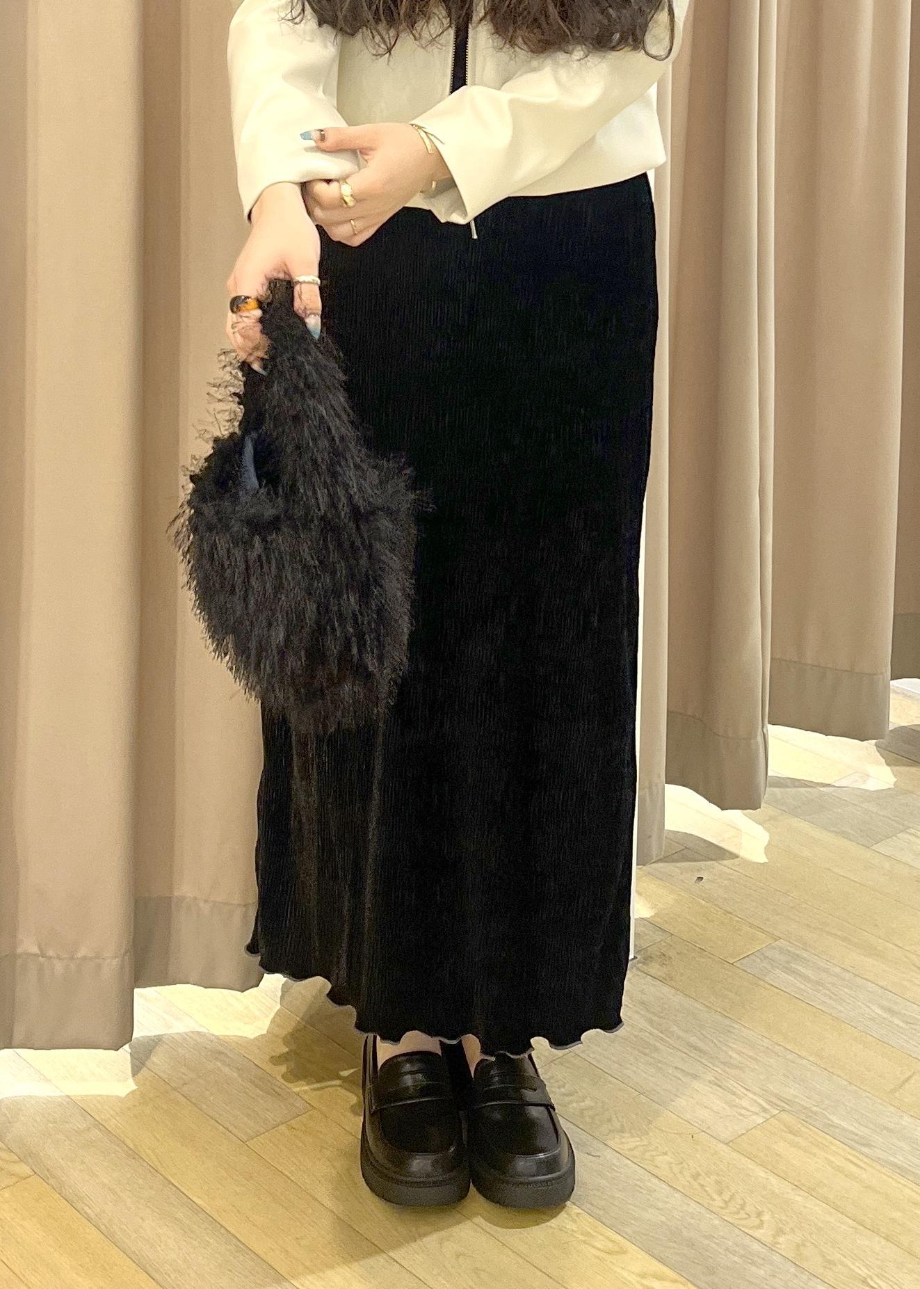レザー素材のライダースにベロア素材のスカートを合わせて大人かわいいコーデを組みました♩