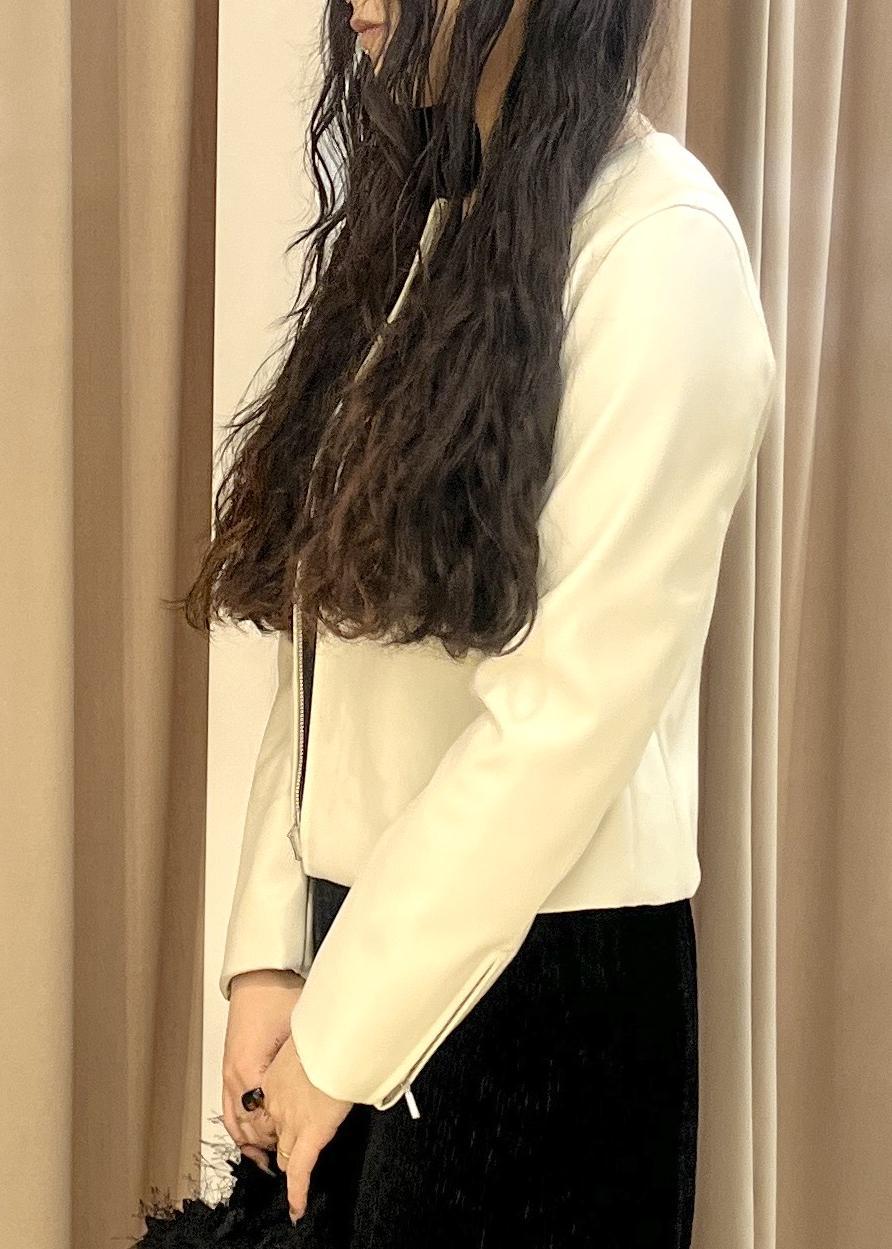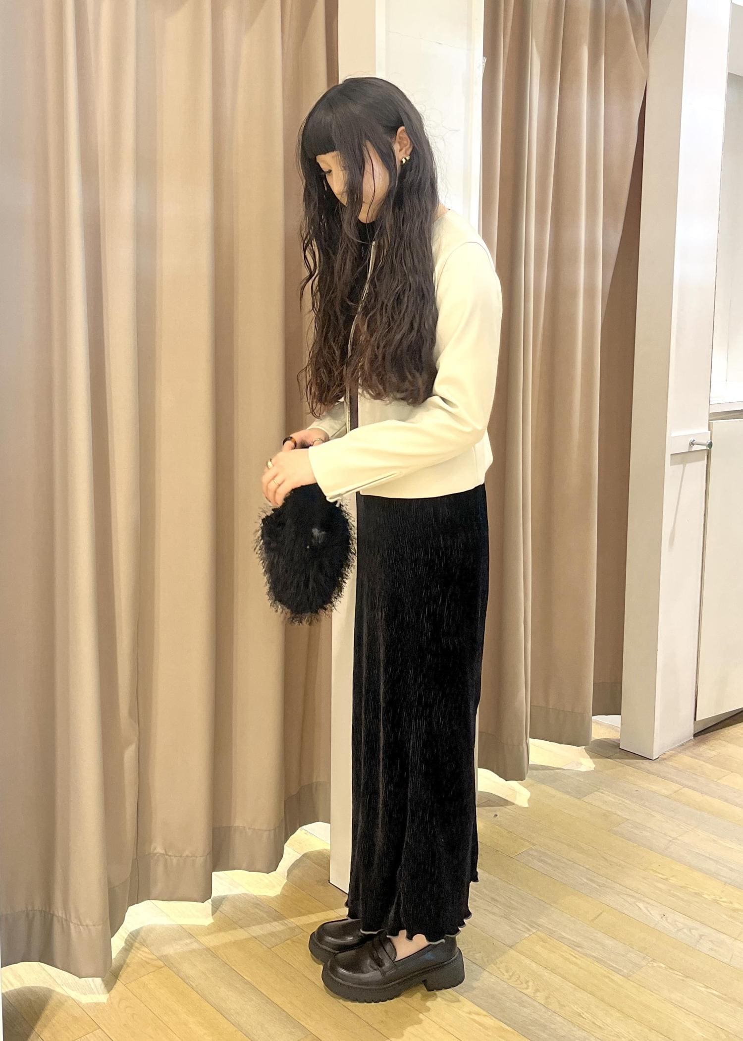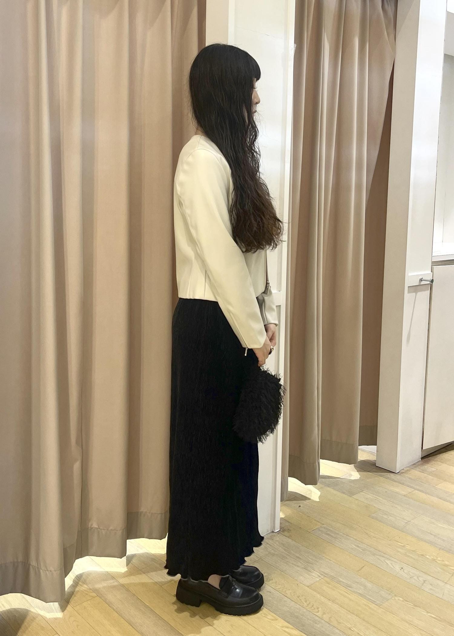 レザー素材のライダースにベロア素材のスカートを合わせて大人かわいいコーデを組みました♩