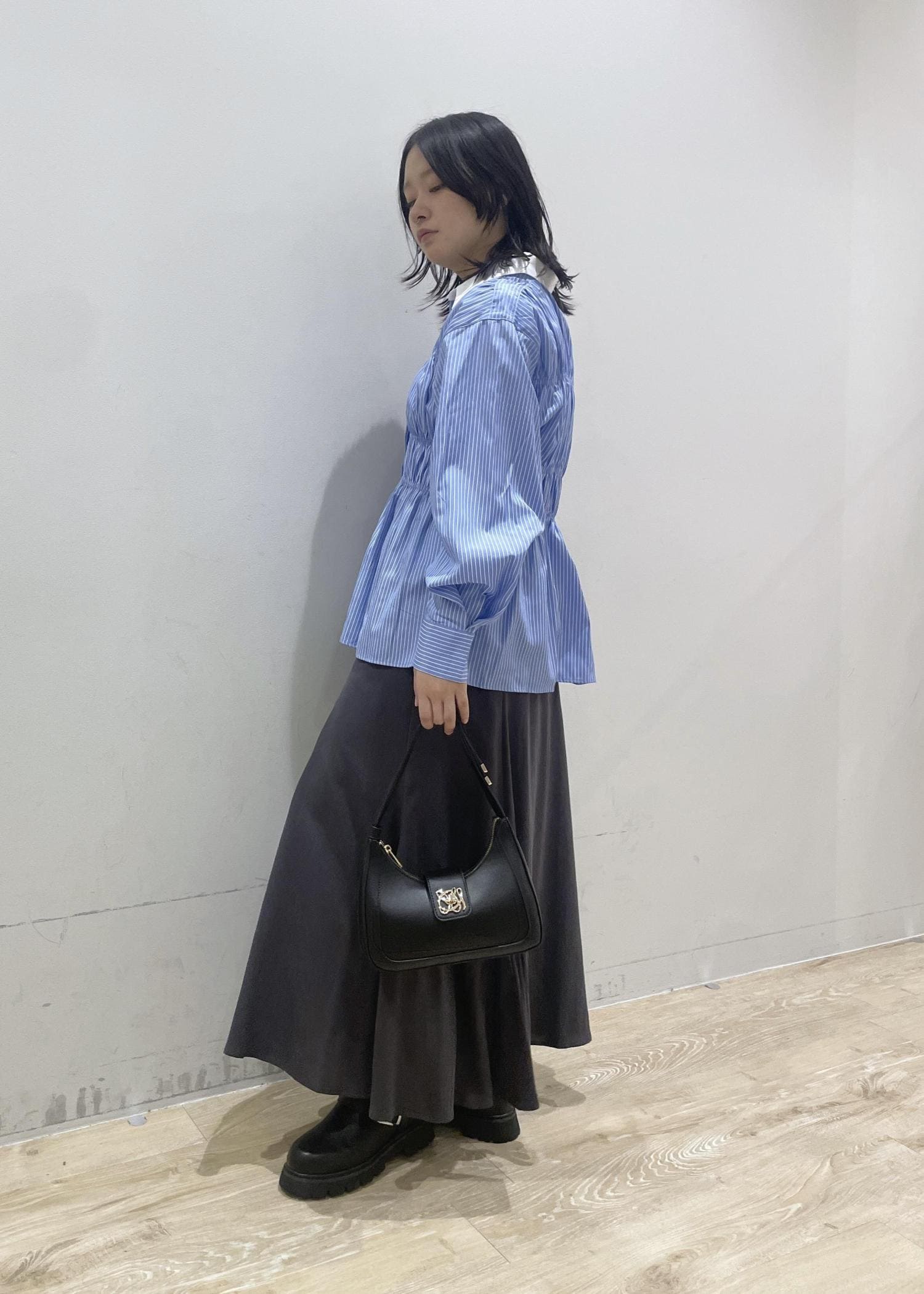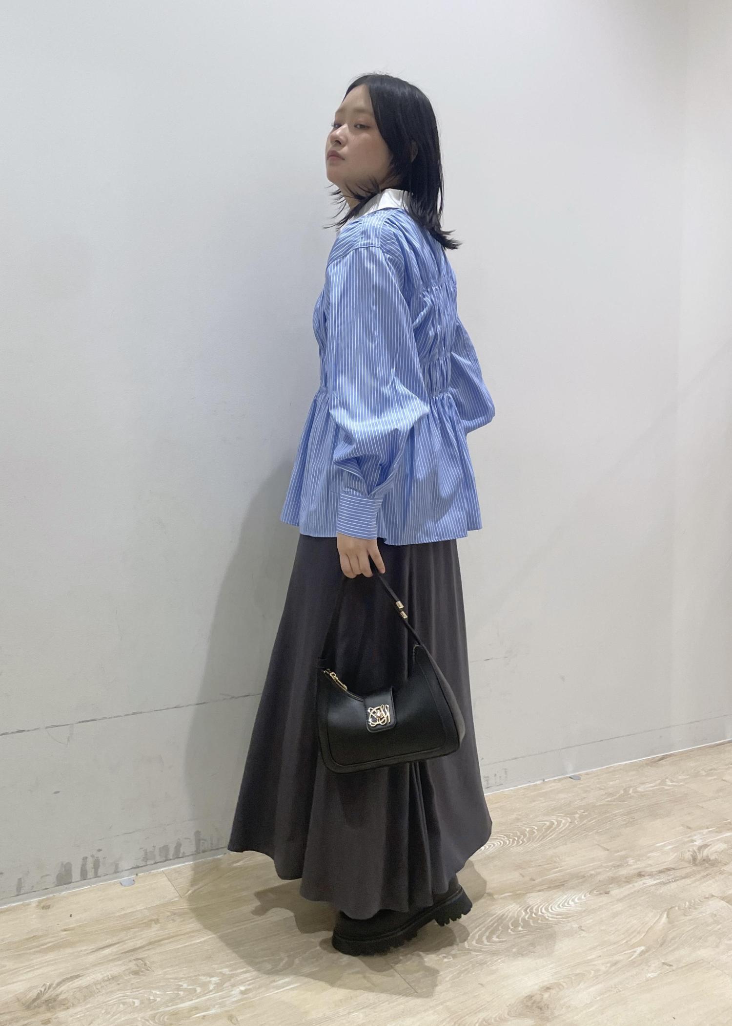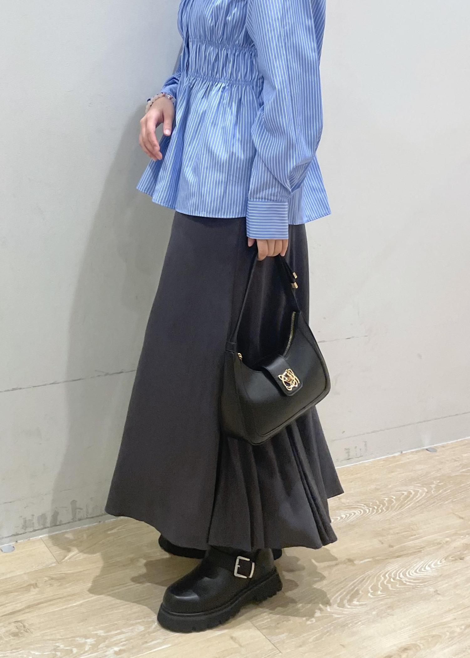 下半身のフレアスカートの落ち感と、上のシャツのボリューム感が相性抜群です!!
