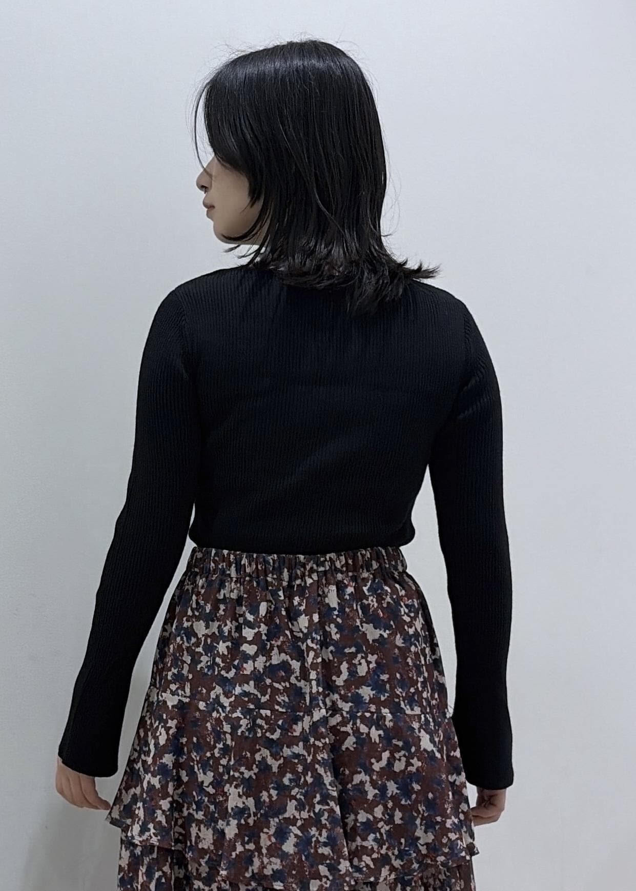 シックな黒のトップスが花柄スカートの存在感を引き立て