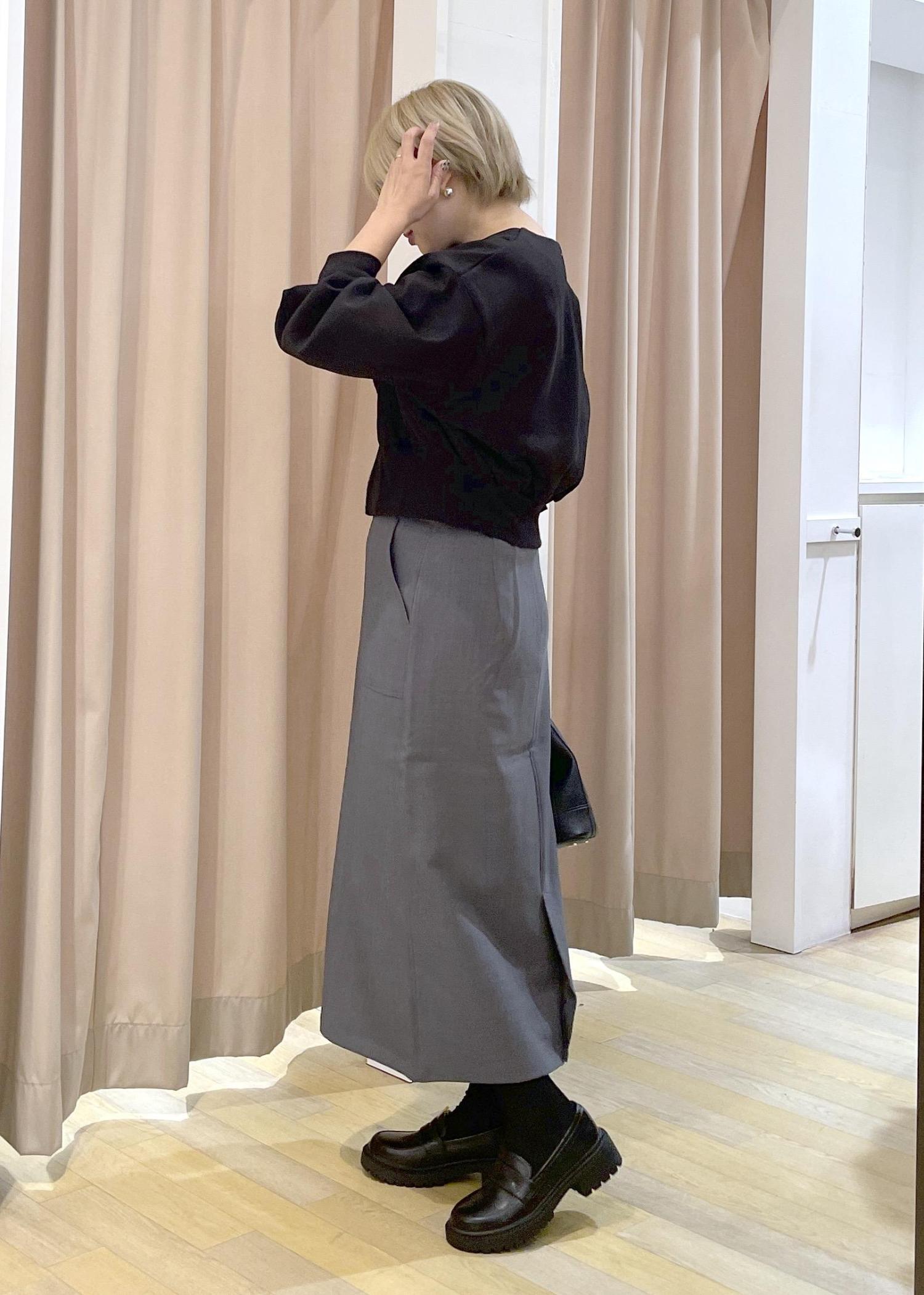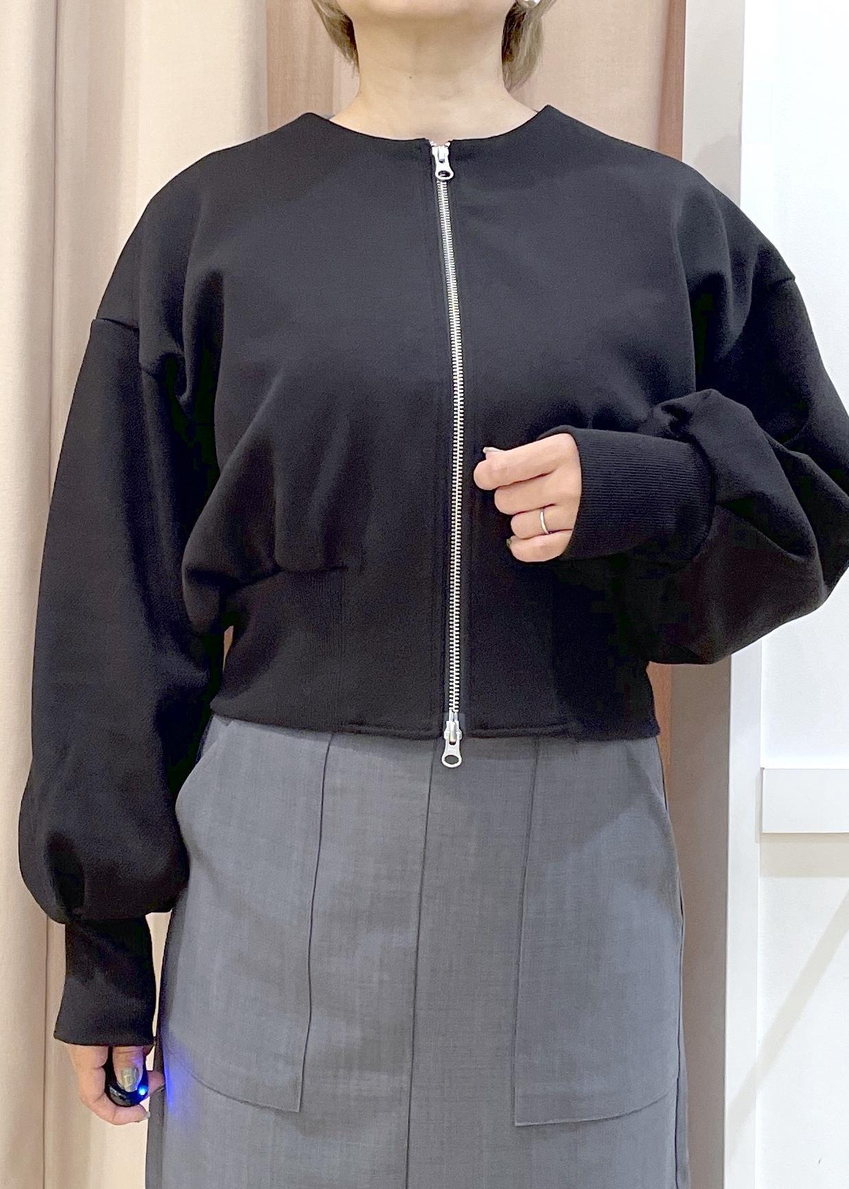 W-ZIPのブルゾン風カーディガンにキレイめIラインスカートを合わせたキレイめコーデです。