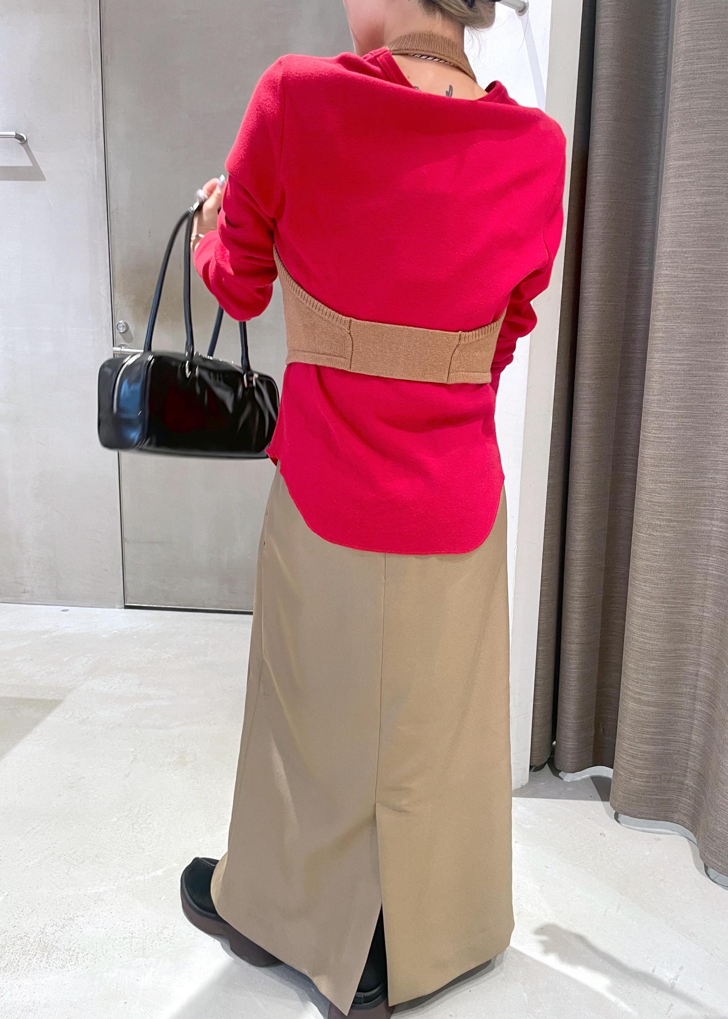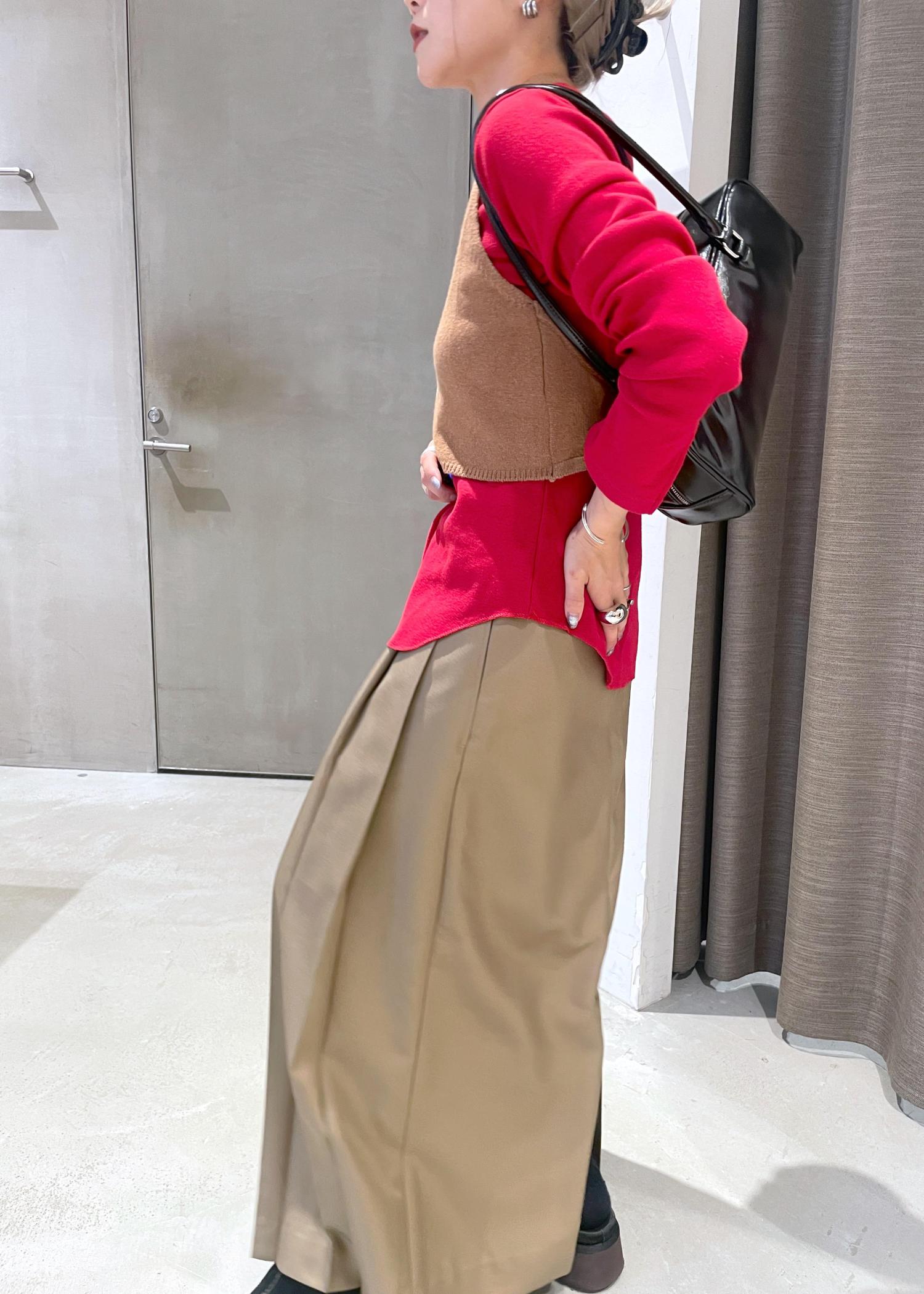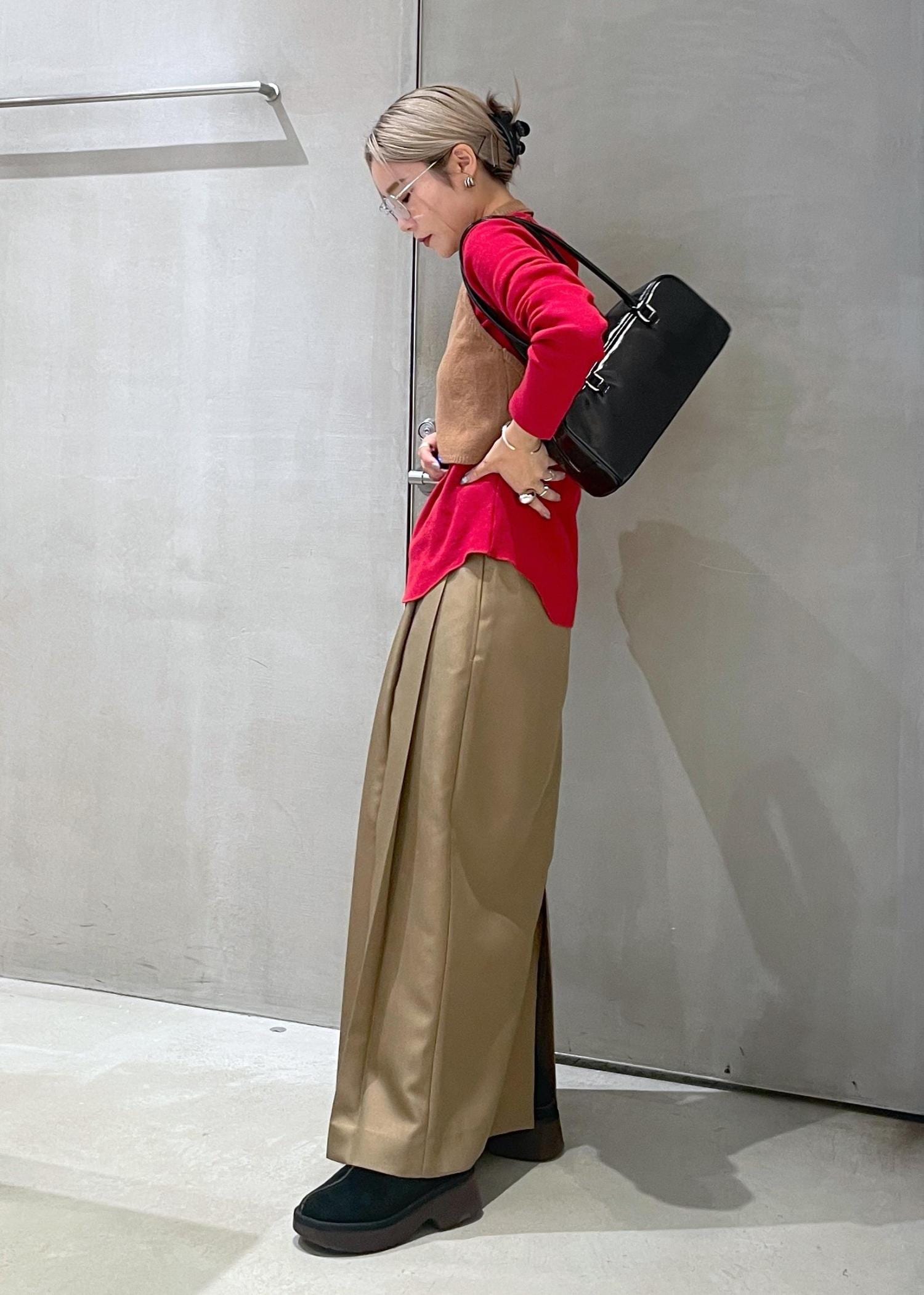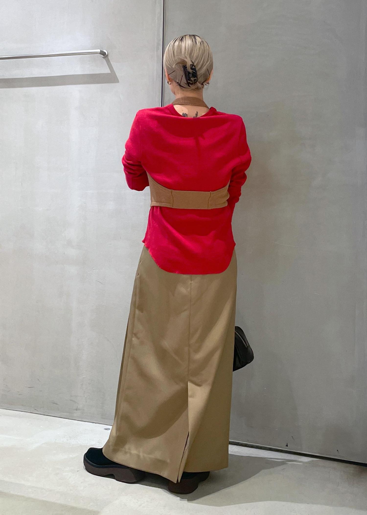 今回Tシャツを着ましたが、丈が長くラウンドしている為、ボトムに入れずに裾のスリットを見せたコーディネートにしています!