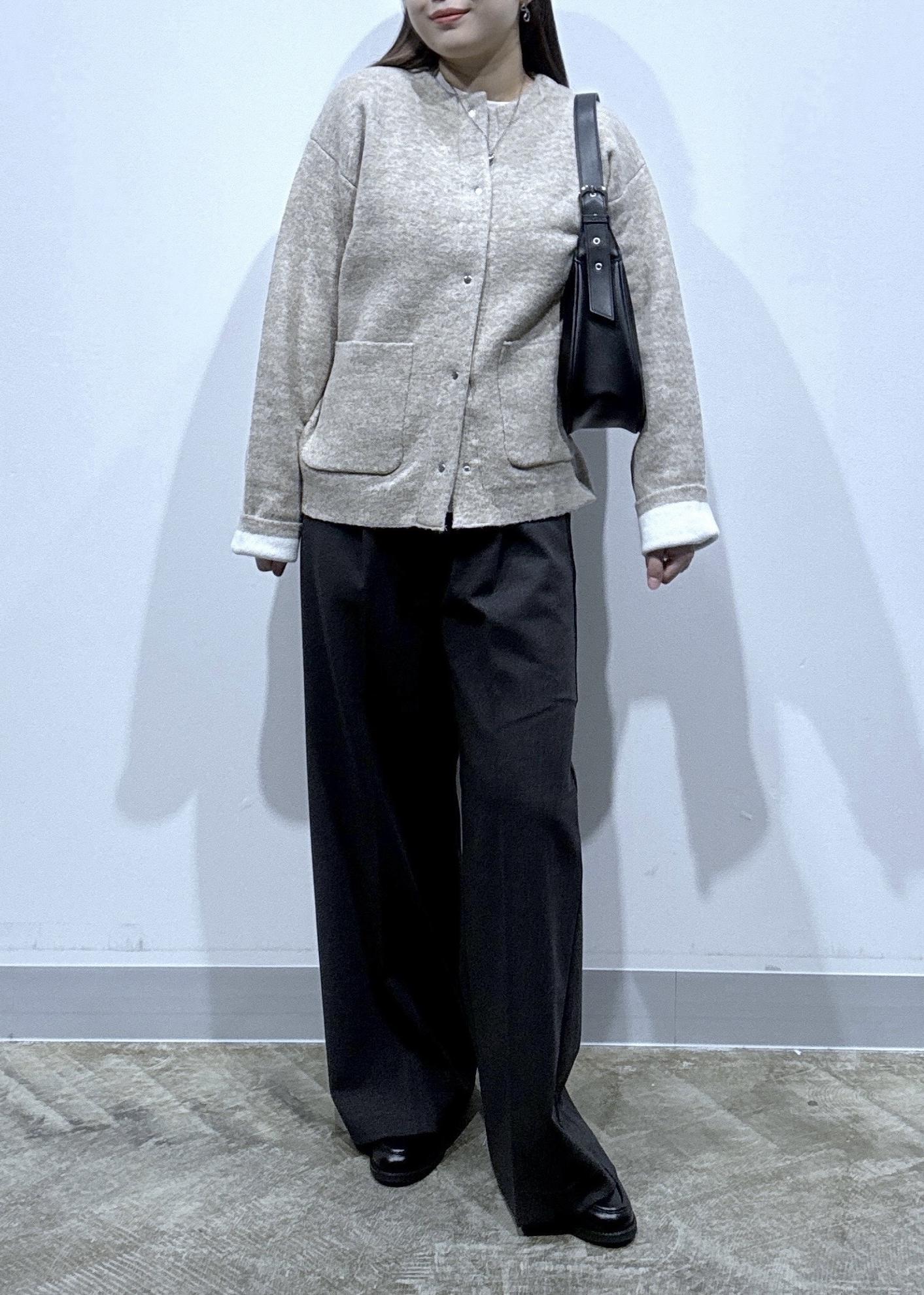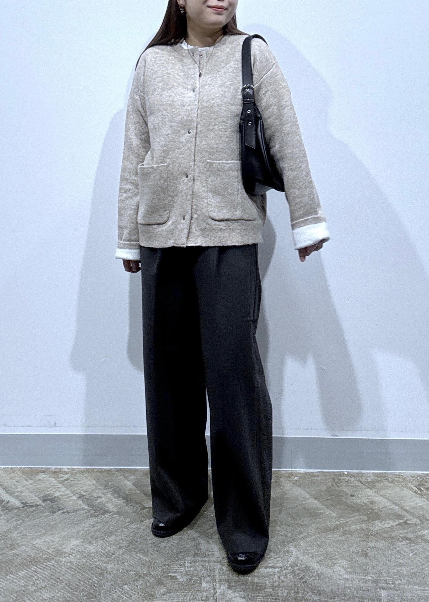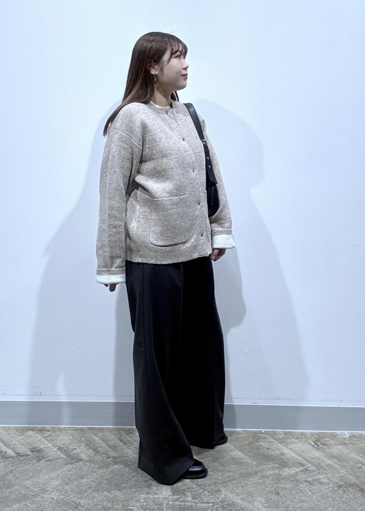 首元のスッキリ感と袖口のバイカラーが大人っぽ可愛いダブルフェイスカーディガンコーデ