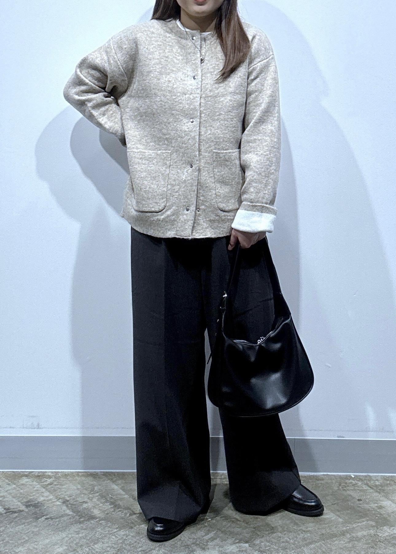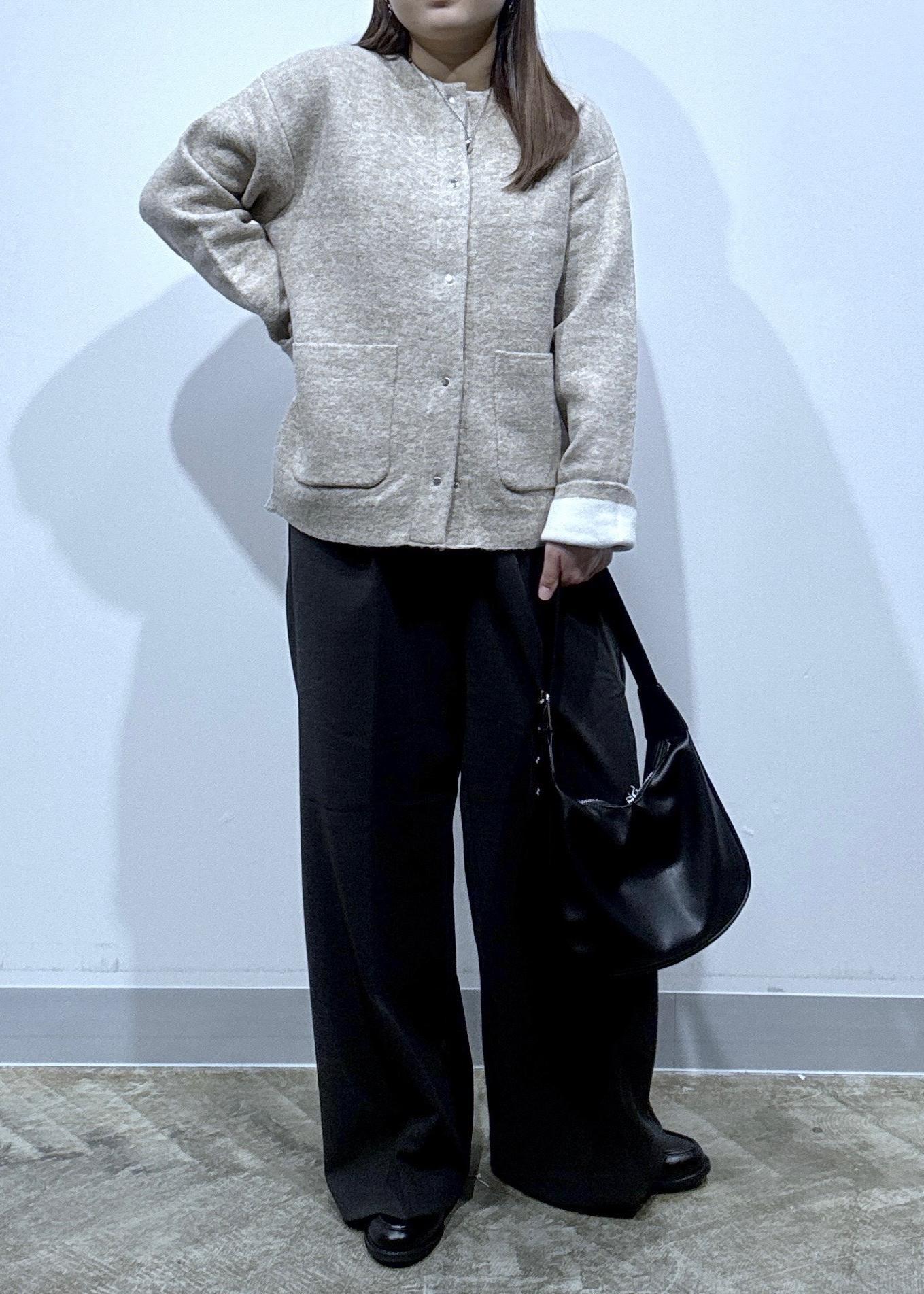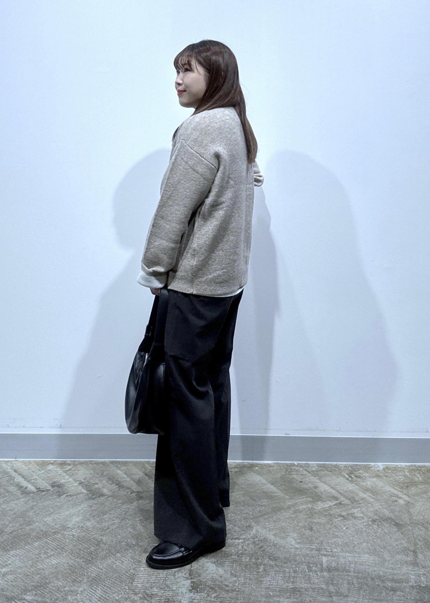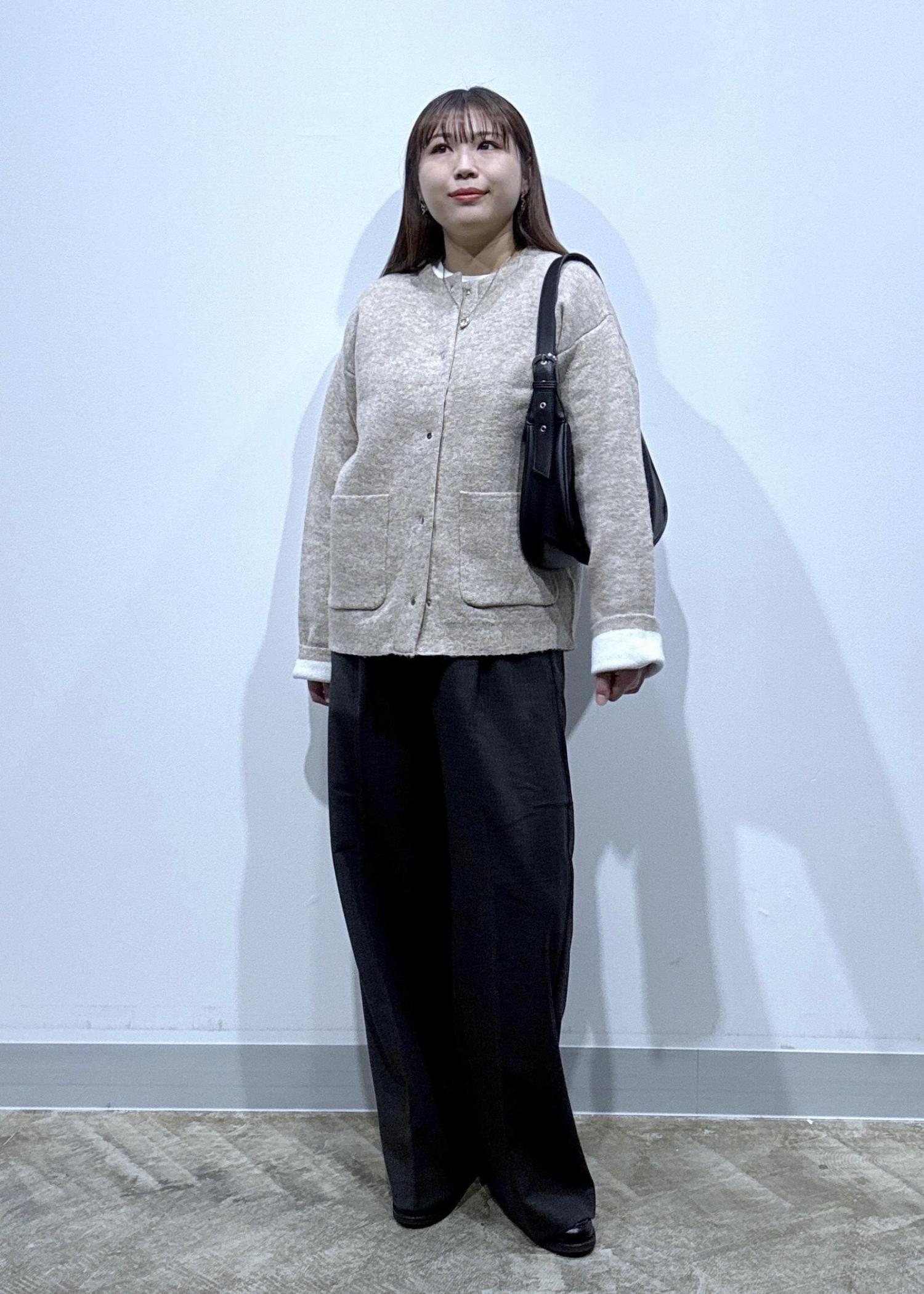 首元のスッキリ感と袖口のバイカラーが大人っぽ可愛いダブルフェイスカーディガンコーデ