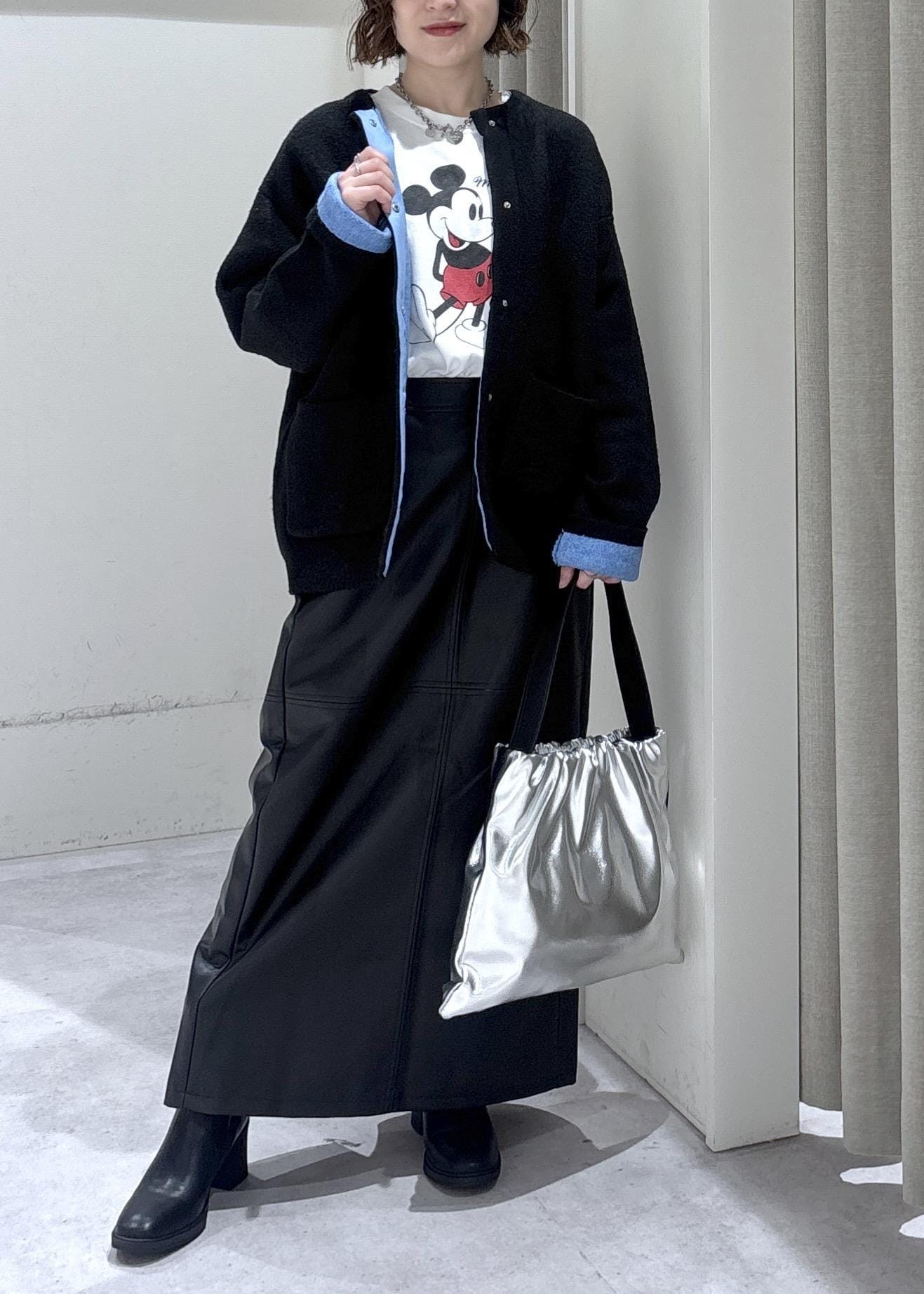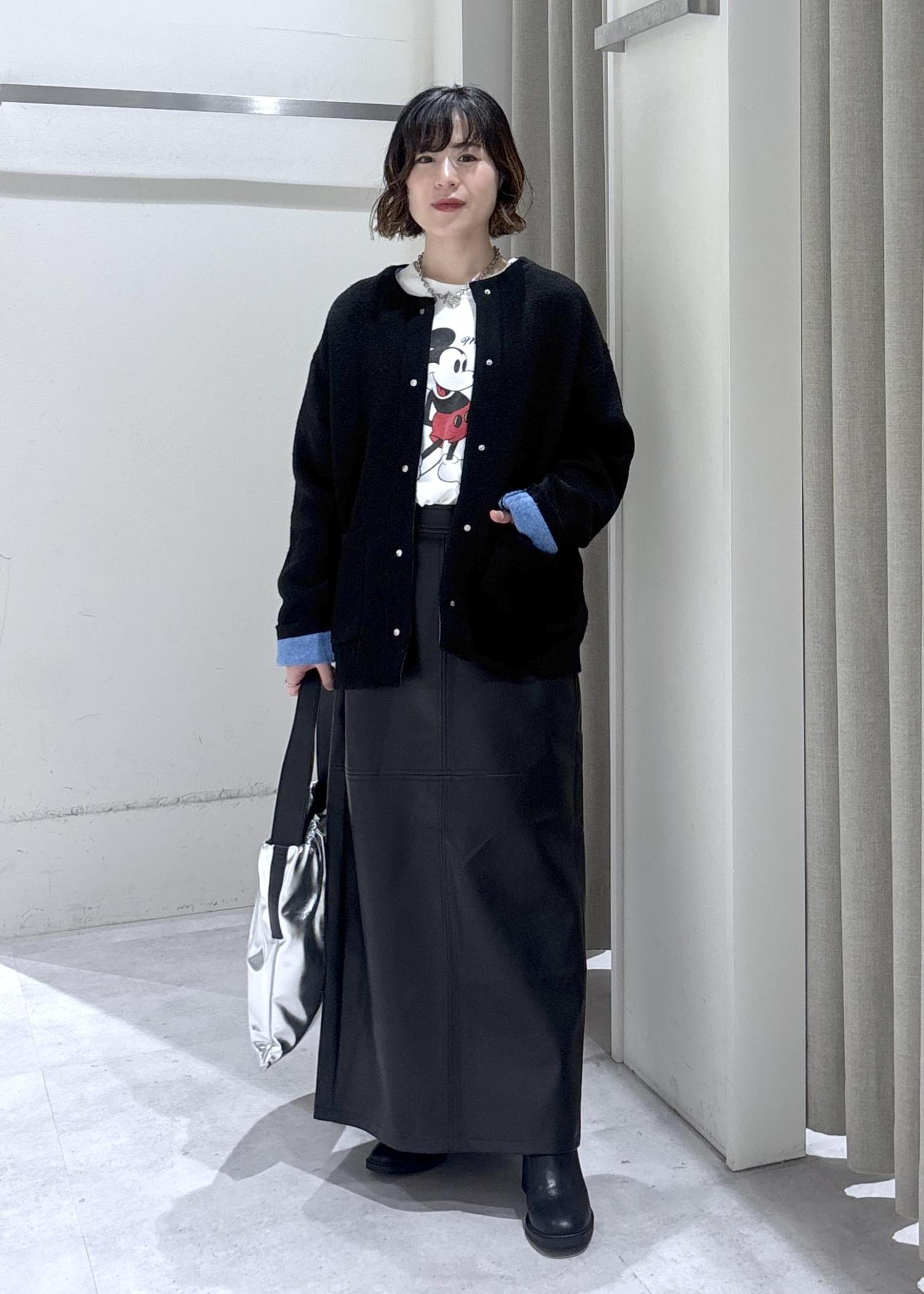 袖を折り返すと配色が目を惹くカーディガンが主役のコーディネート!