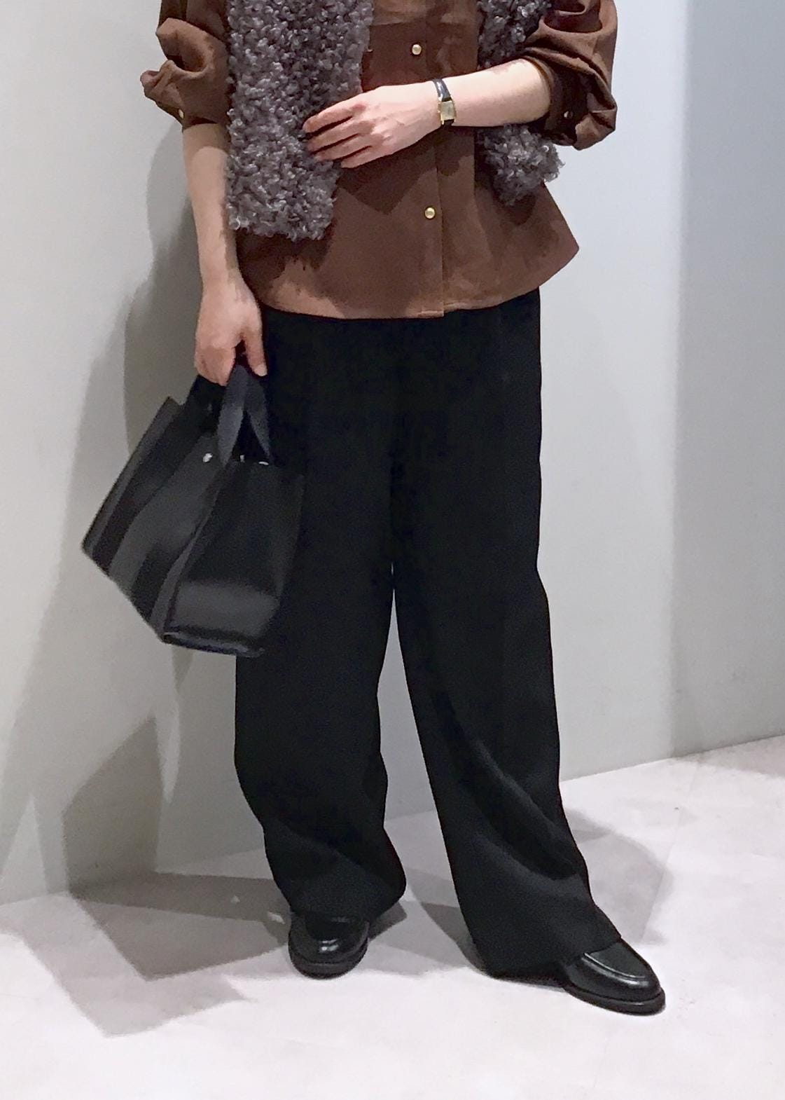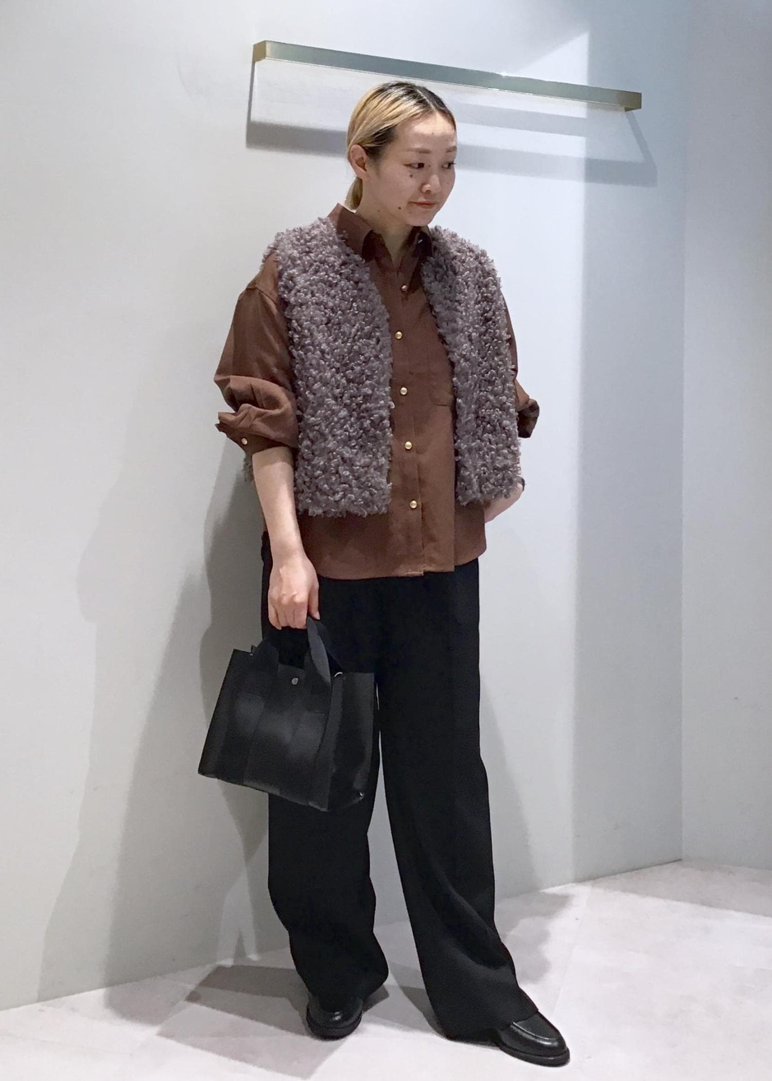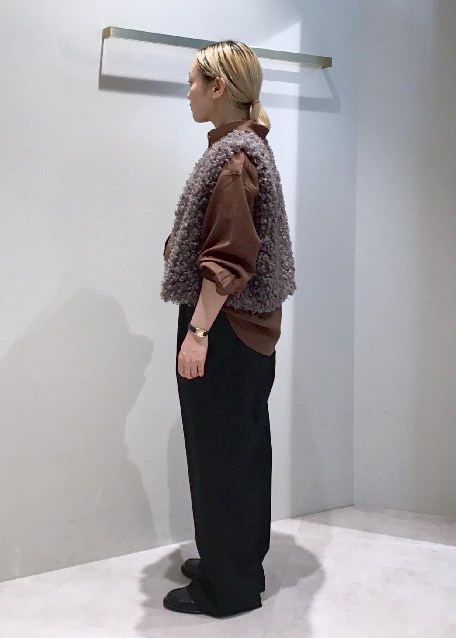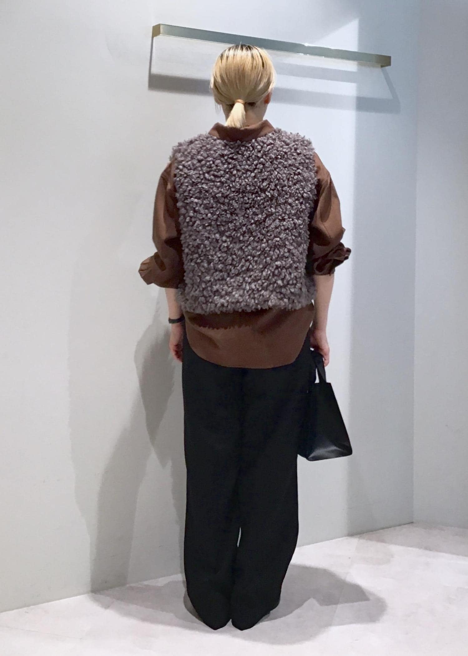 すっきりとした印象のセットアップは、インナーにレイヤードするコーディネートはもちろん、ボアベストを合わせても大人っぽくまとまります。