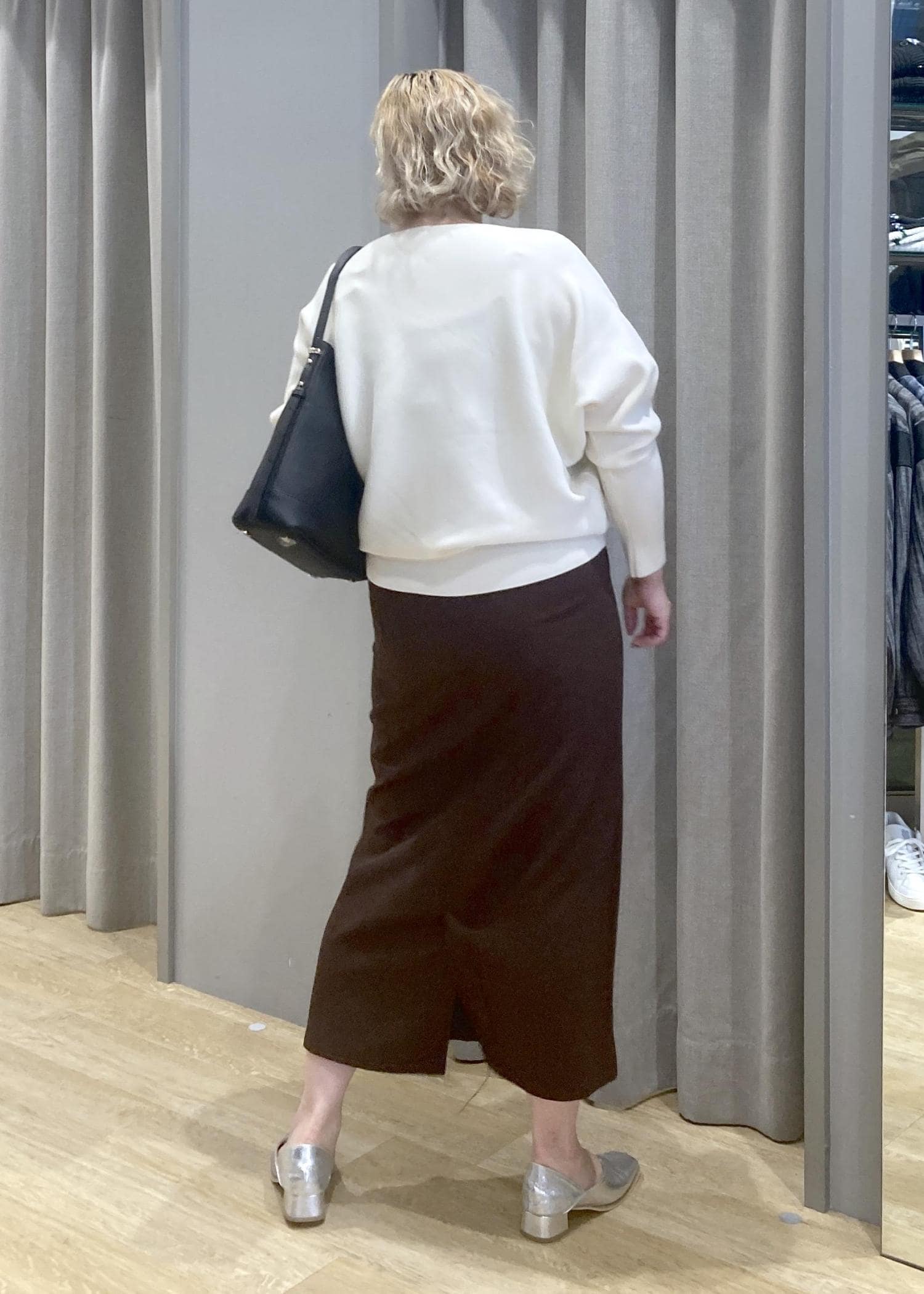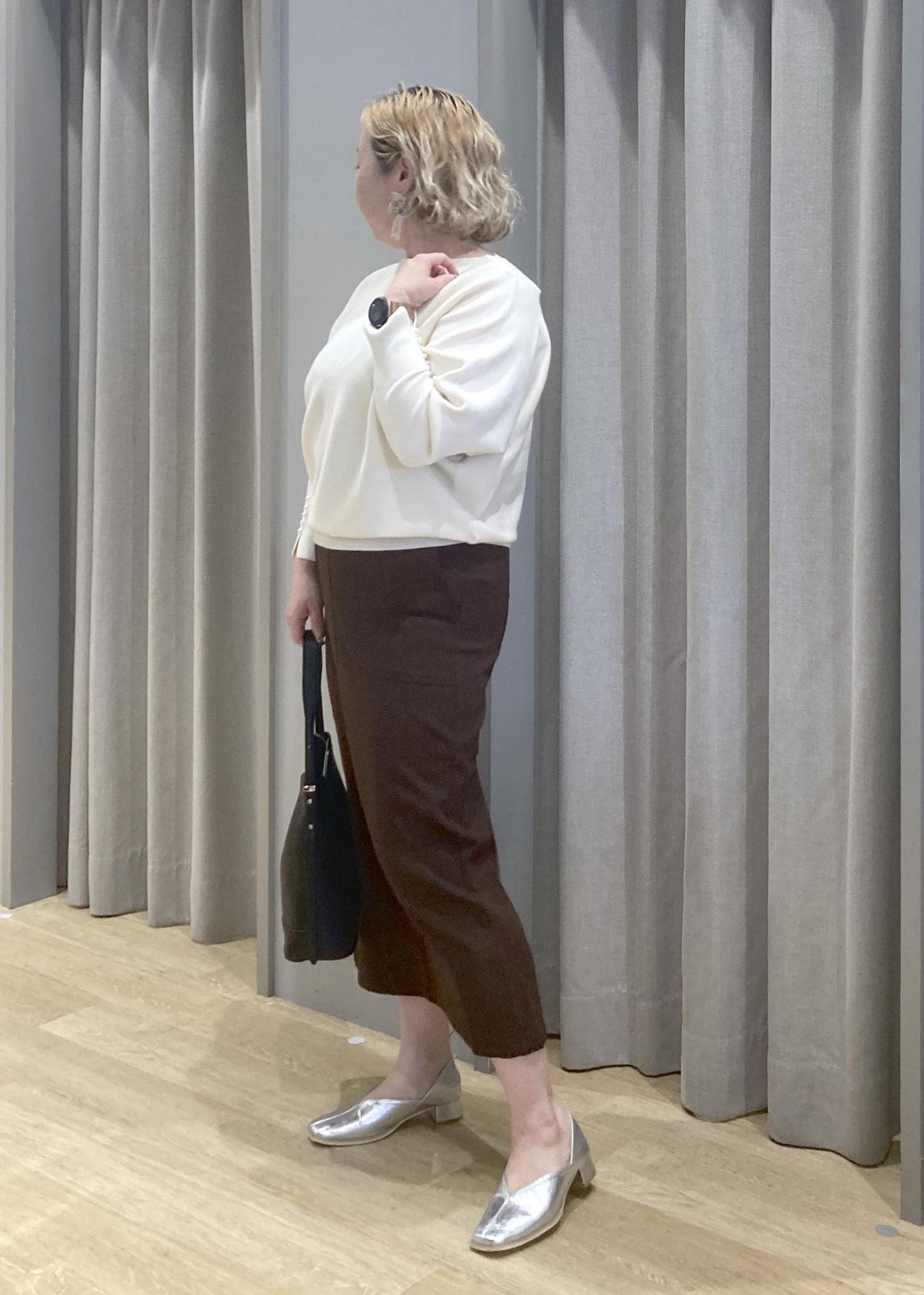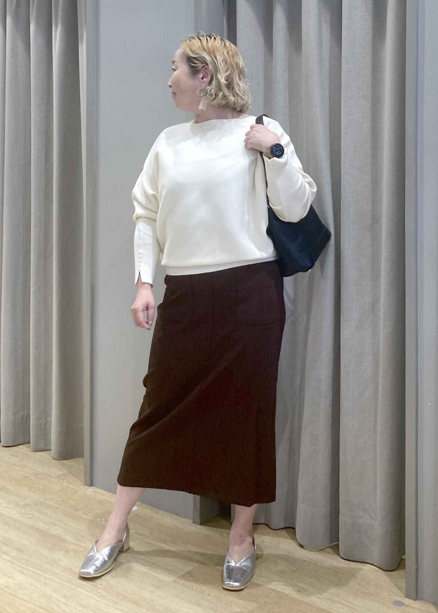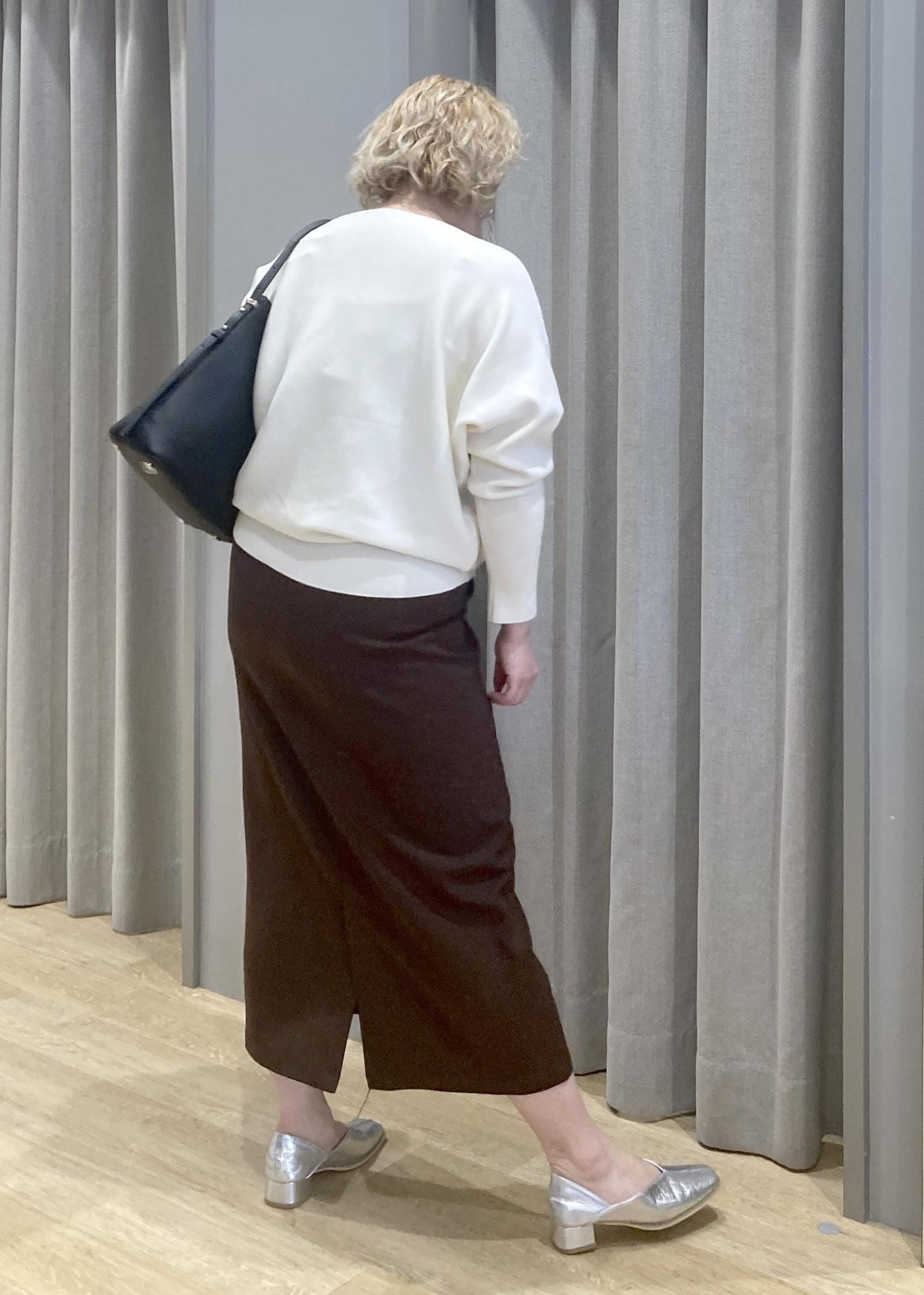 着心地の良いドルマンニットは、ゆったりラインなのでメリハリをつけるために、タイトスカートを合わせて、細見えコーデにしてみました。