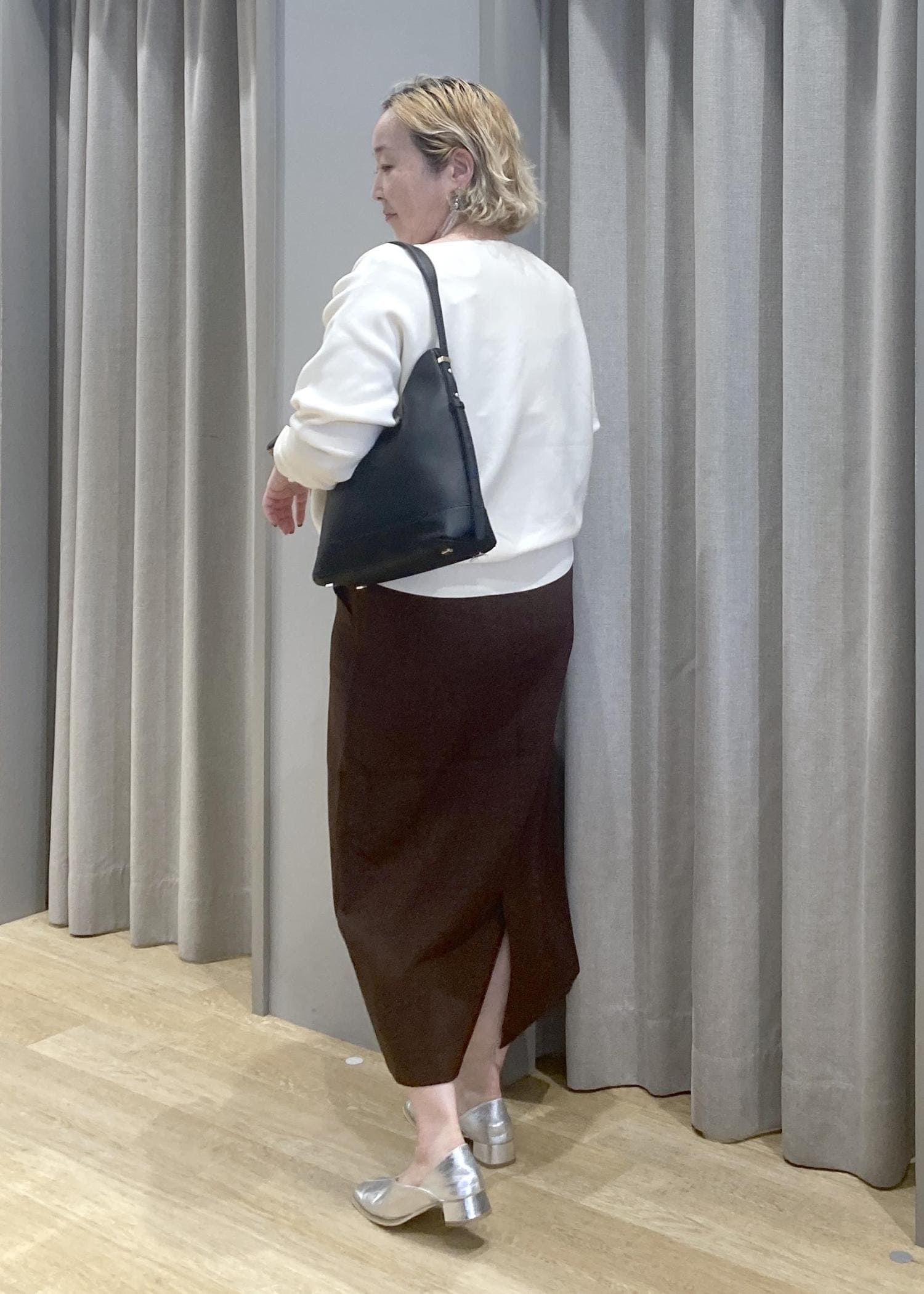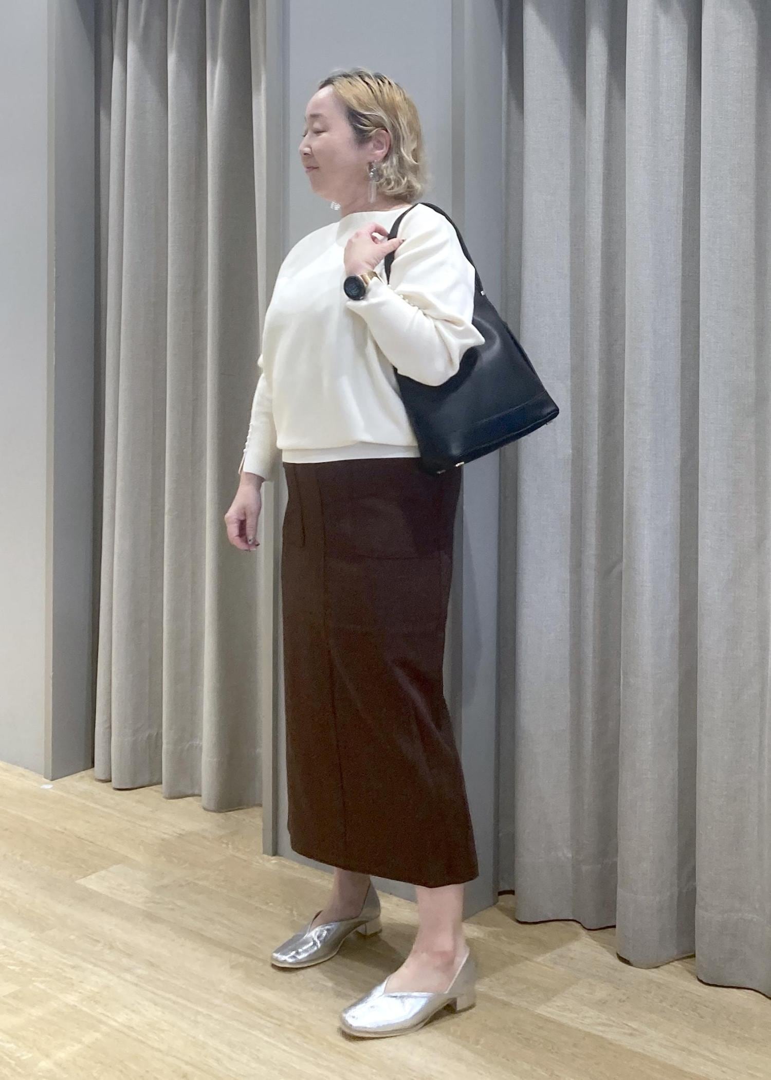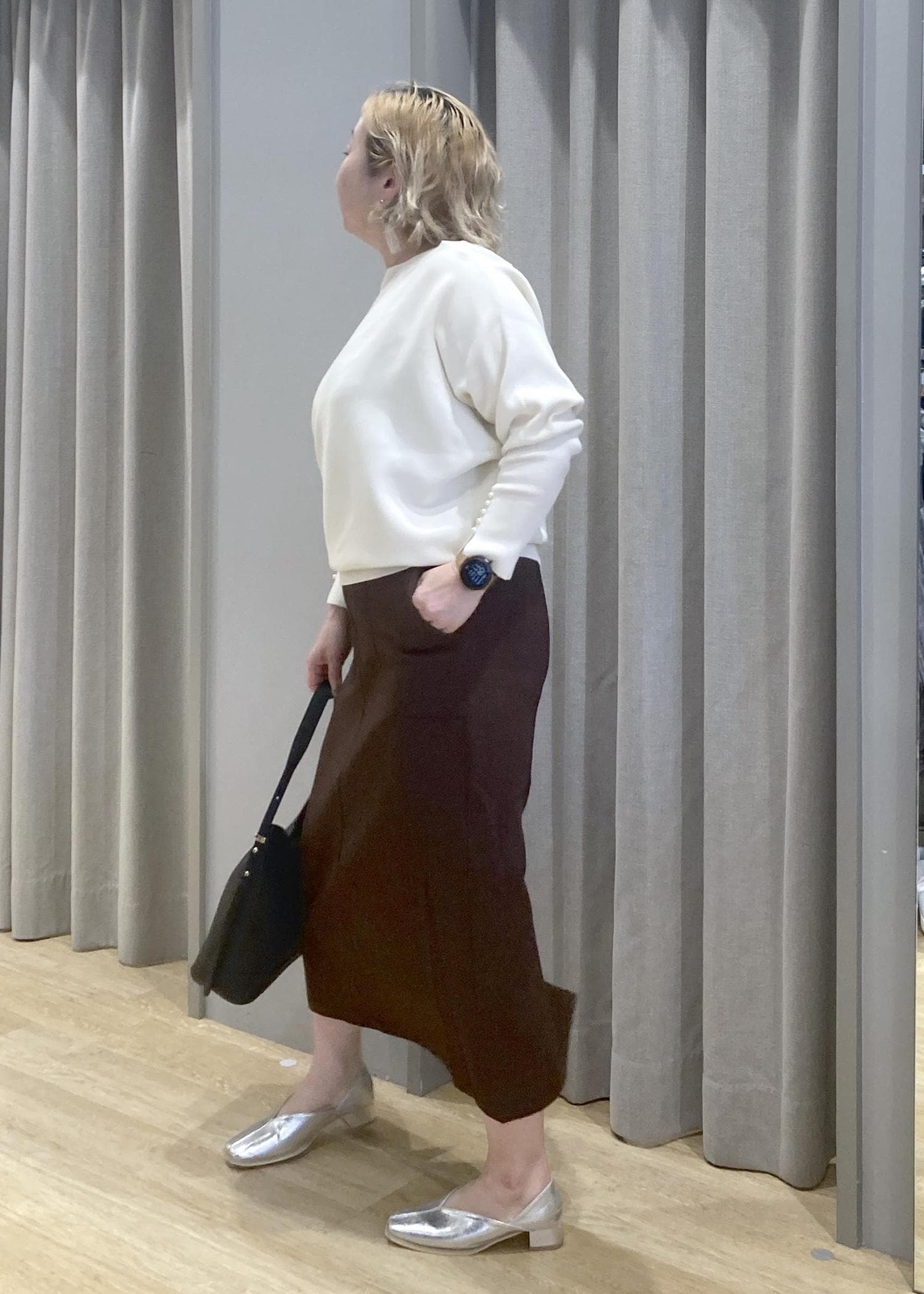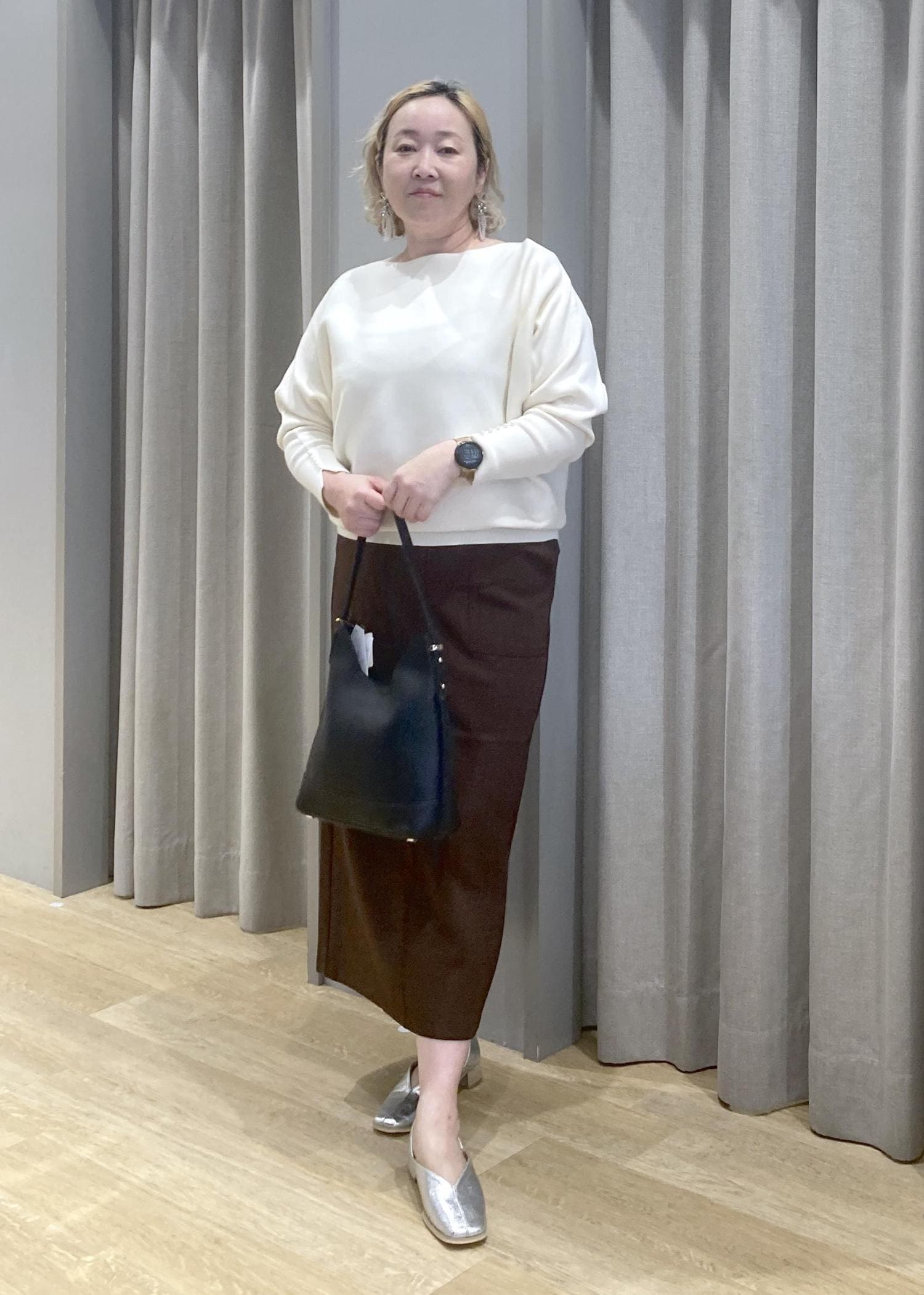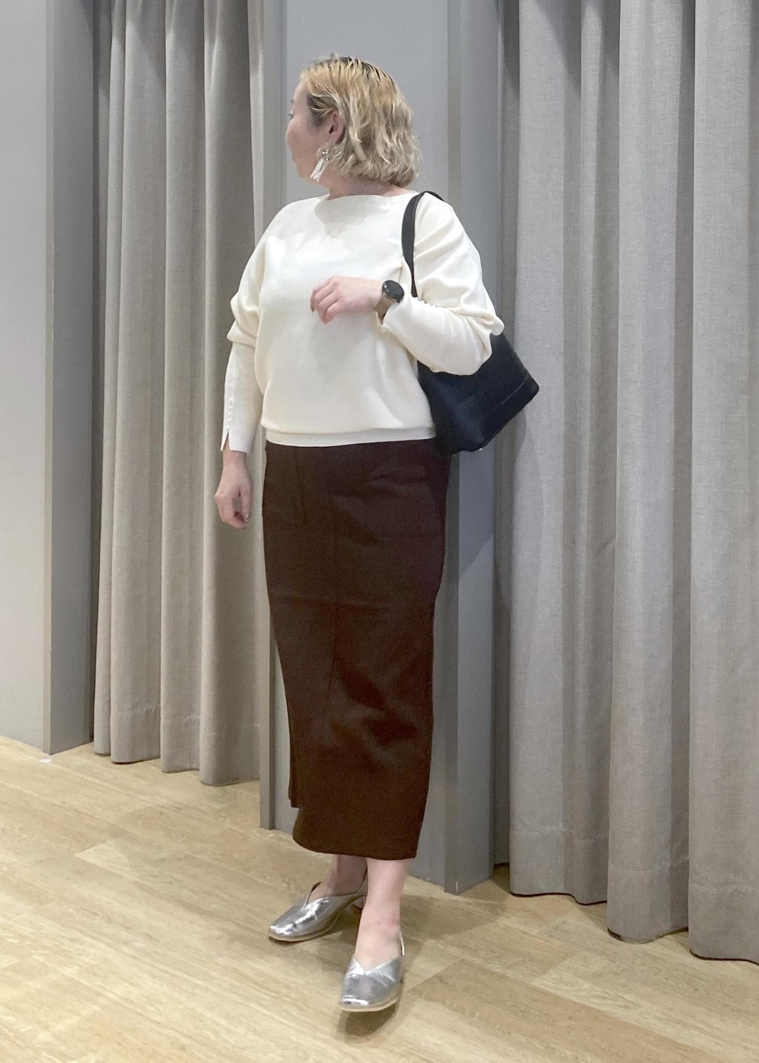 着心地の良いドルマンニットは、ゆったりラインなのでメリハリをつけるために、タイトスカートを合わせて、細見えコーデにしてみました。