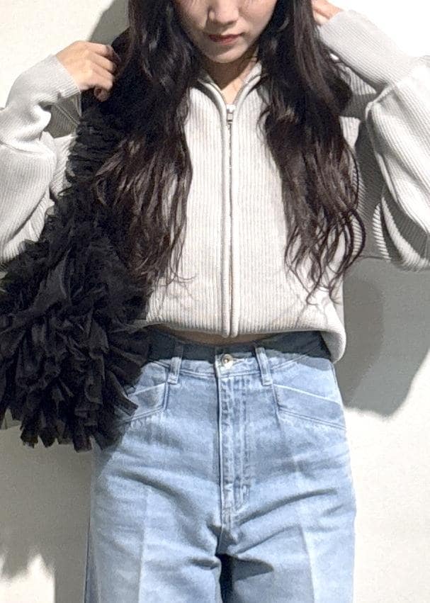 袖のボリューム感や身頃のメリハリあるシルエットに拘ったジップニットは逆開ファスナーで着方のアレンジが可能で色んなコーデを楽めます!