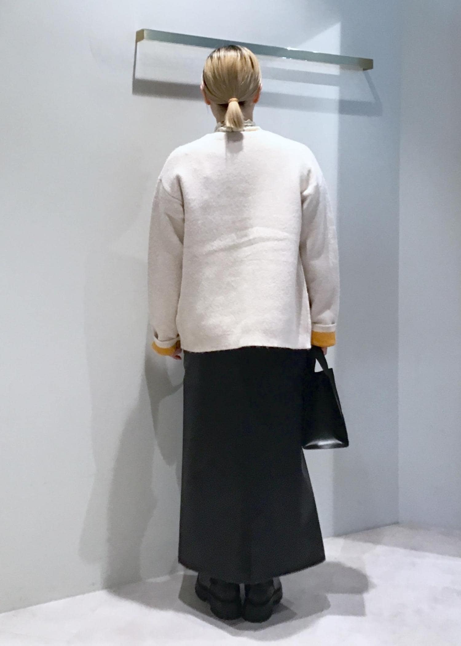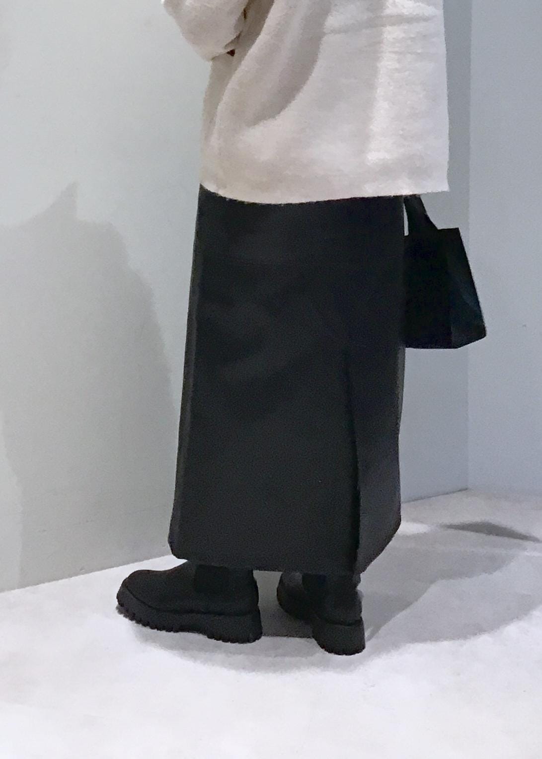 ウエスト後ろがゴムになっており、レザーライクな素材でも着やすいスカート。
