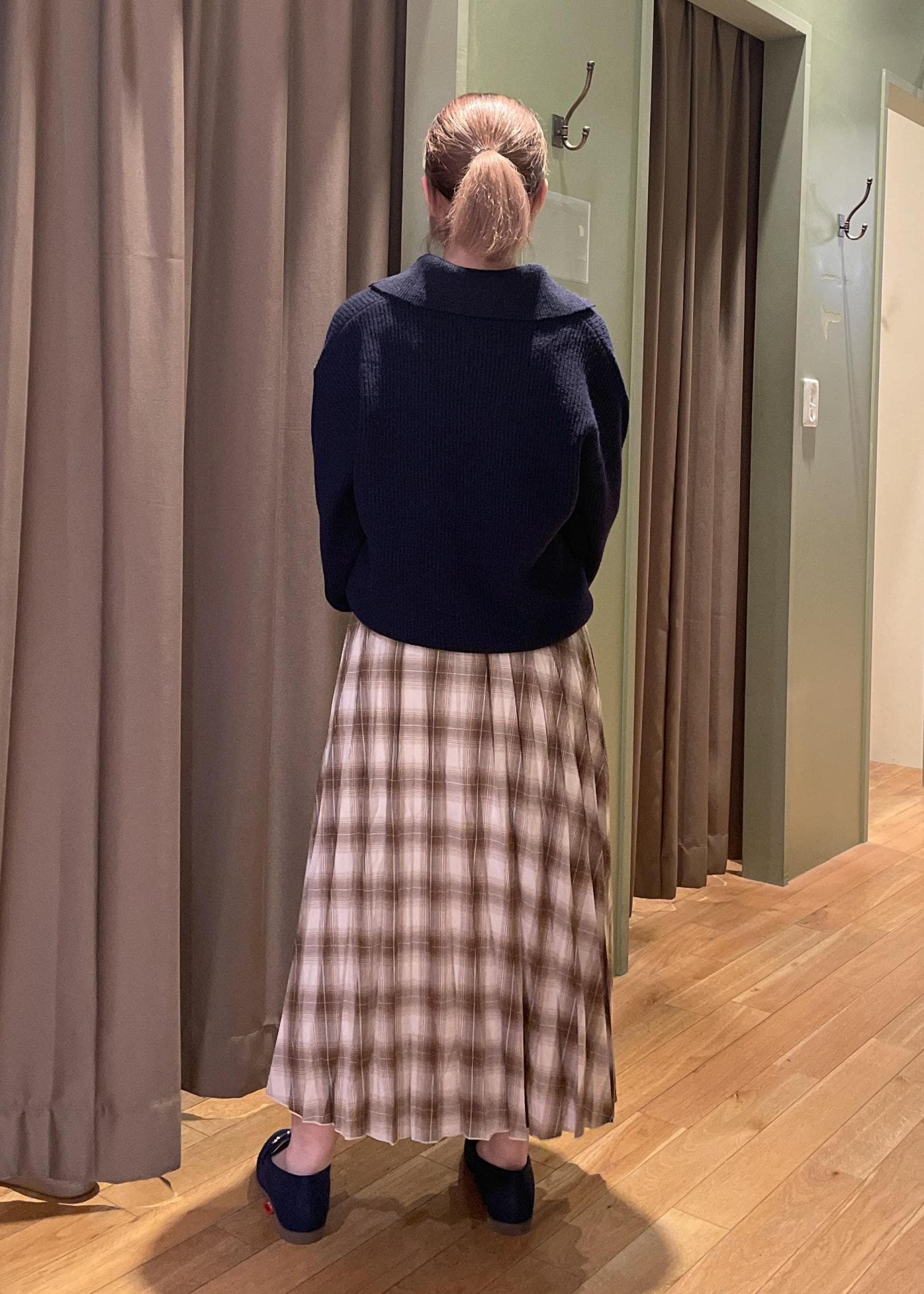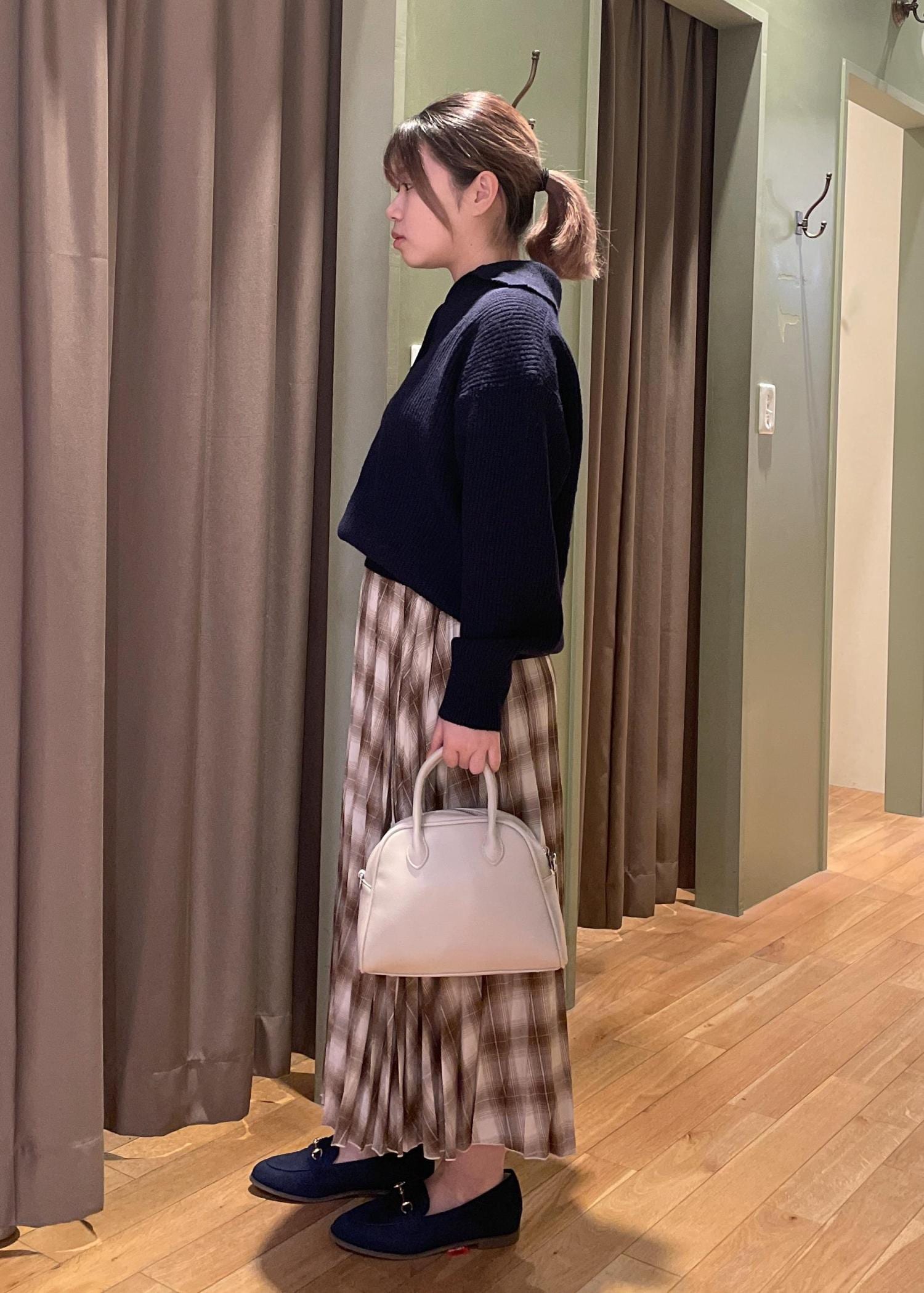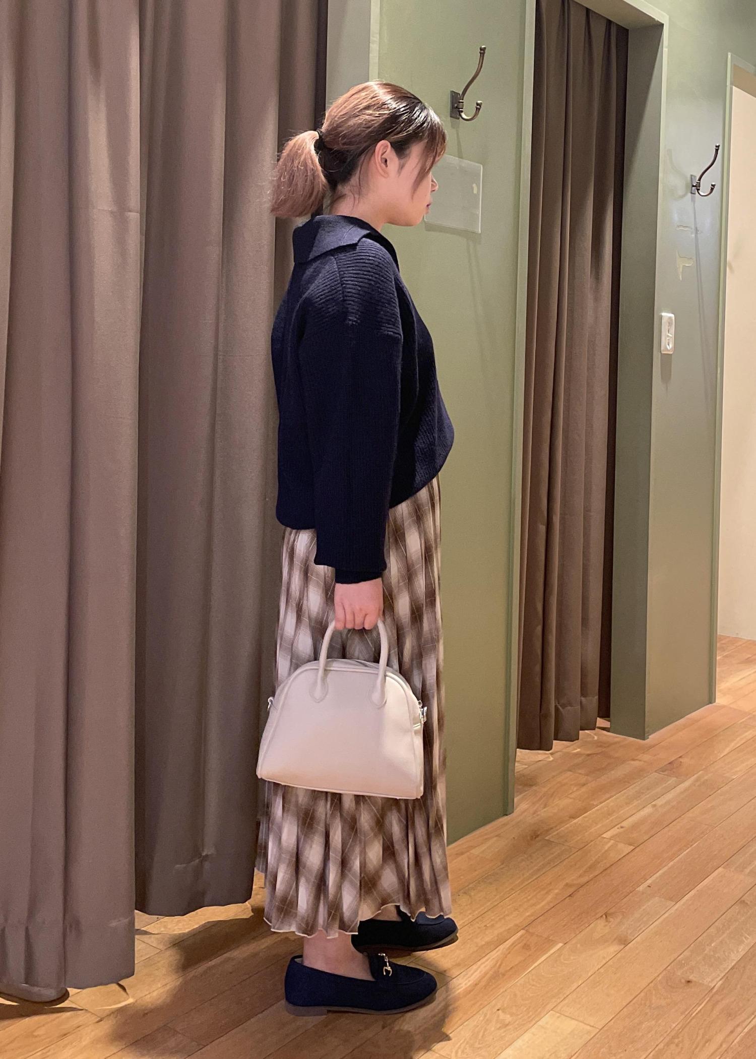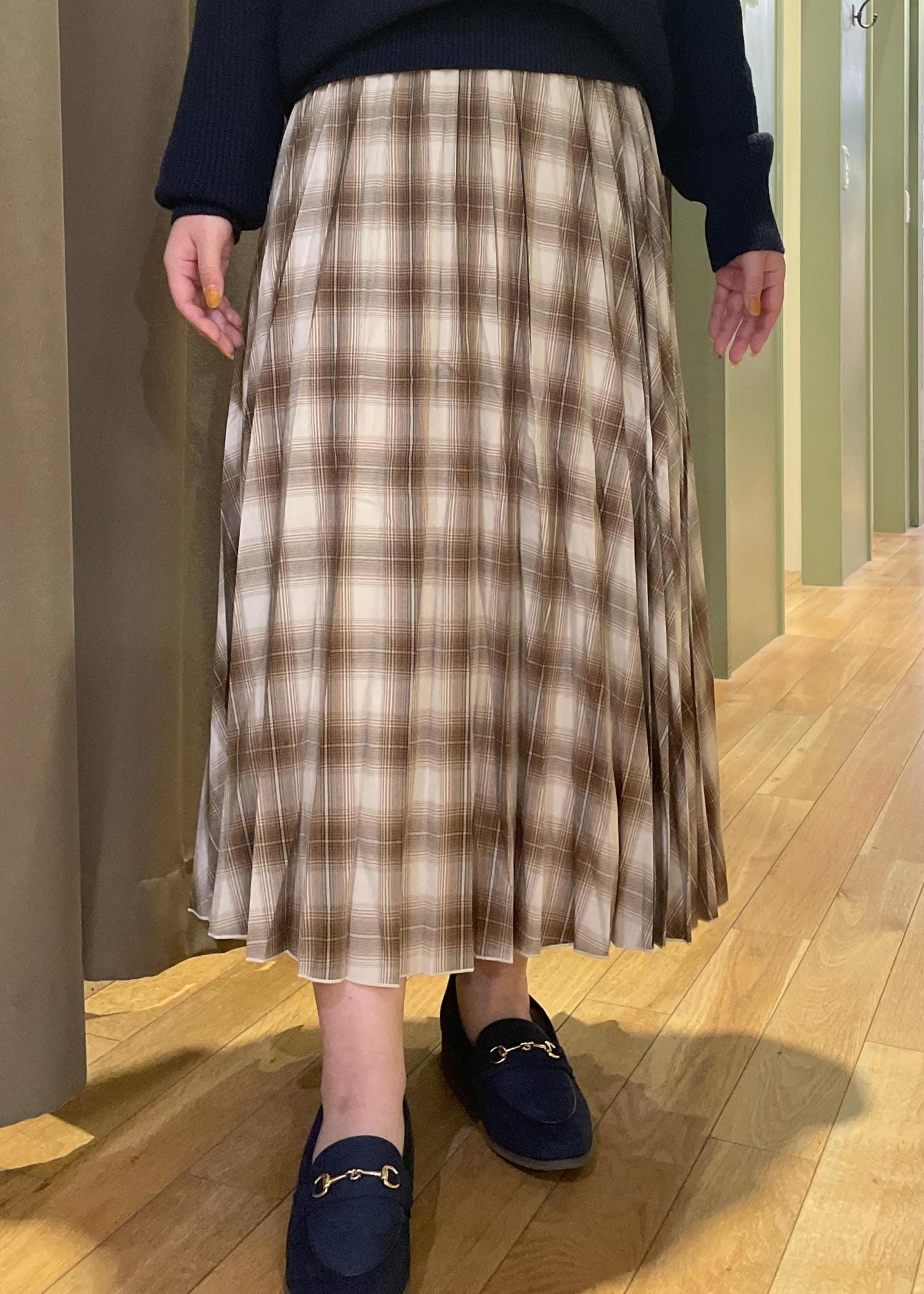 今回はネイビーのニットにキャメルのチェックスカートを合わせた秋を感じさせる大人カジュアルな可愛いコーデにしてみました!!
