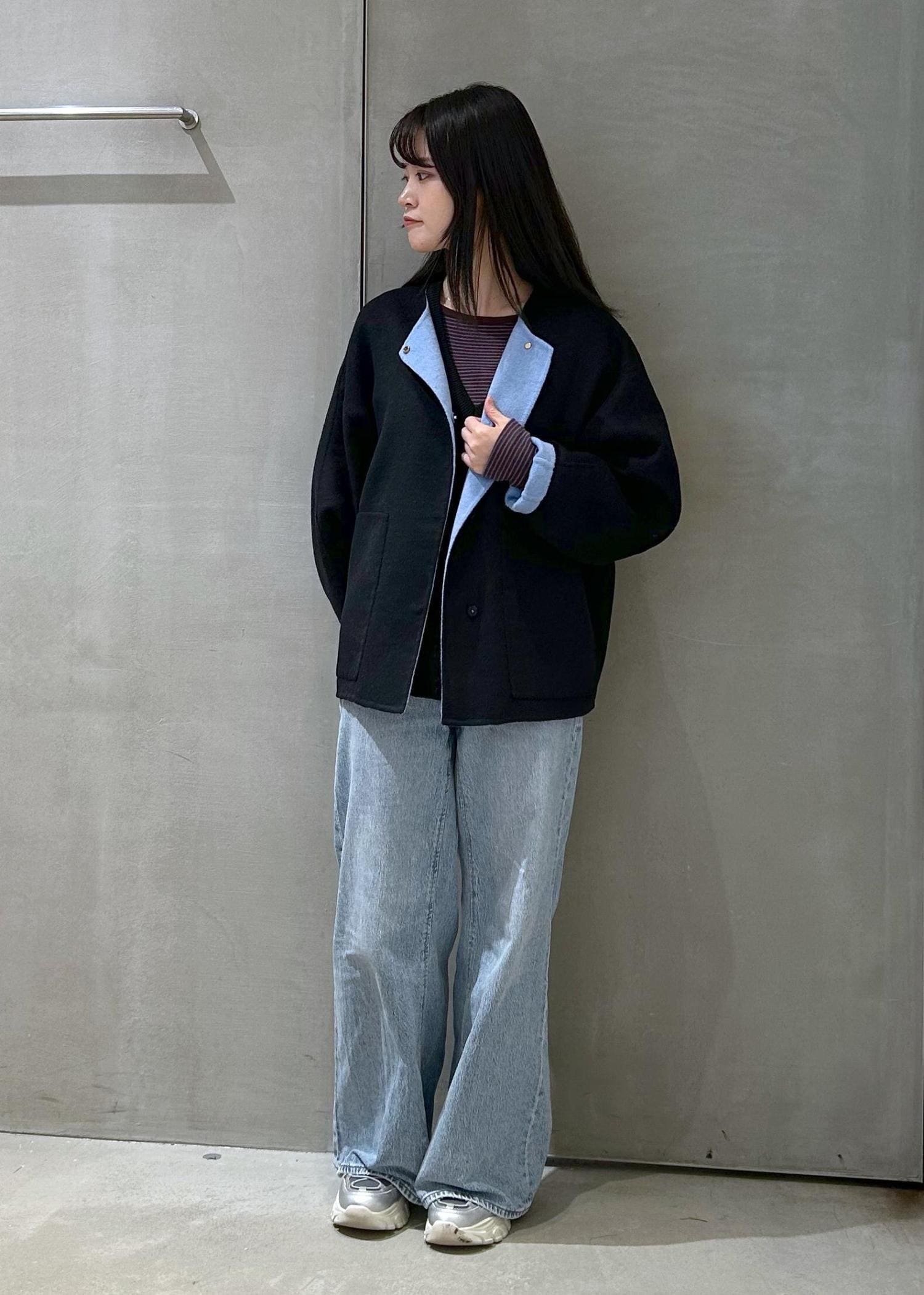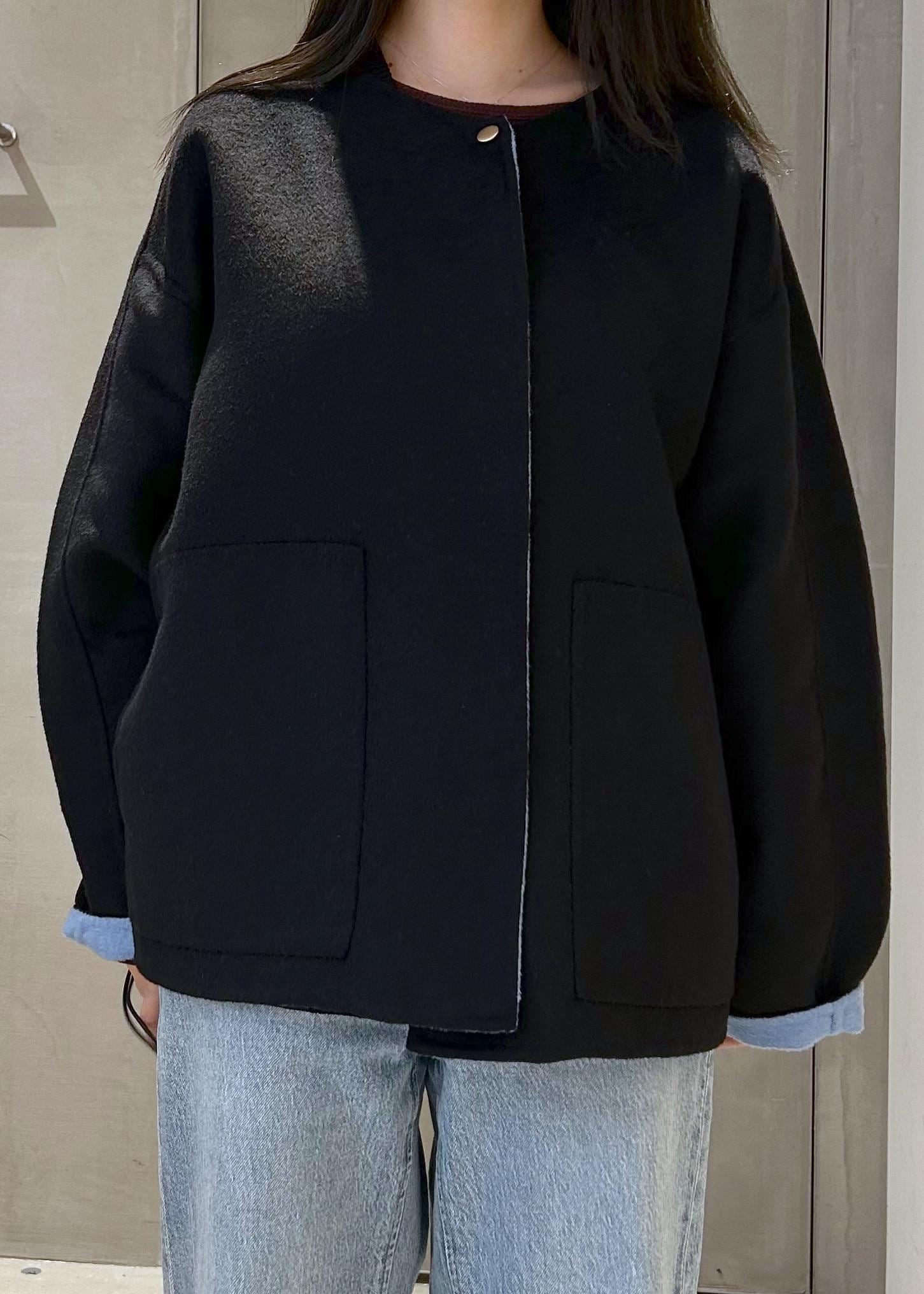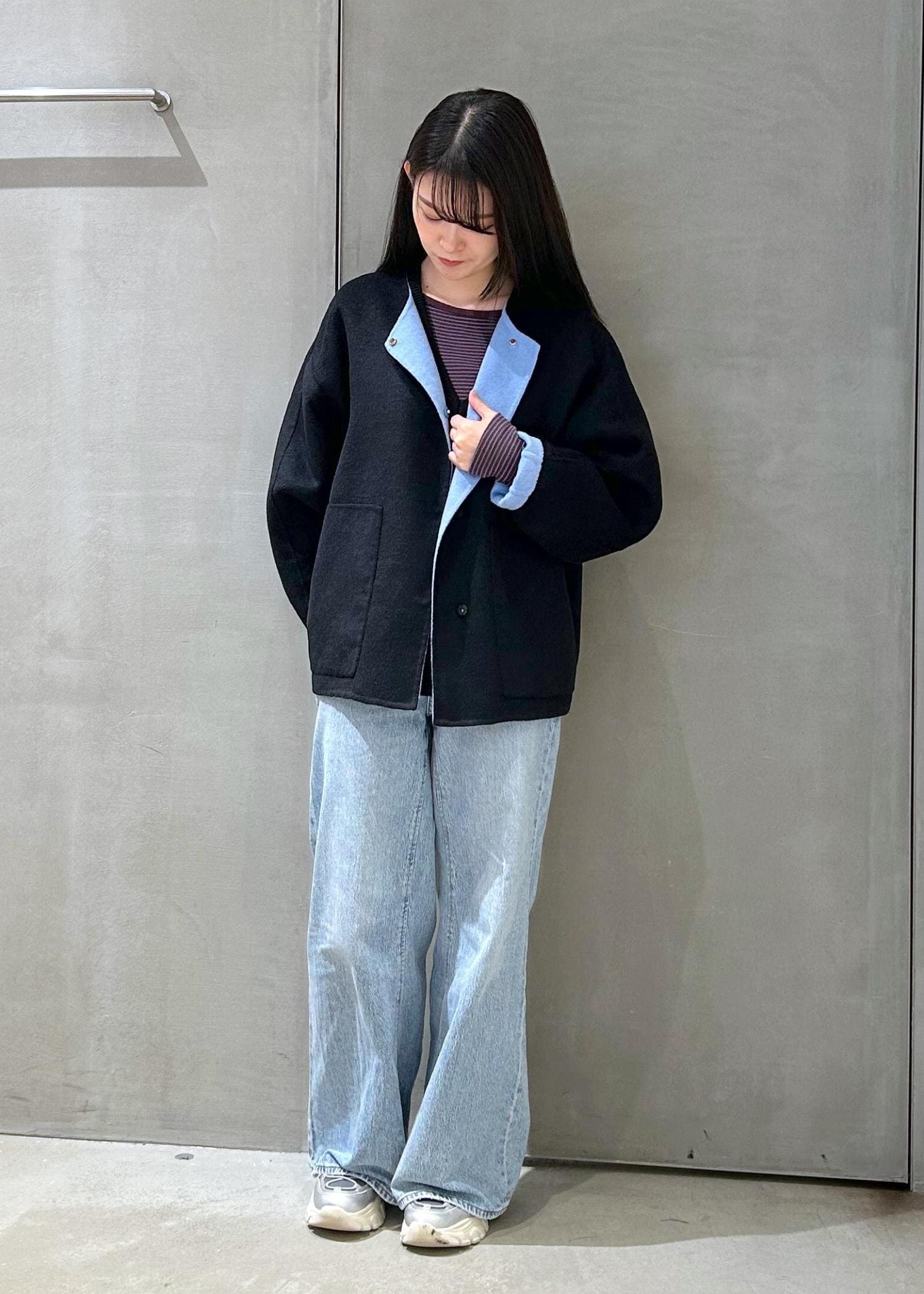 LE CERCLE par ropéダブルフェイスショートコートブラック系 / F¥13,860レビュー生地感もしっかりしていて丈感はショートコートなので短めですが、袖や襟元からチラッと見えるバイカラーのデザインがポイントです!