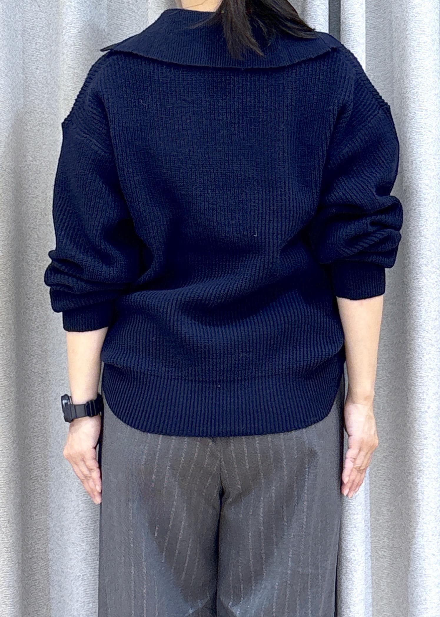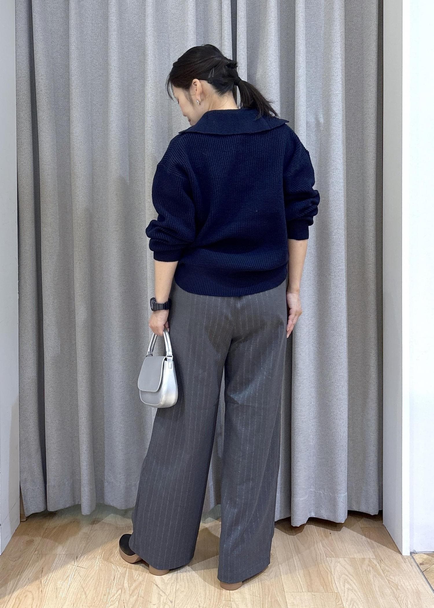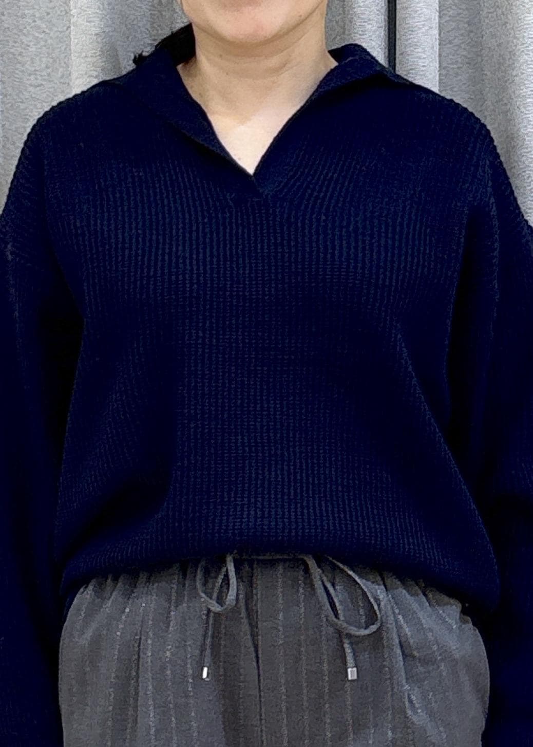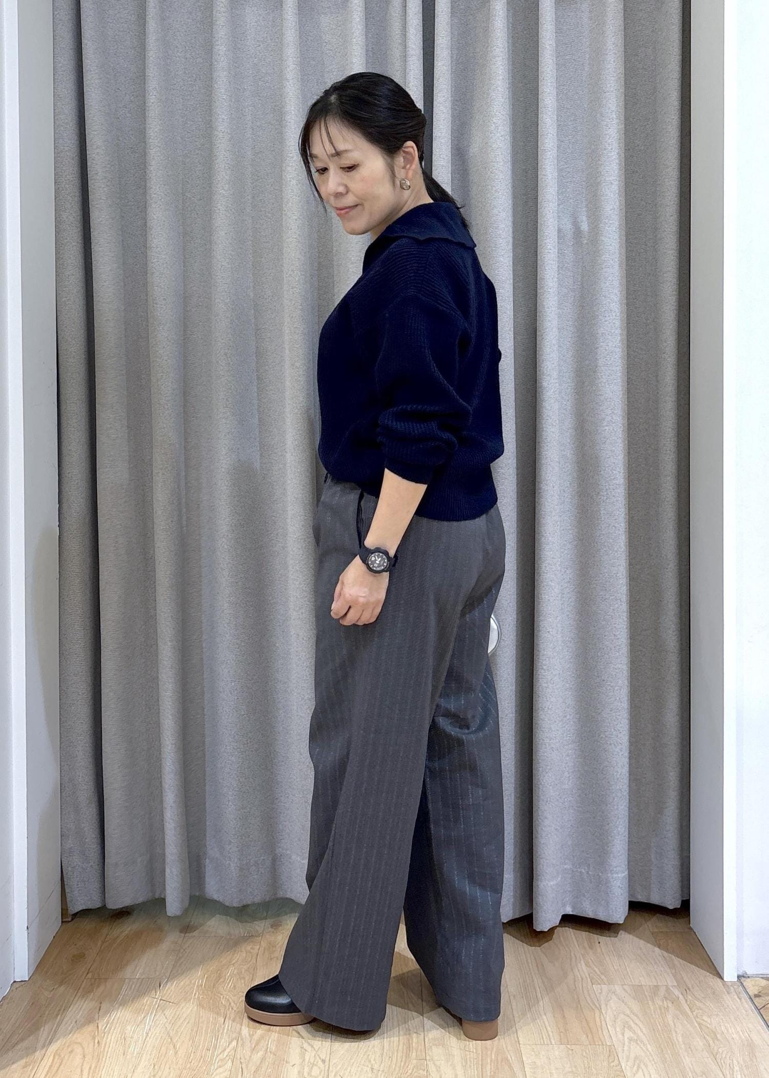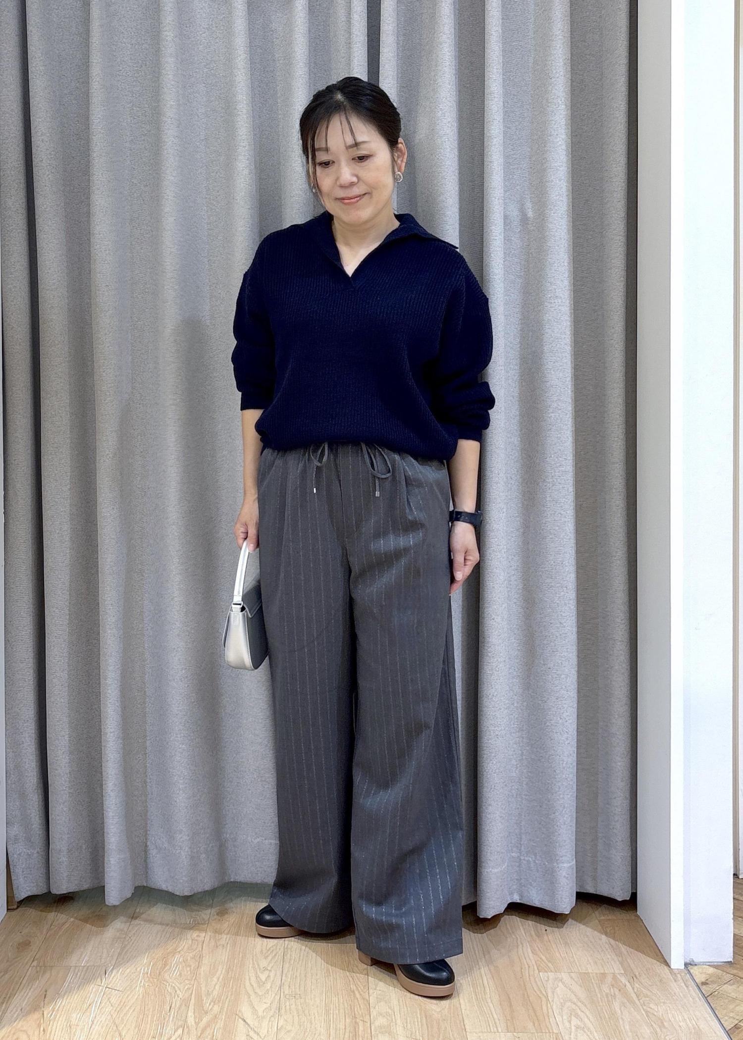ネイビーニット&グレーイージーパンツで大人っぽいカジュアルコーデにしました。