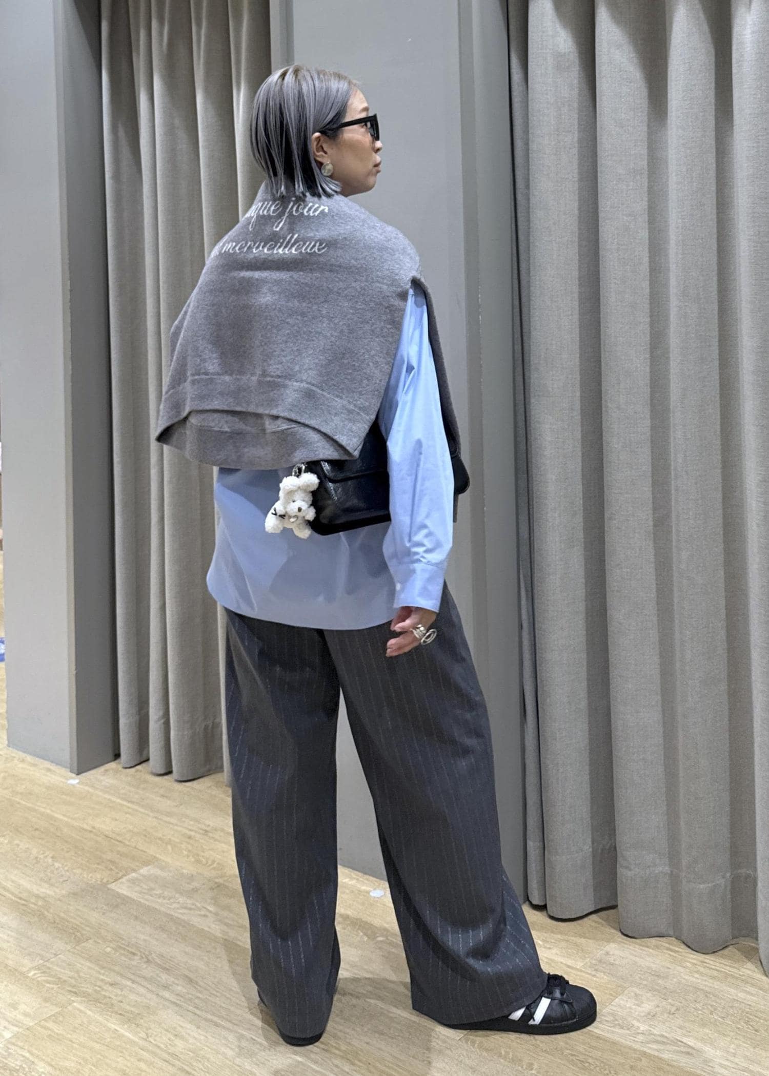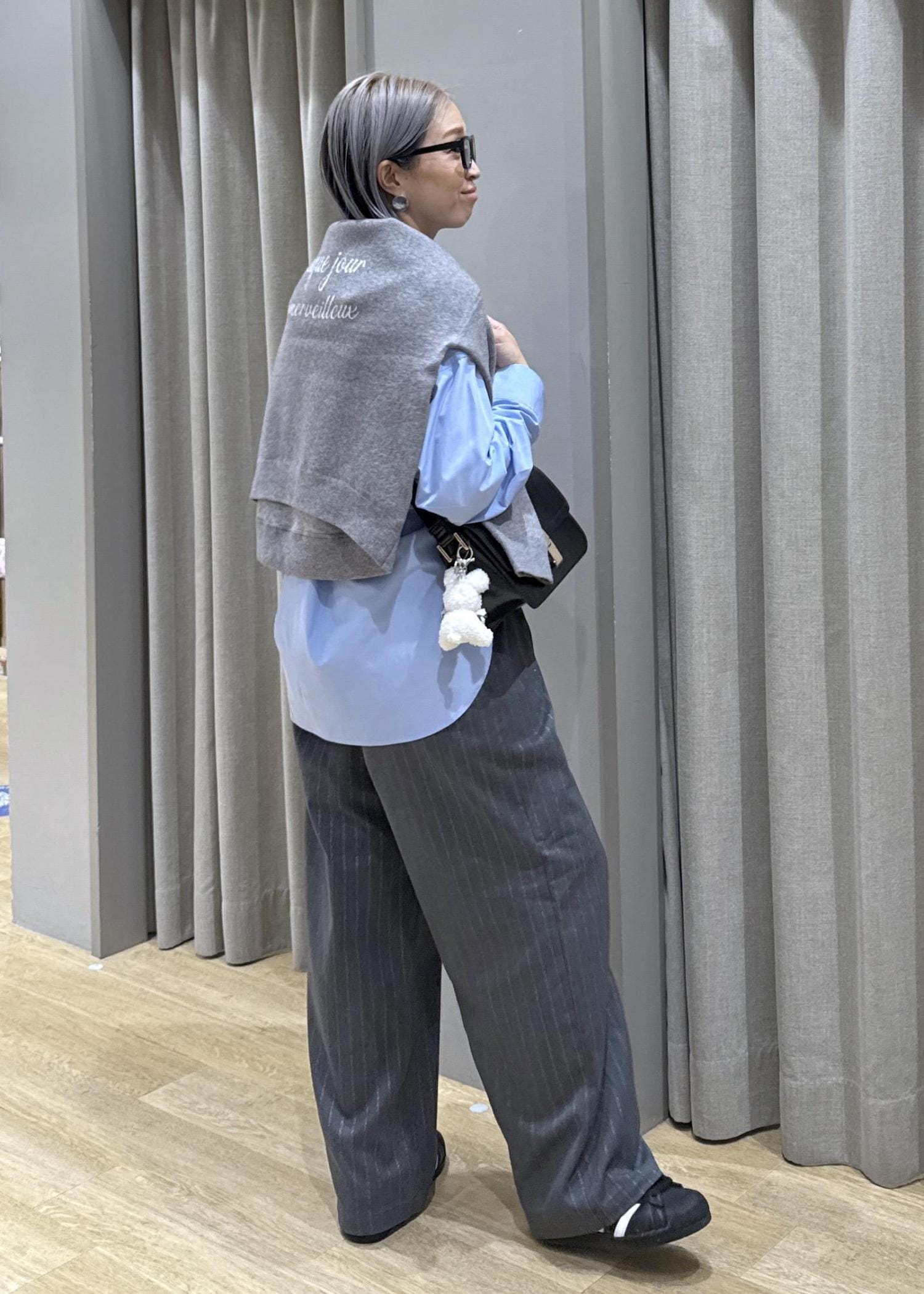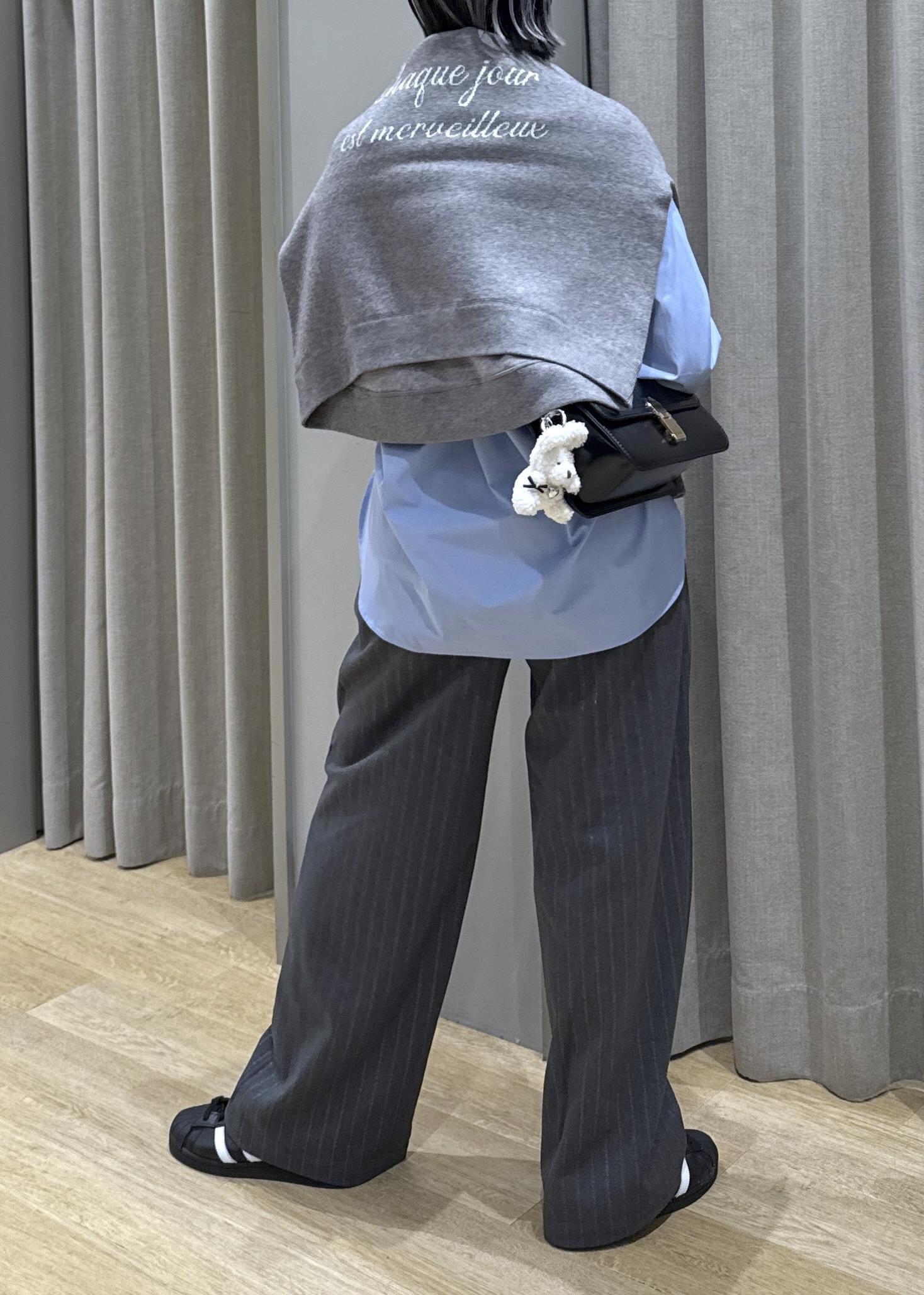 普段もニットやスウェット、ロンTを肩掛けするこのコーデ