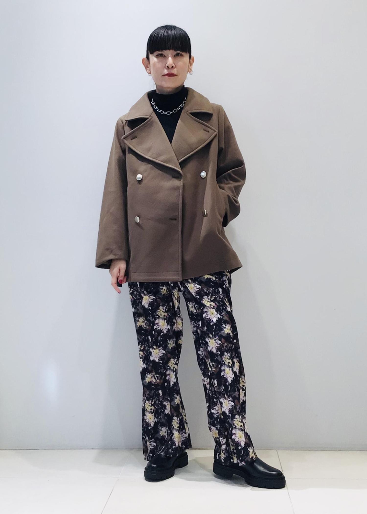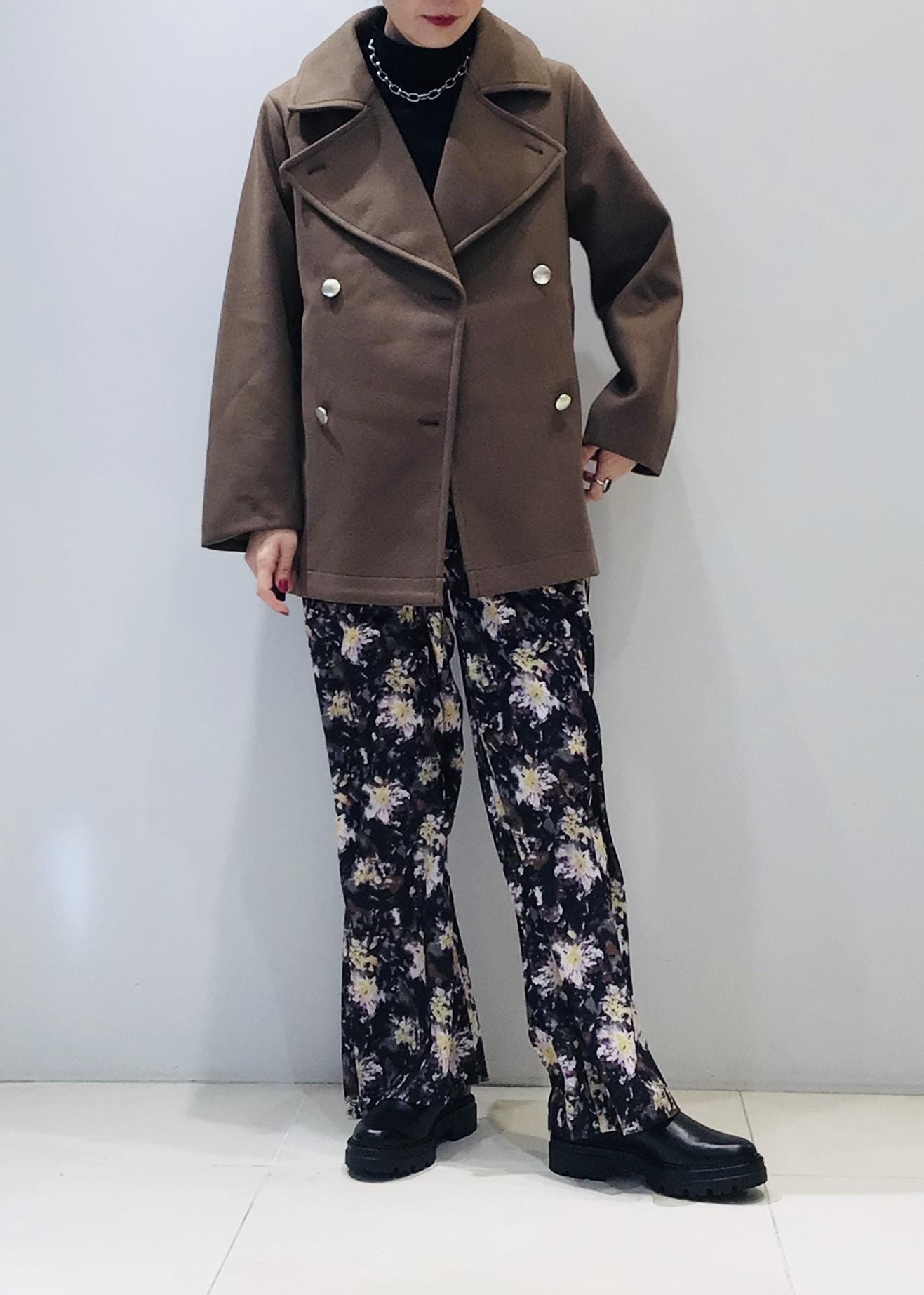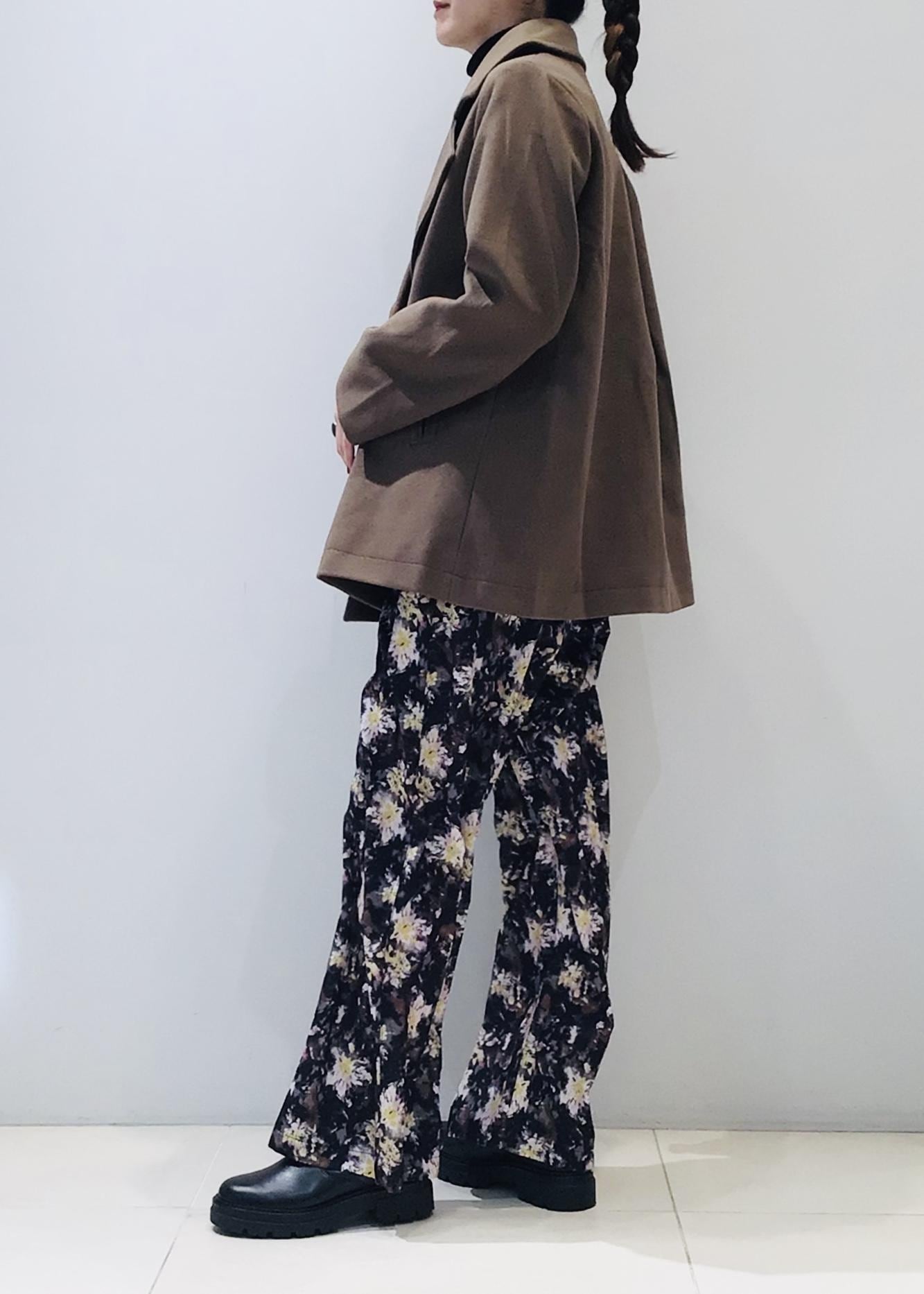 どうしてもダークな色味になりがちな冬コーデですが、フラワープリントのパンツでパッと目を惹く色遣いに