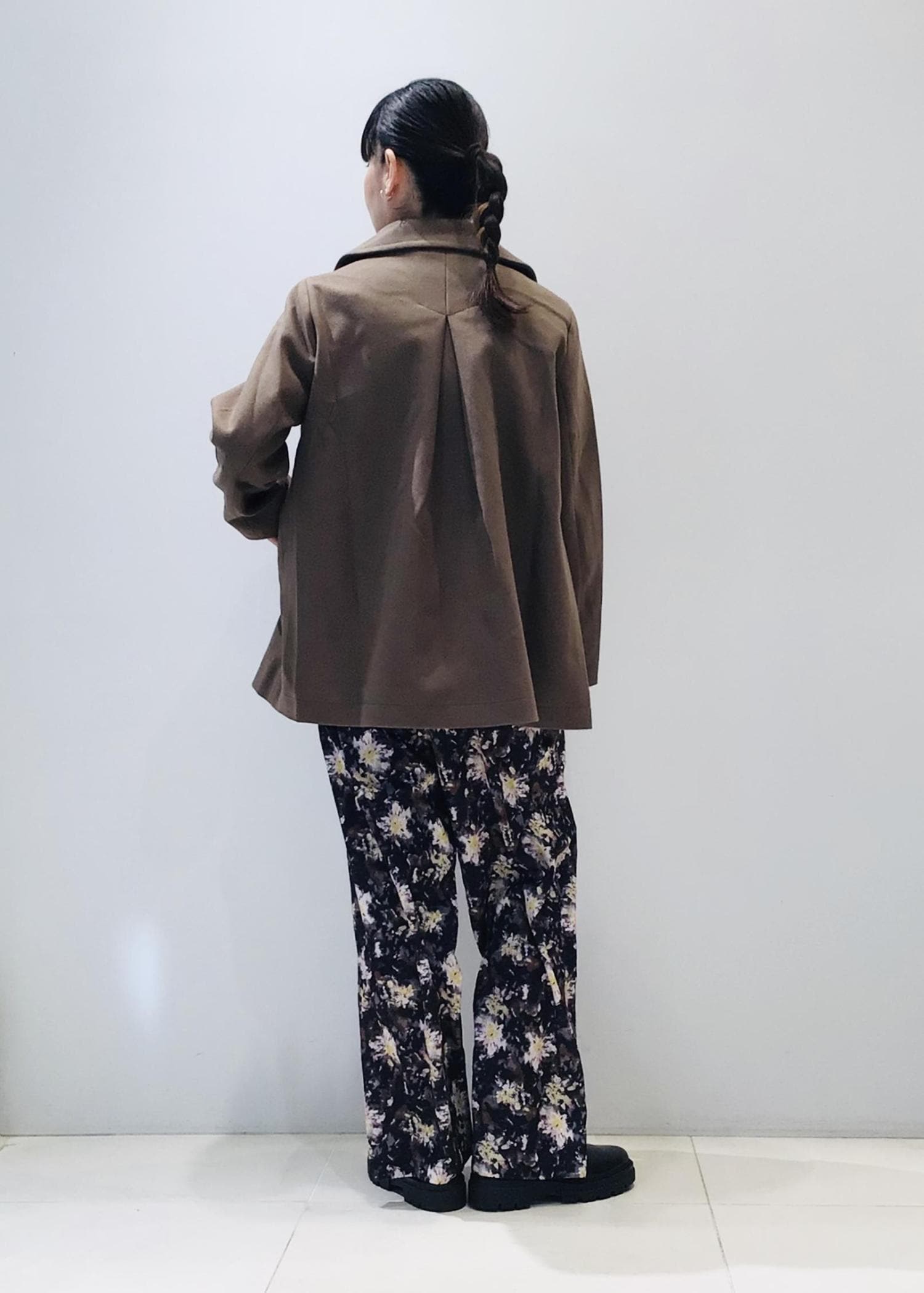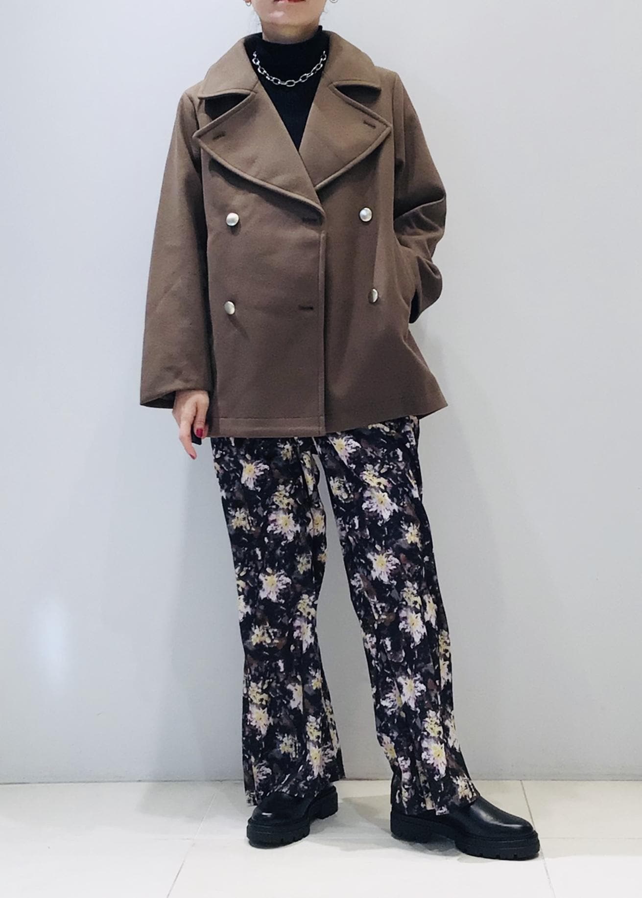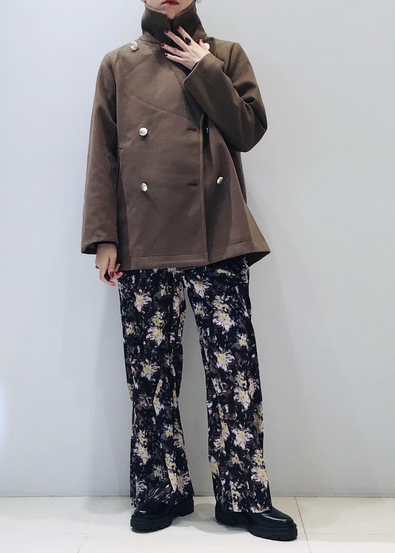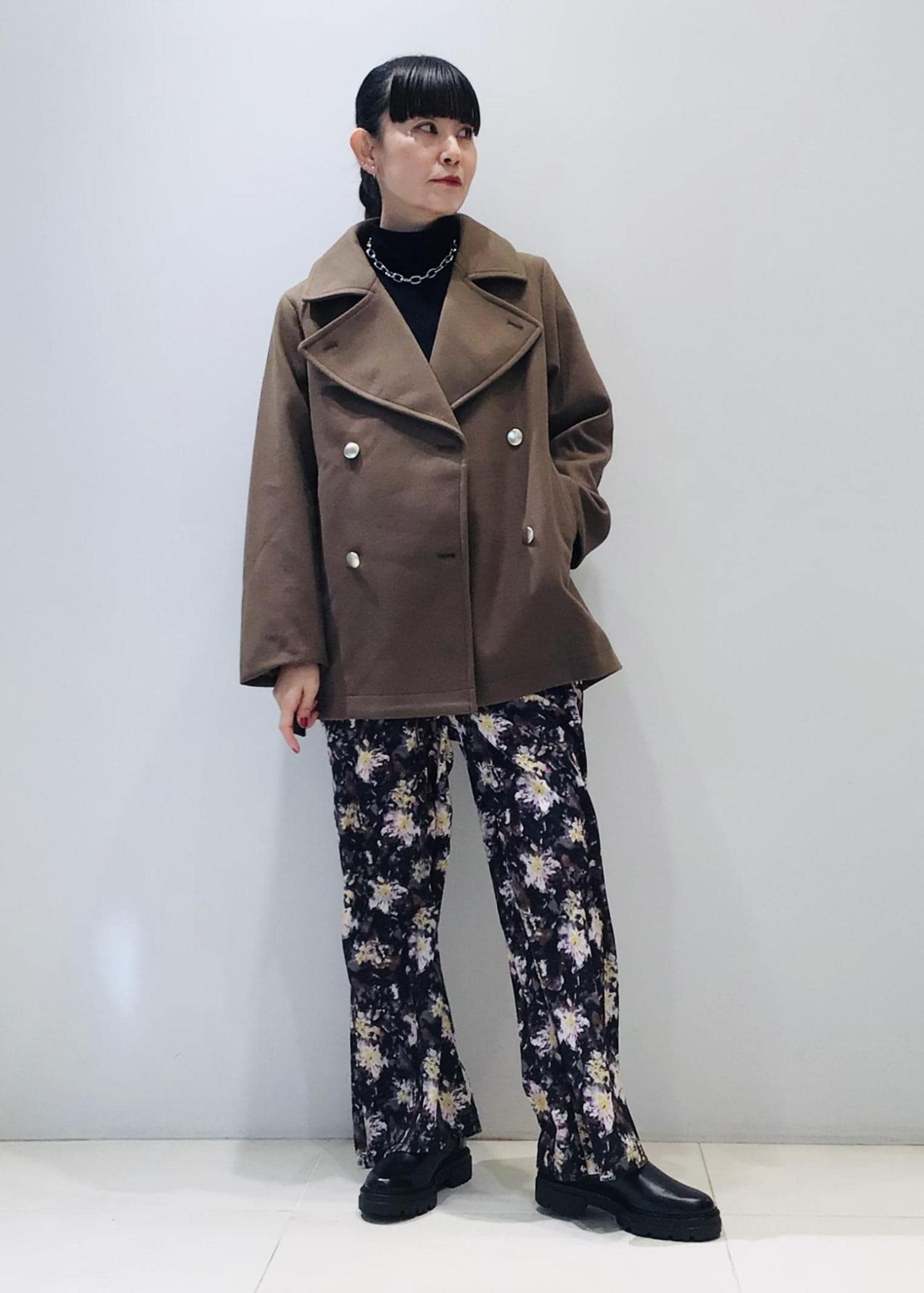 どうしてもダークな色味になりがちな冬コーデですが、フラワープリントのパンツでパッと目を惹く色遣いに
