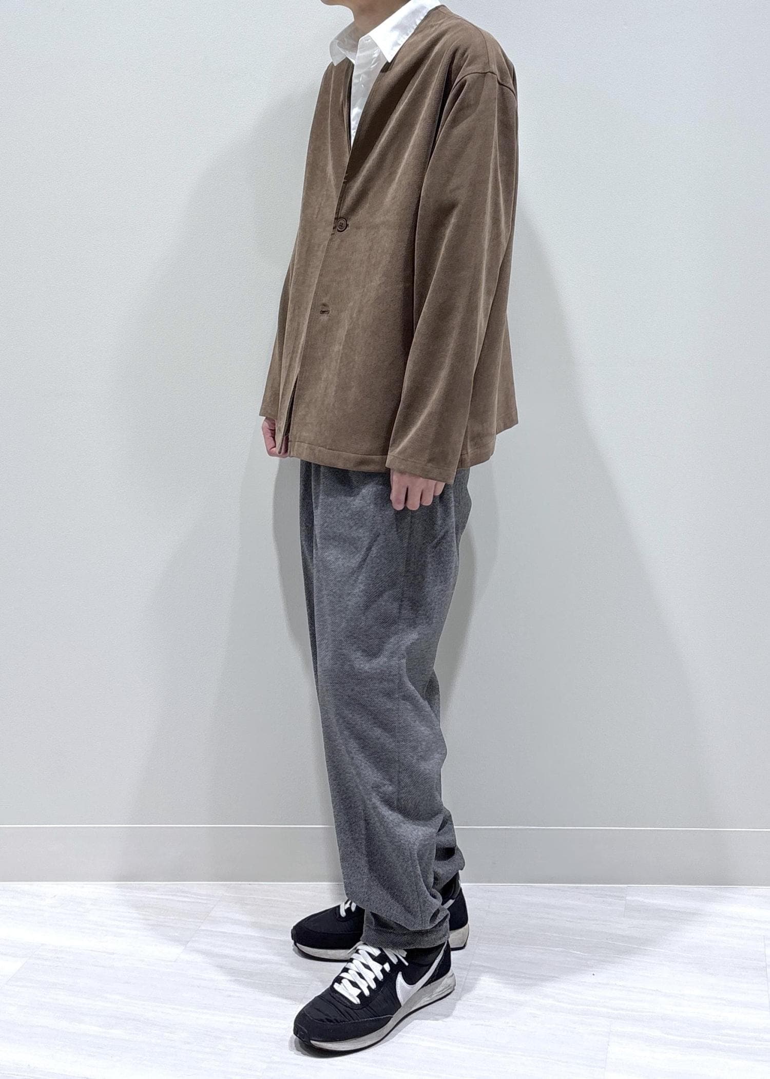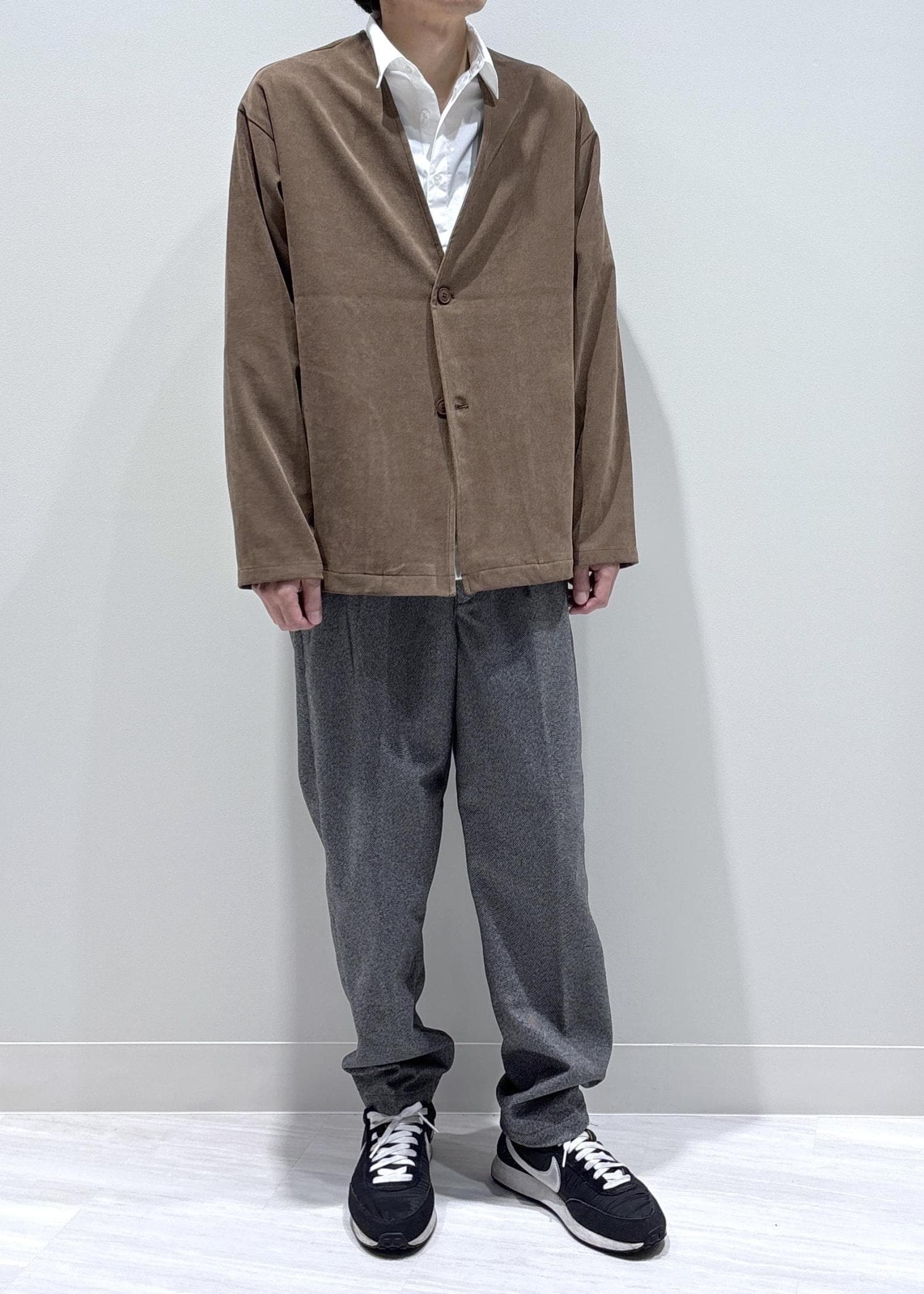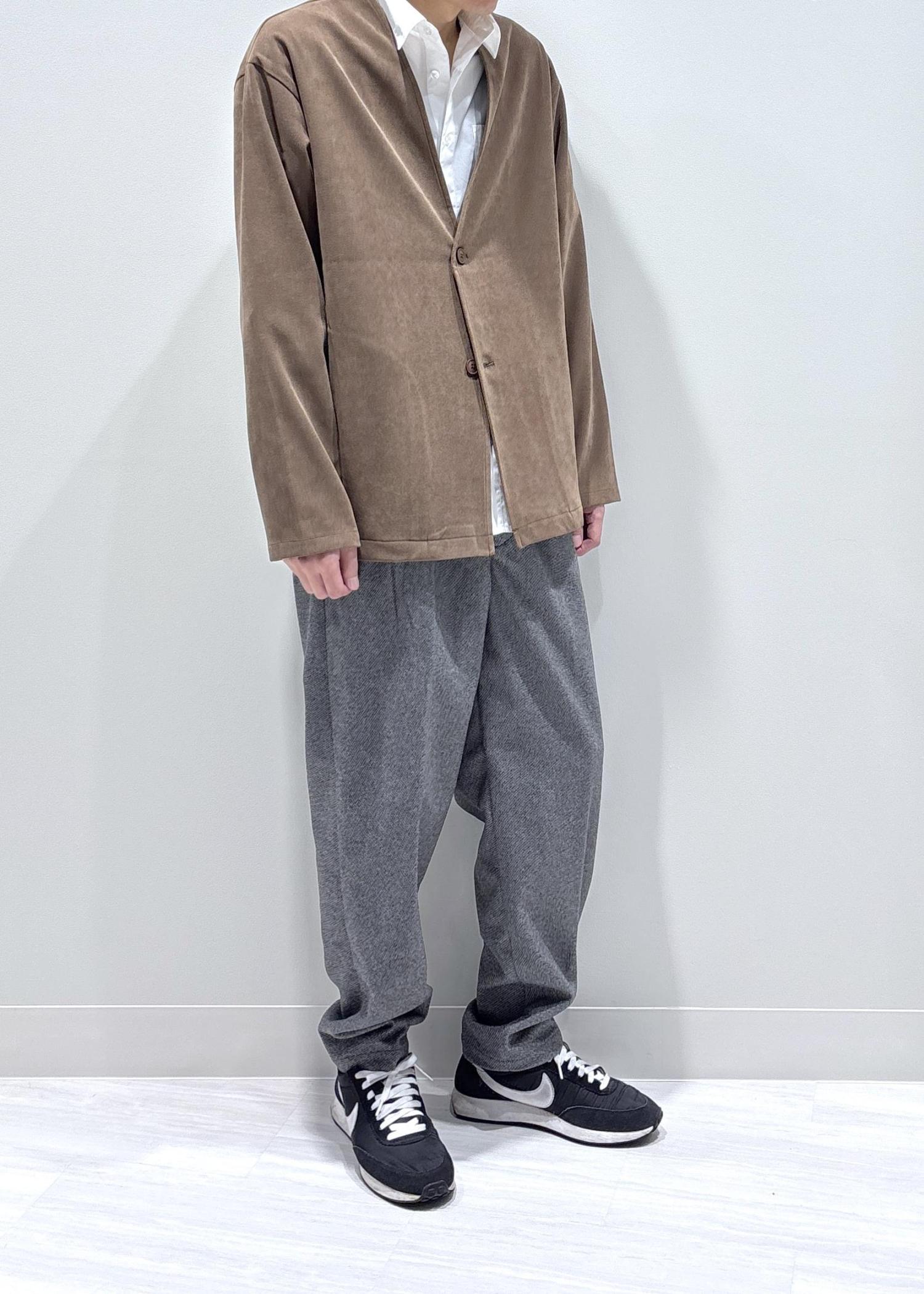 トップスはノーカラーカーディガンでインナーにはシャツやニットなど持ってくると相性良いです。
