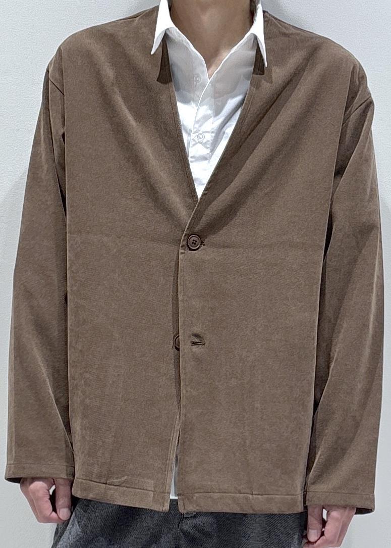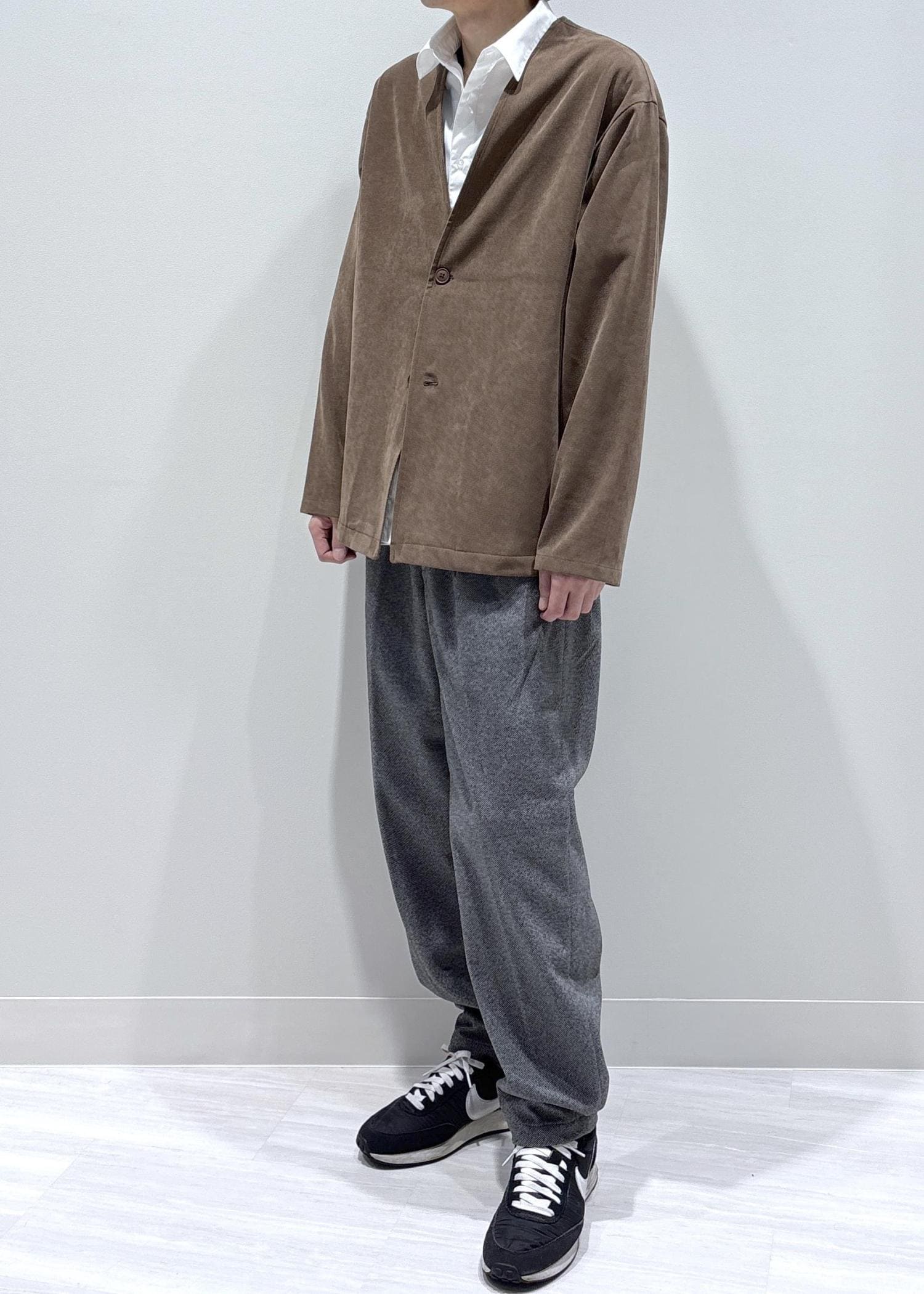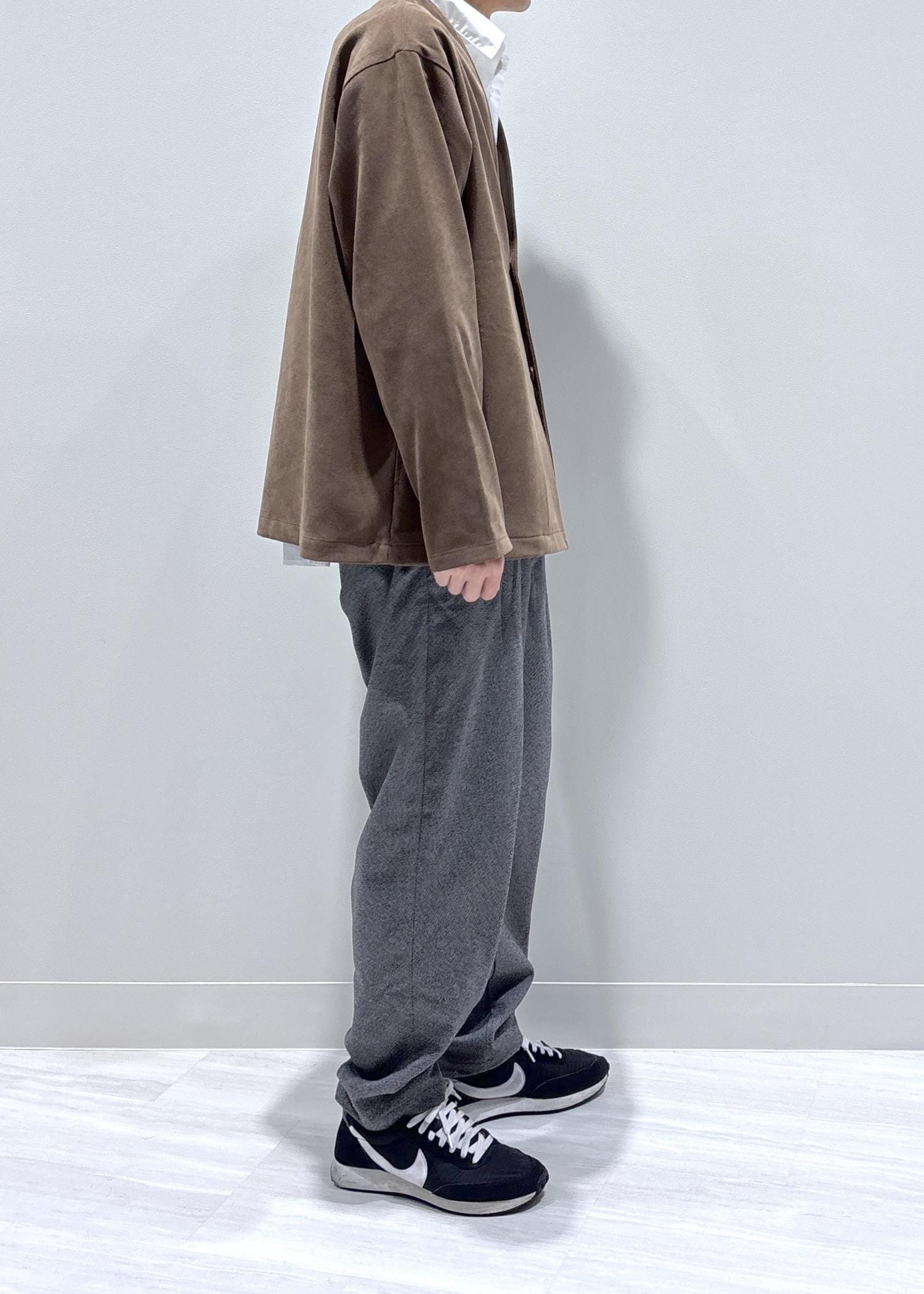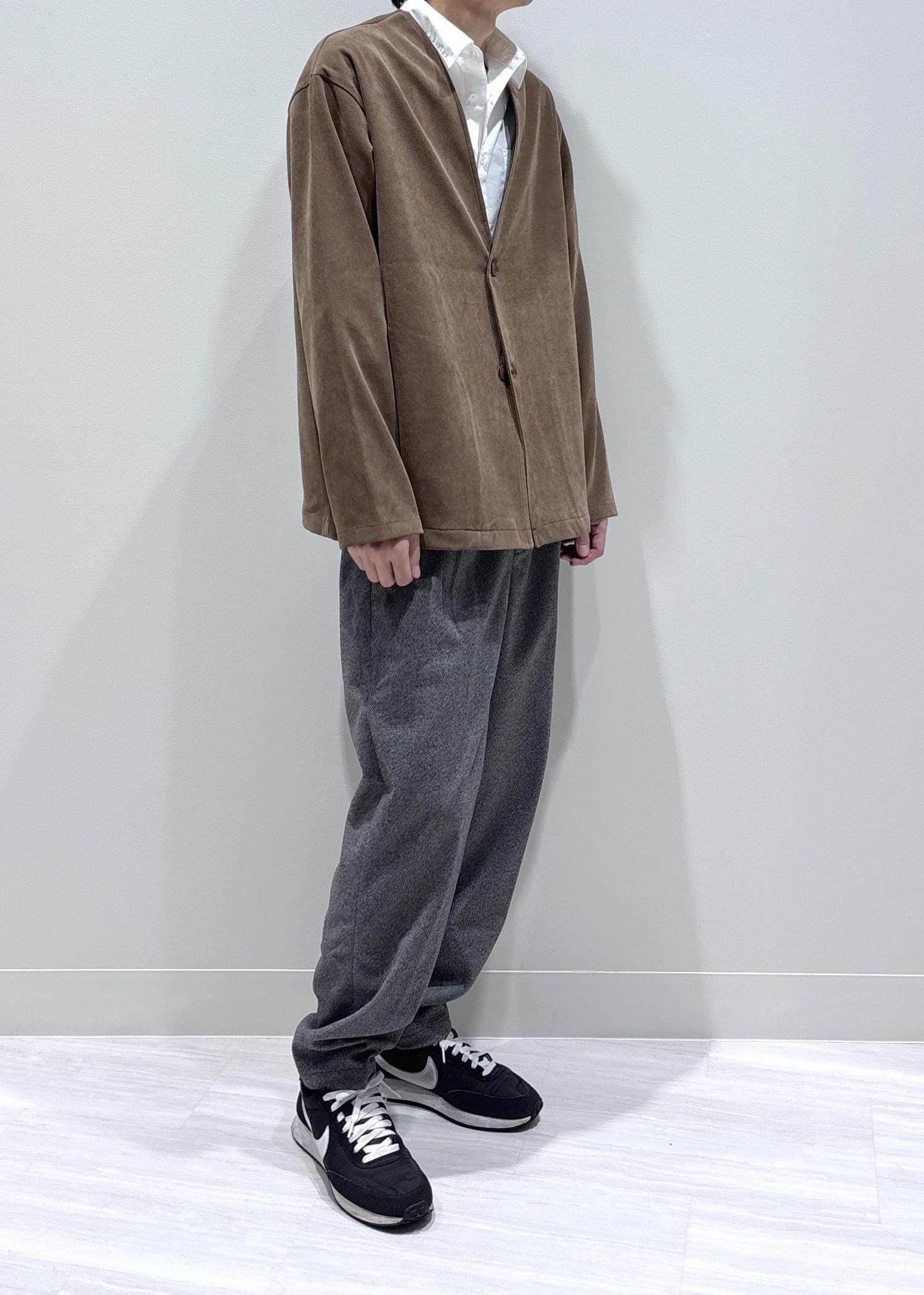 トップスはノーカラーカーディガンでインナーにはシャツやニットなど持ってくると相性良いです。