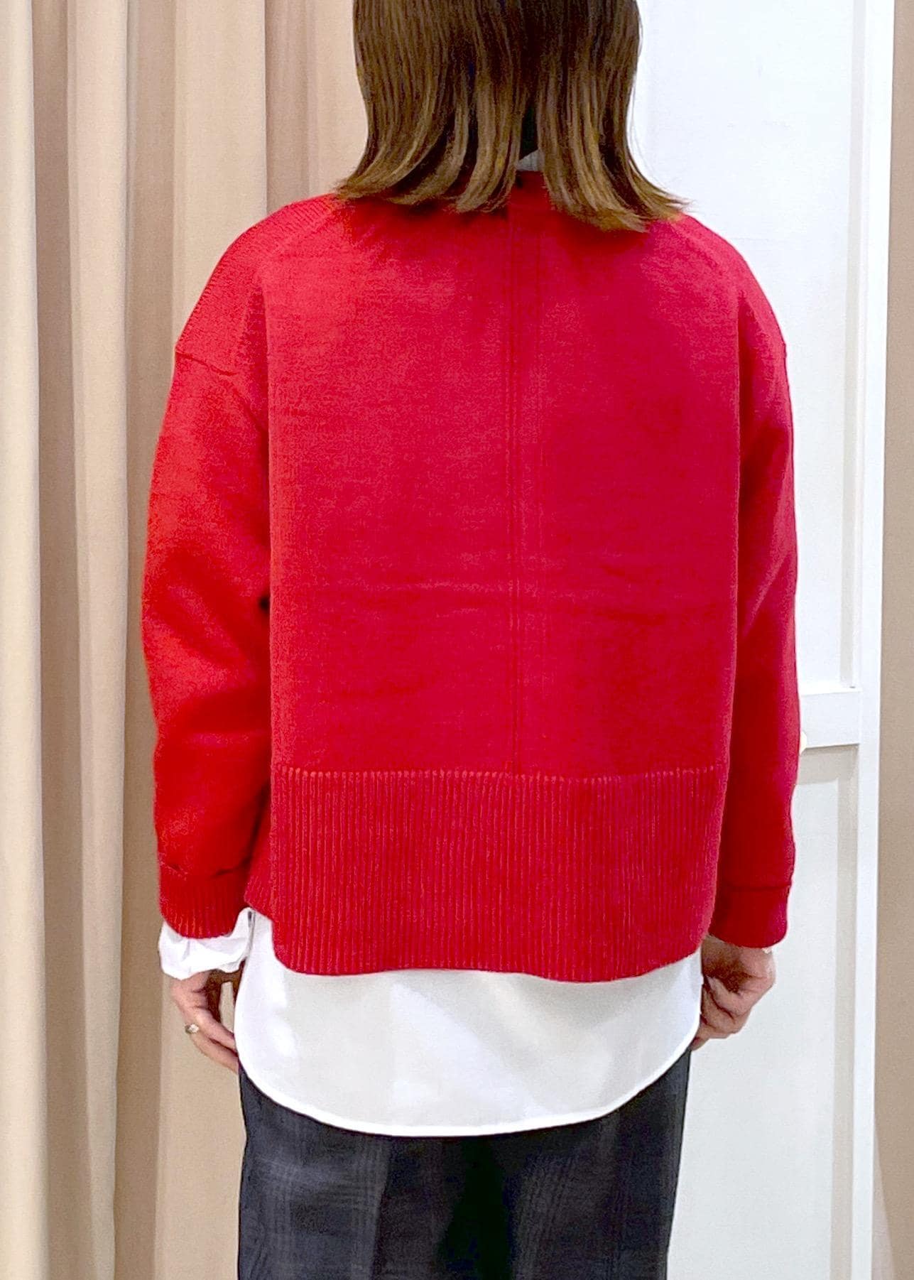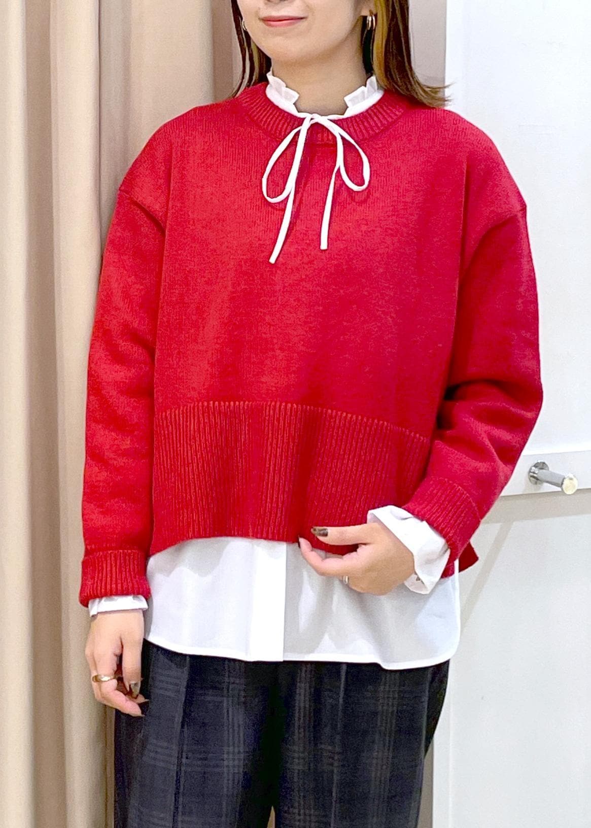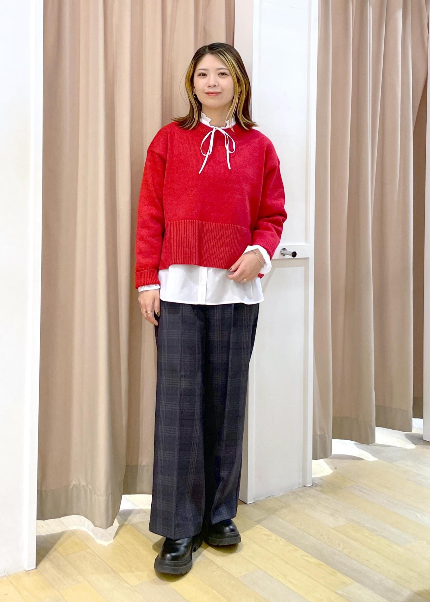 鮮やかな赤ニットに、フリルシャツを重ねた冬コーデです。